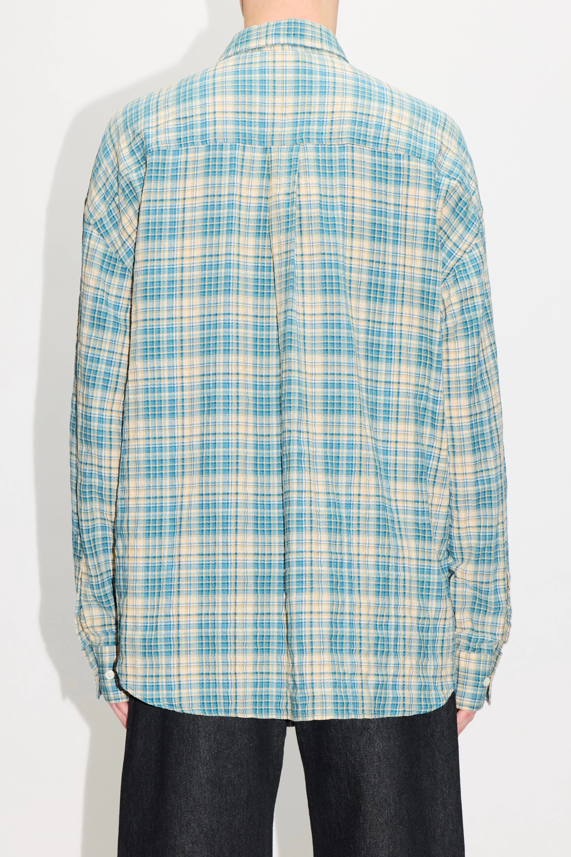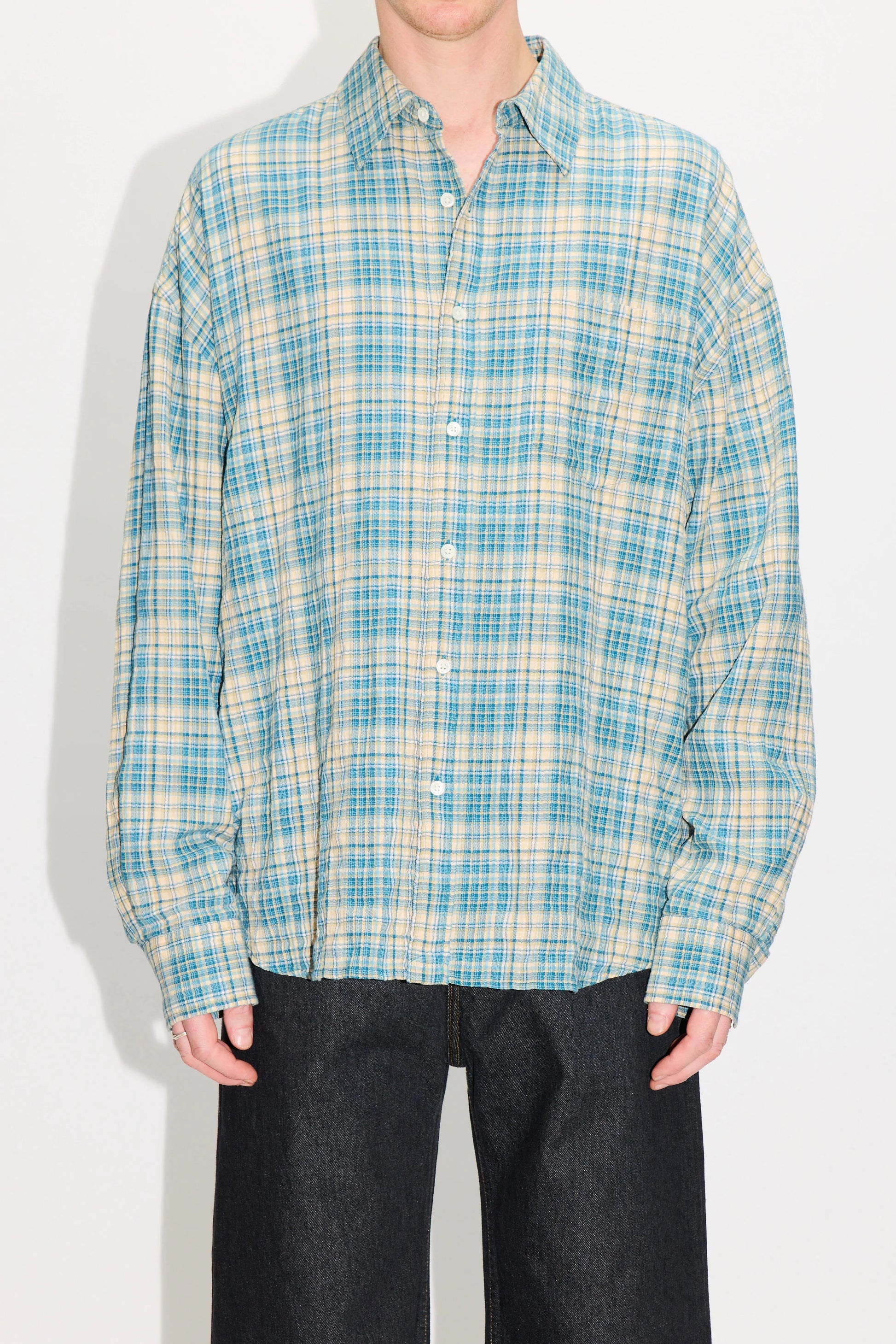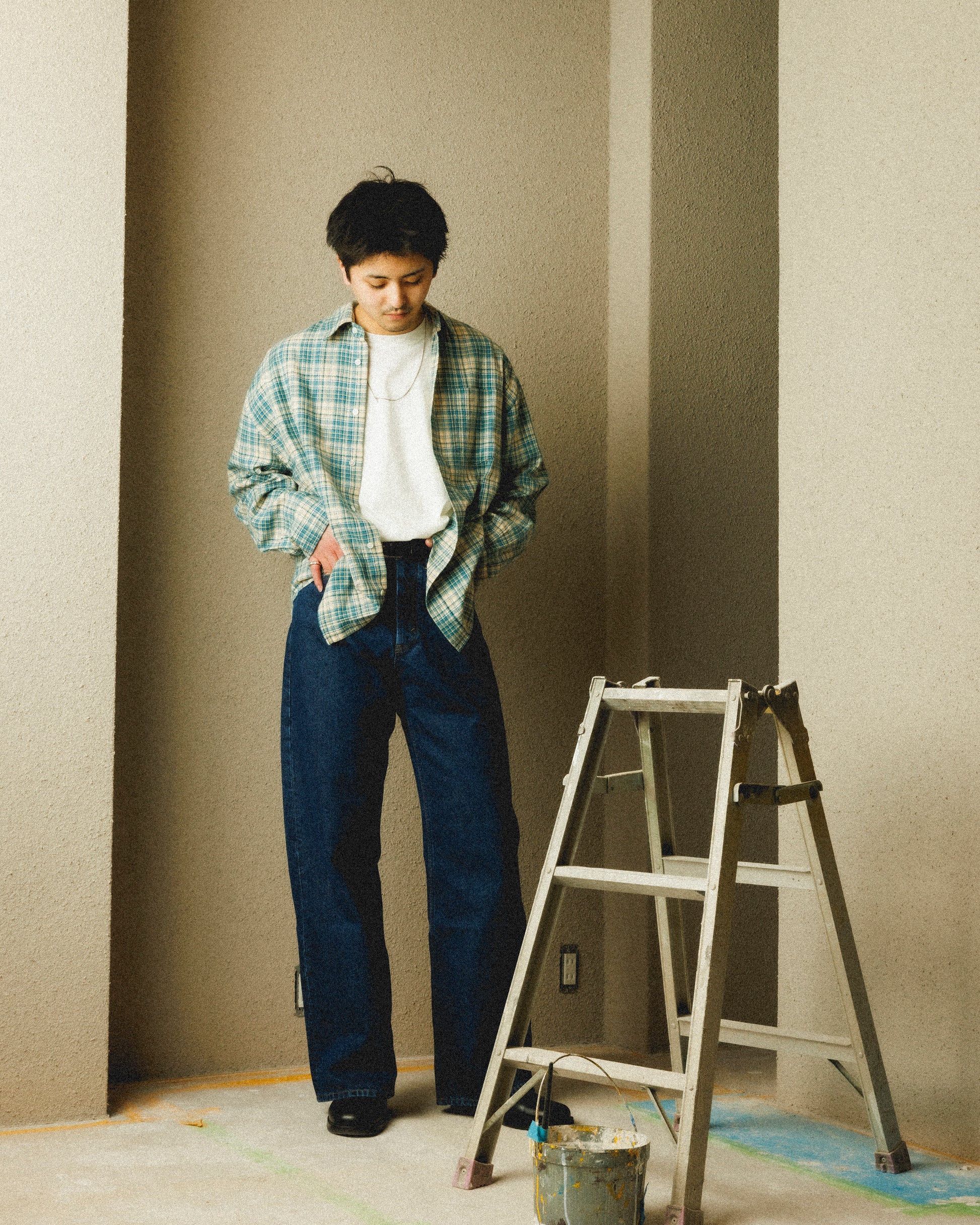 Room Shirtは、リラックス感のあるボクシーシルエットのシャツ。ドロップショルダーとカーブヘムが特徴です。ディテールには、マザーオブパールのボタンと調節可能なカフクロージャーを採用。こちらはシアサッカー加工を施したパステルグリーンのチェック柄です。