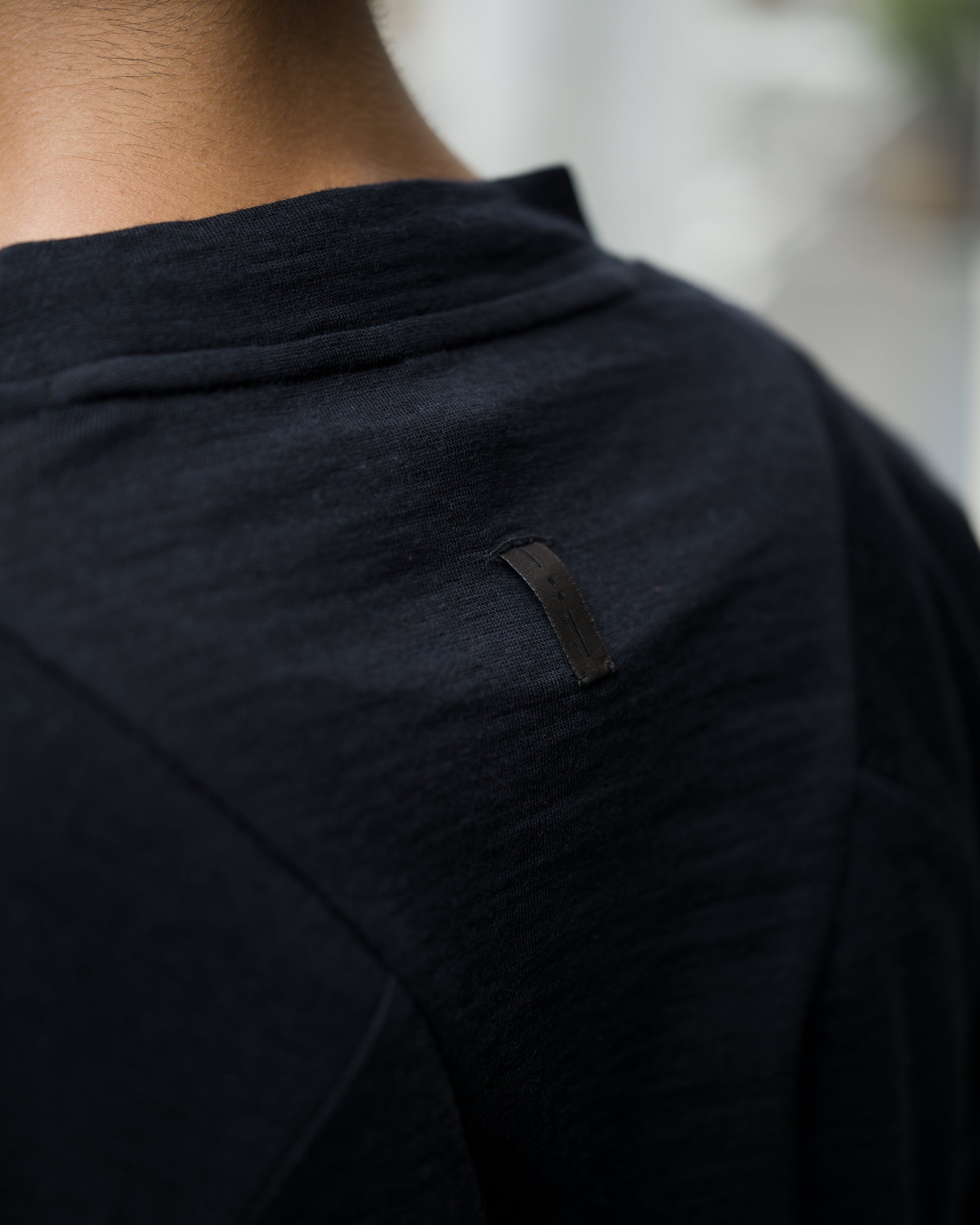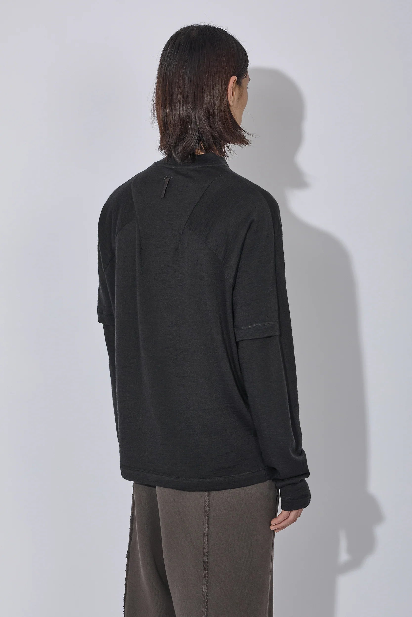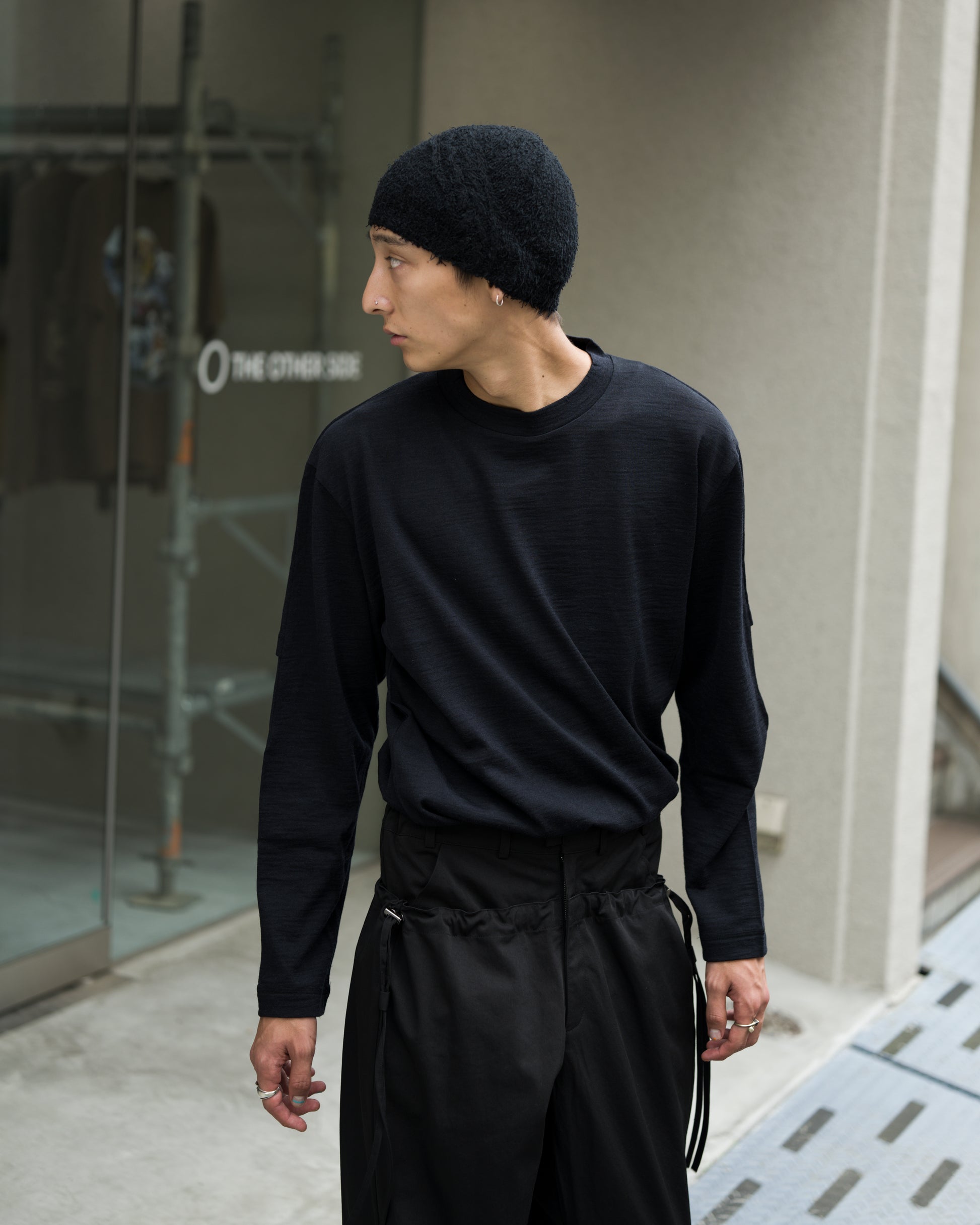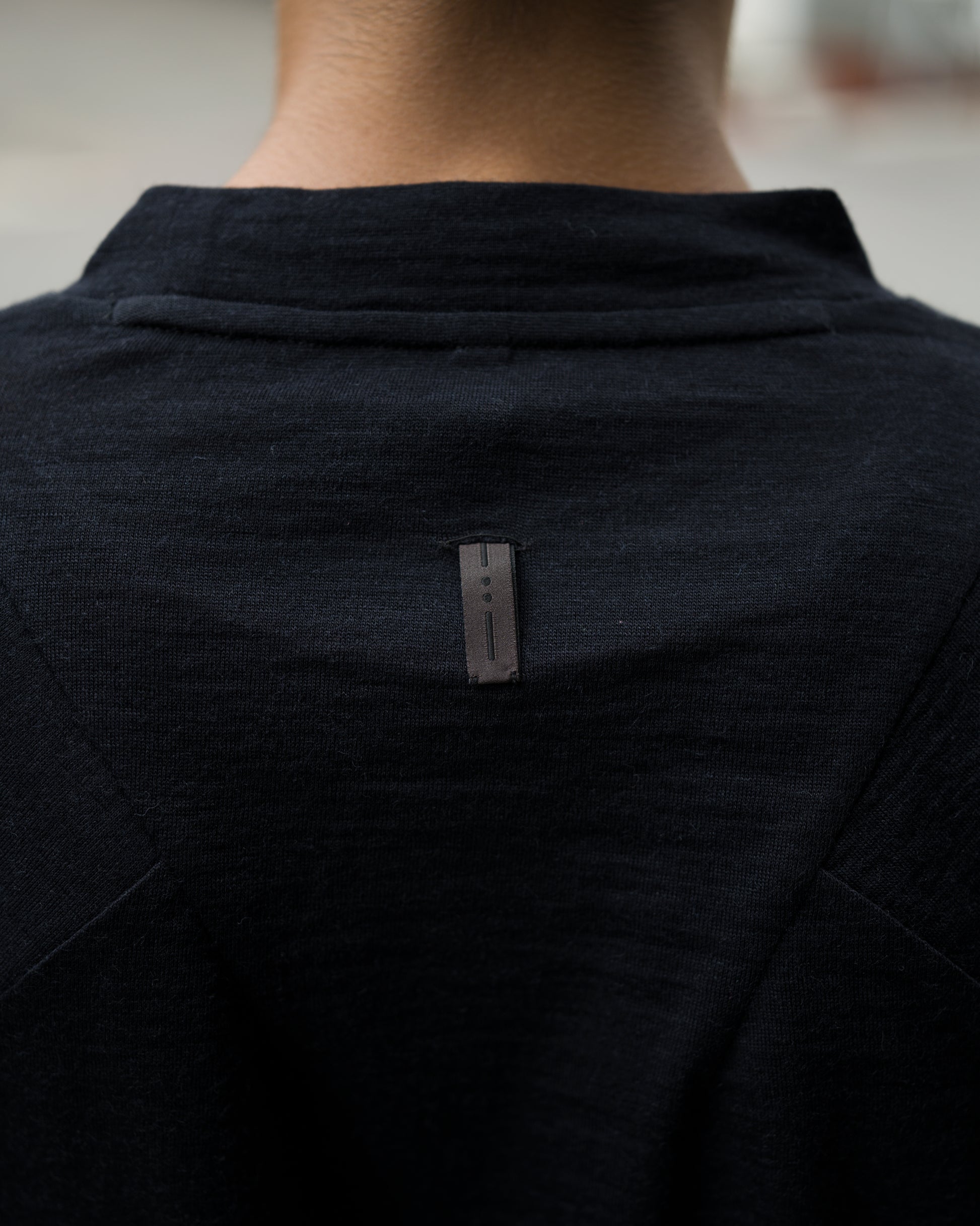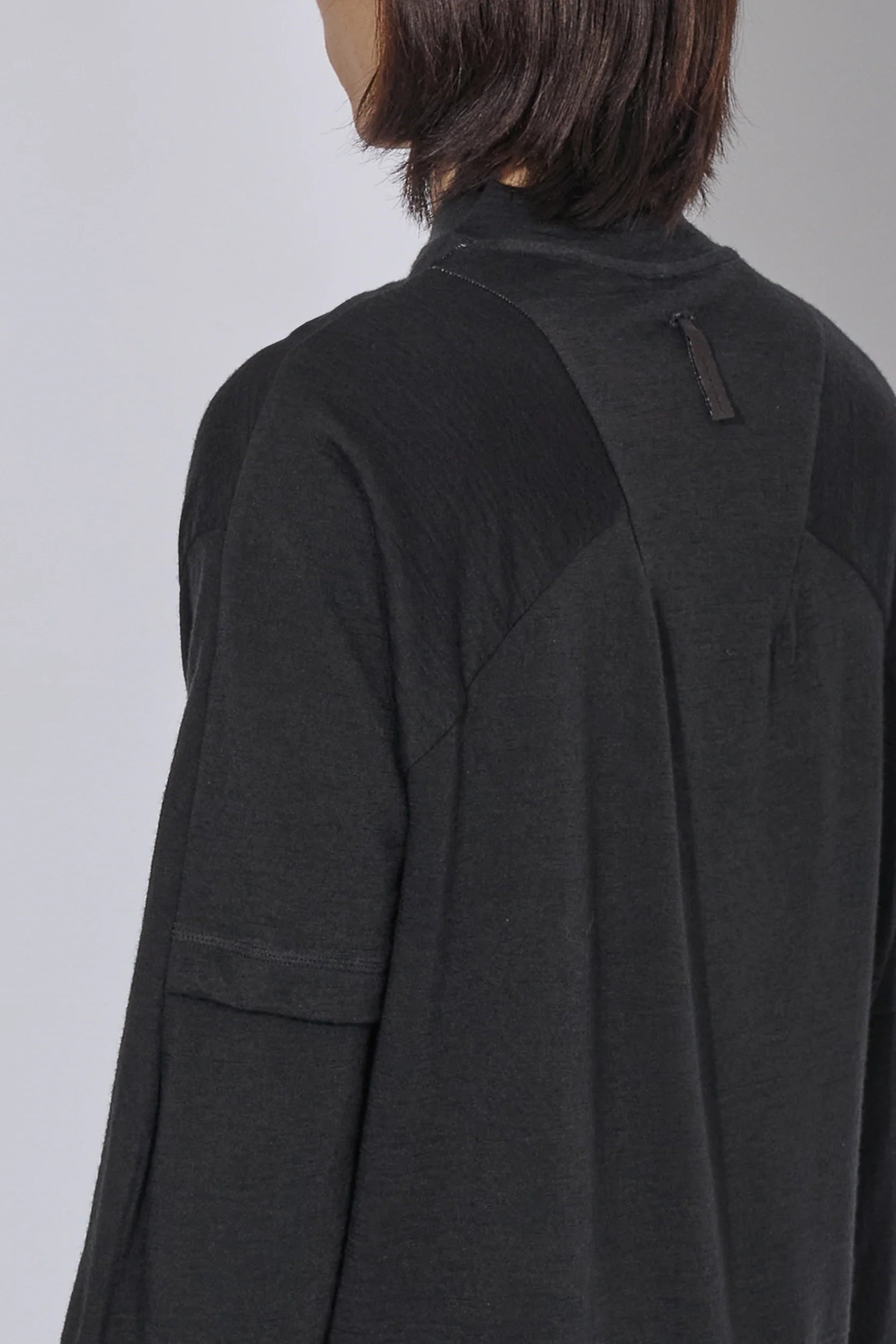 2枚仕立てのデザインで、後ろ姿は半袖の下に長袖を重ね着しているように見えるユニークな構造。軽量なウール×ナイロンブレンド素材を使用し、レイヤード風の美しいシルエットを演出することで、幅広い着こなしに対応できる一枚です。