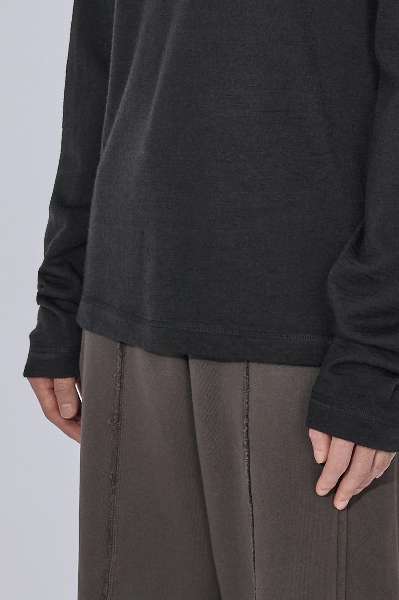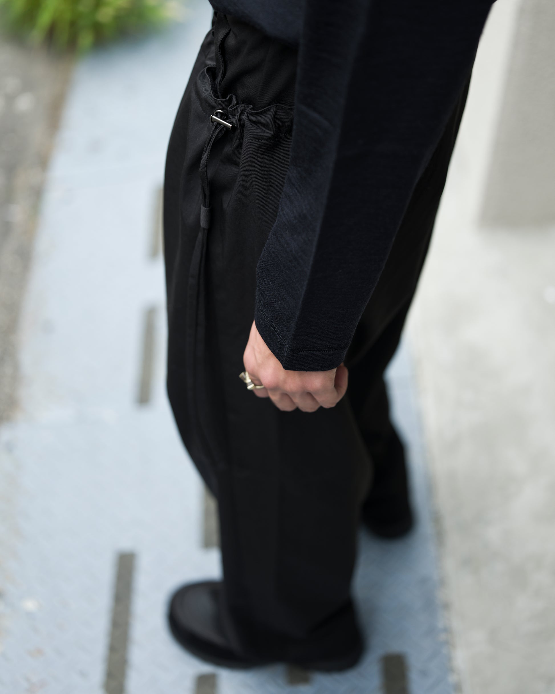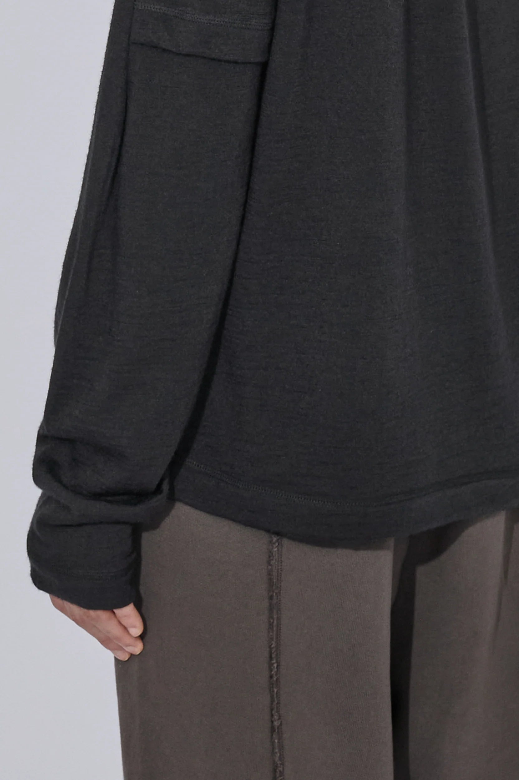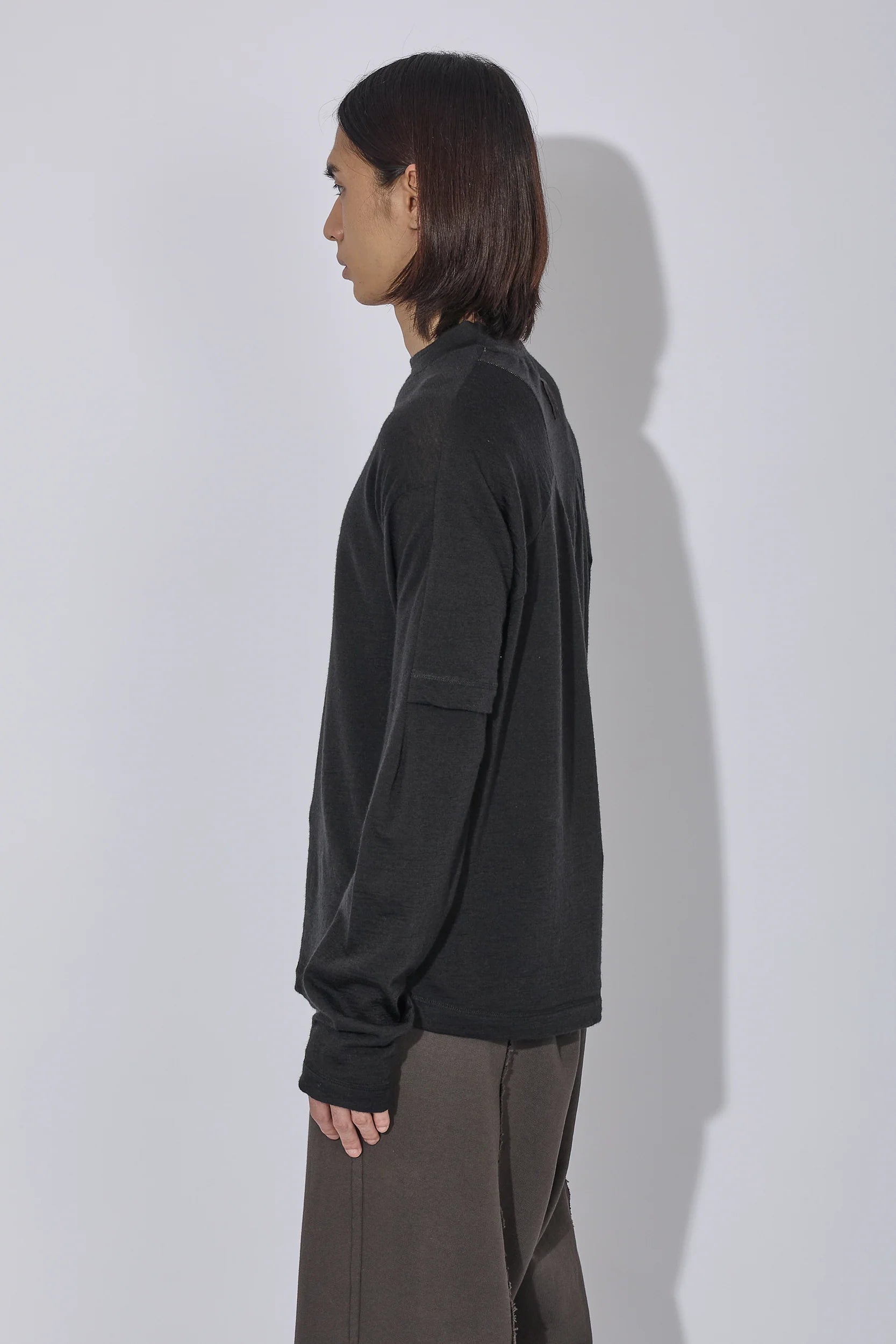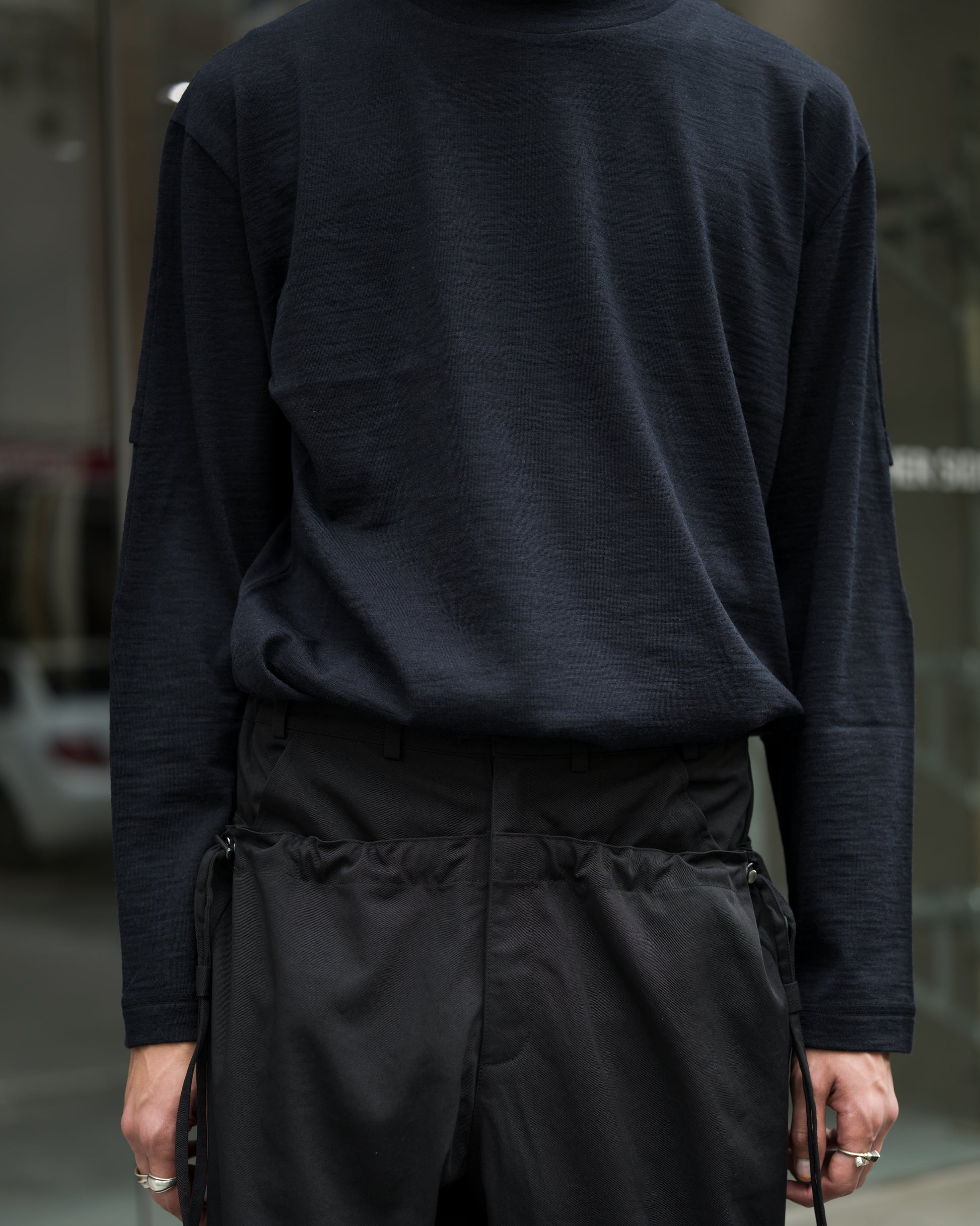 2枚仕立てのデザインで、後ろ姿は半袖の下に長袖を重ね着しているように見えるユニークな構造。軽量なウール×ナイロンブレンド素材を使用し、レイヤード風の美しいシルエットを演出することで、幅広い着こなしに対応できる一枚です。