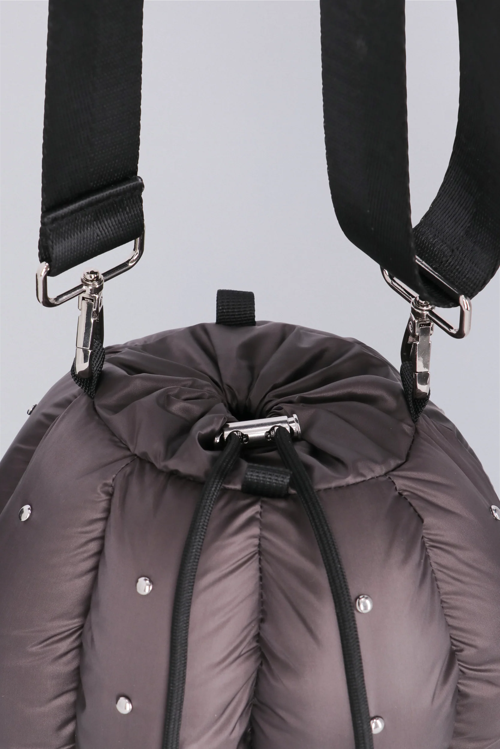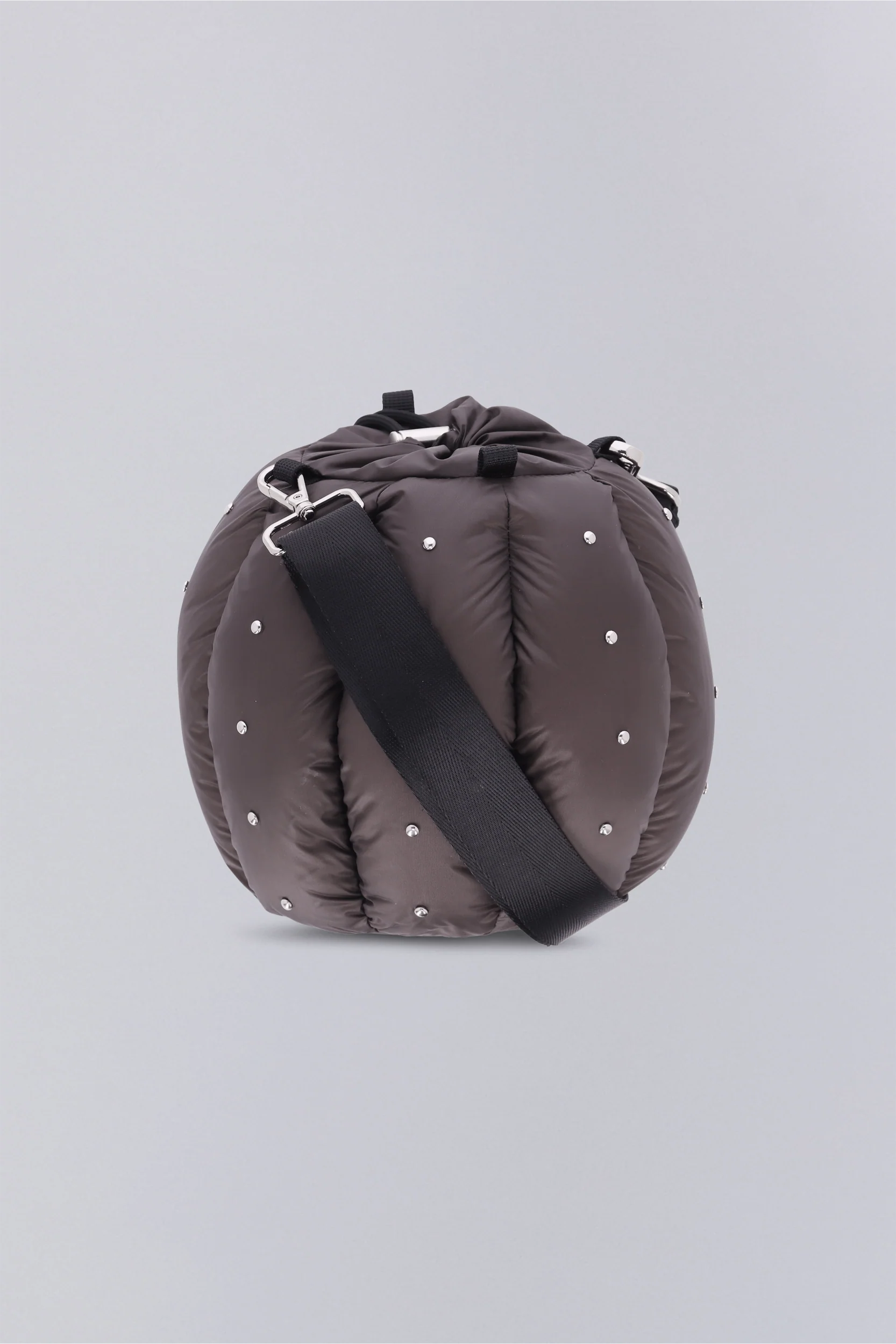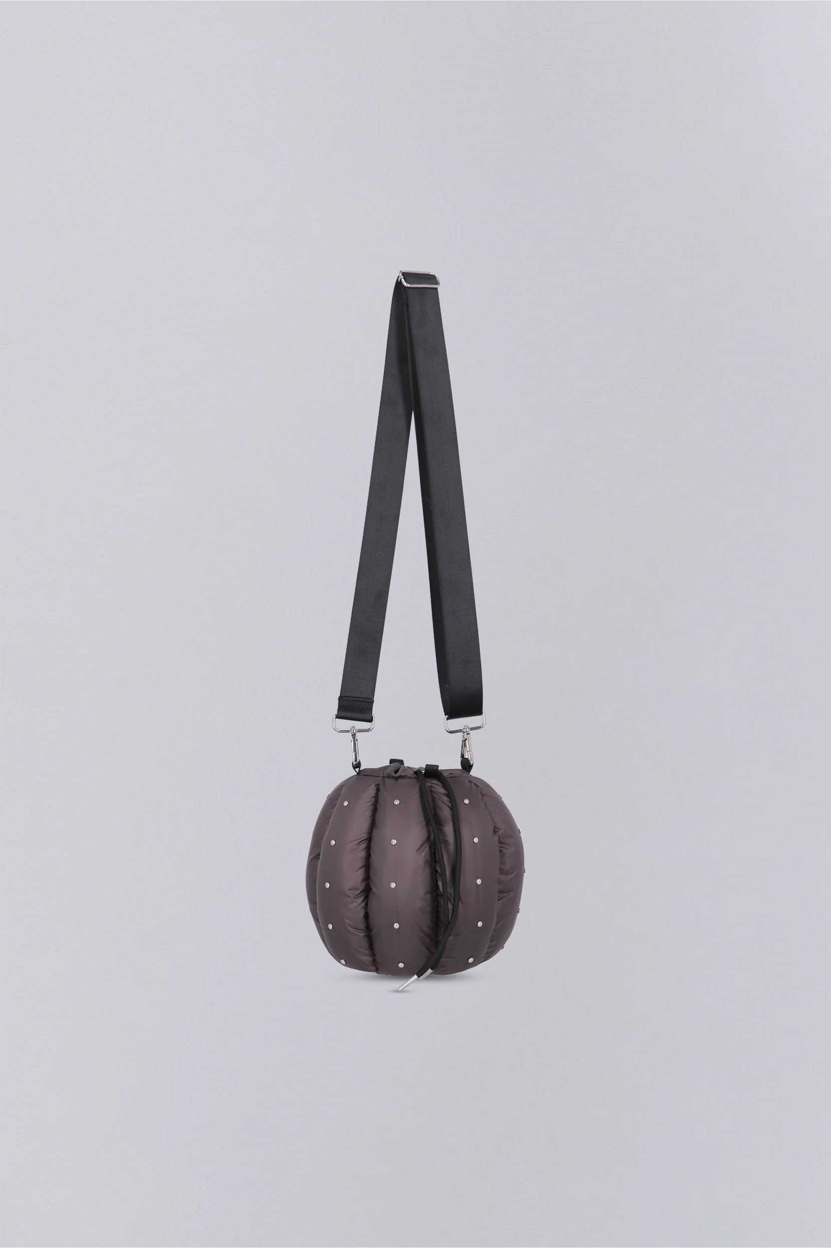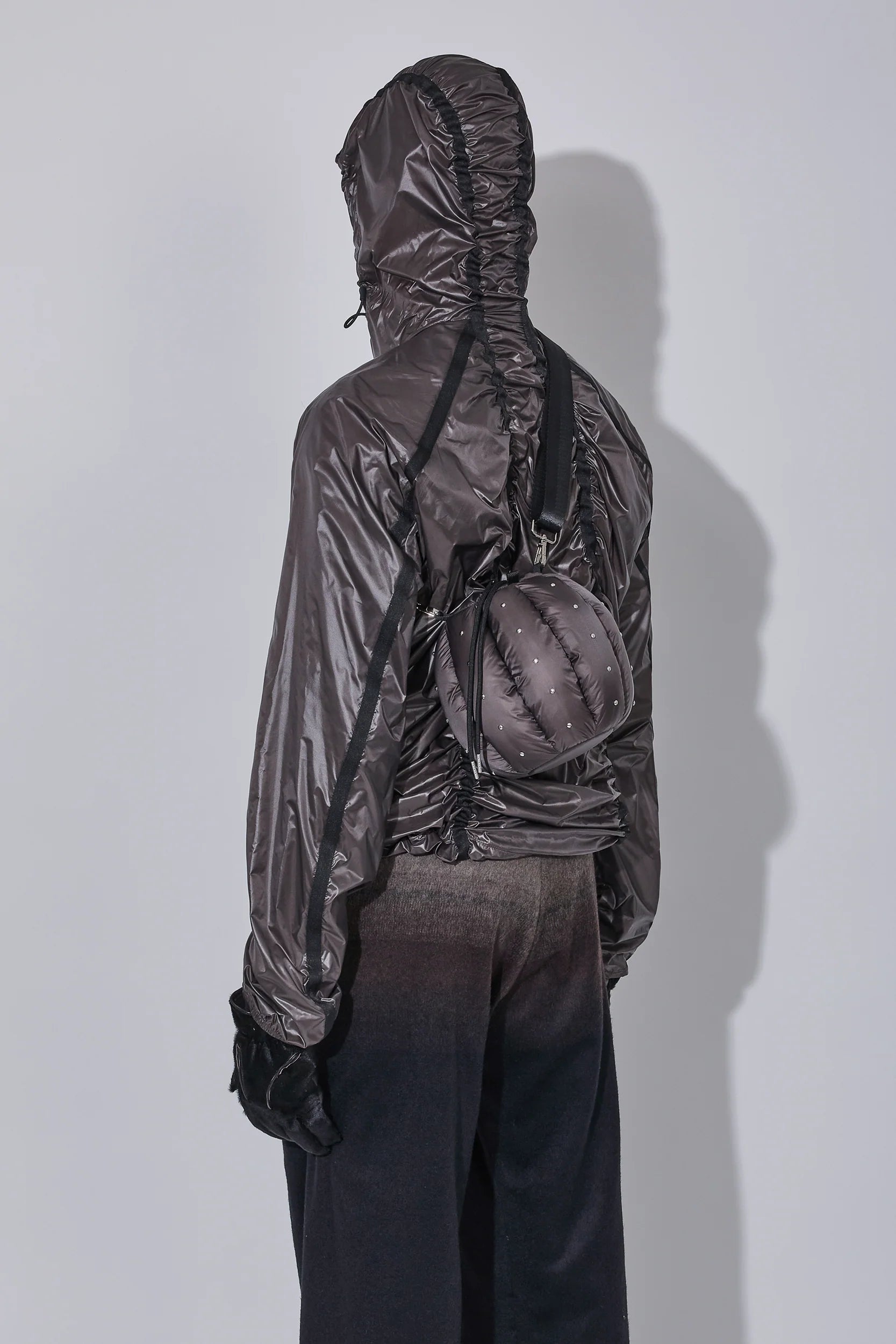ほどよい厚みで柔らかくふんわりとしたメランジ調生地を使用。ウニの殻の有機的なフォルムから着想を得ています。取り外し可能なストラップやメタルスタッド、ドローストリング開口部を備え、使いやすさとデザイン性を両立したバッグです。