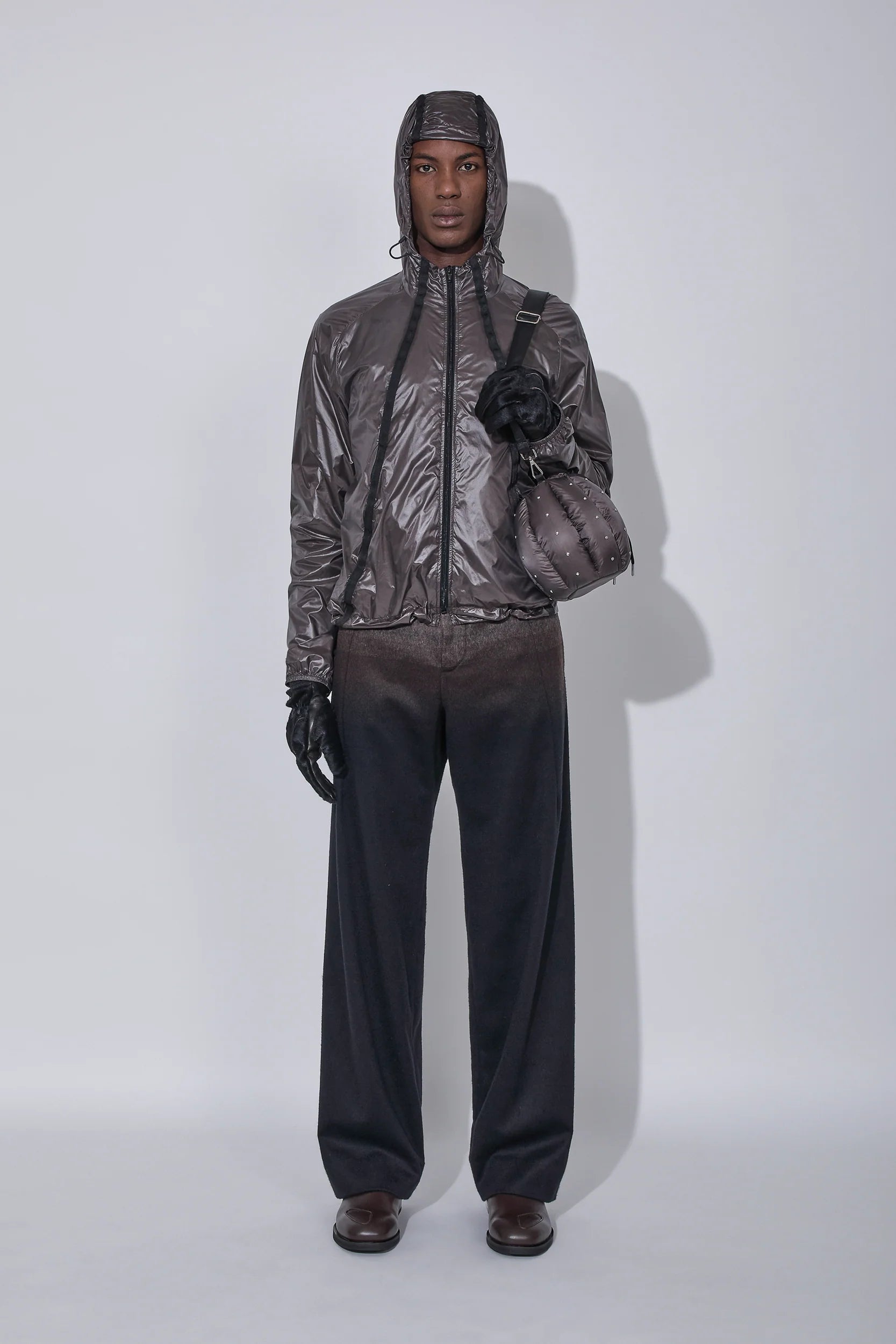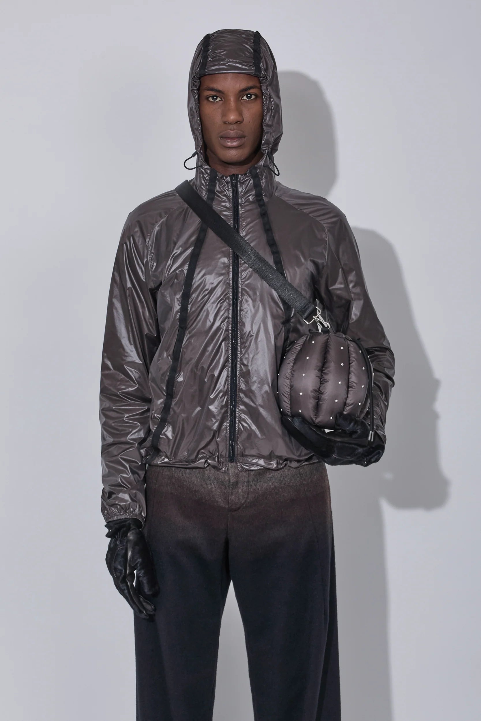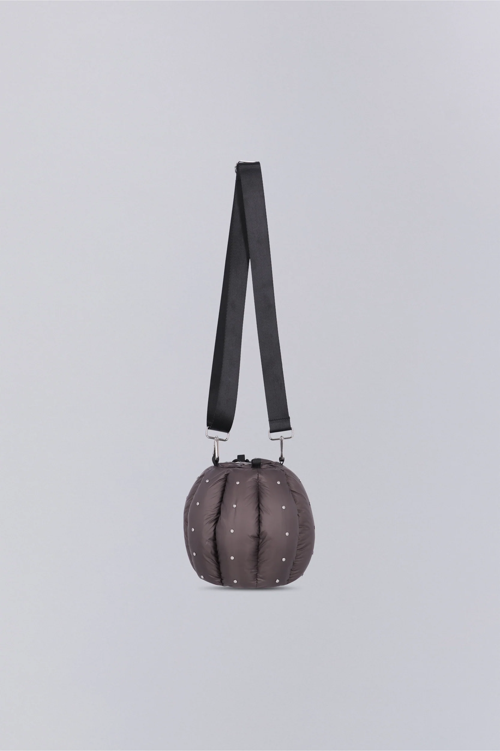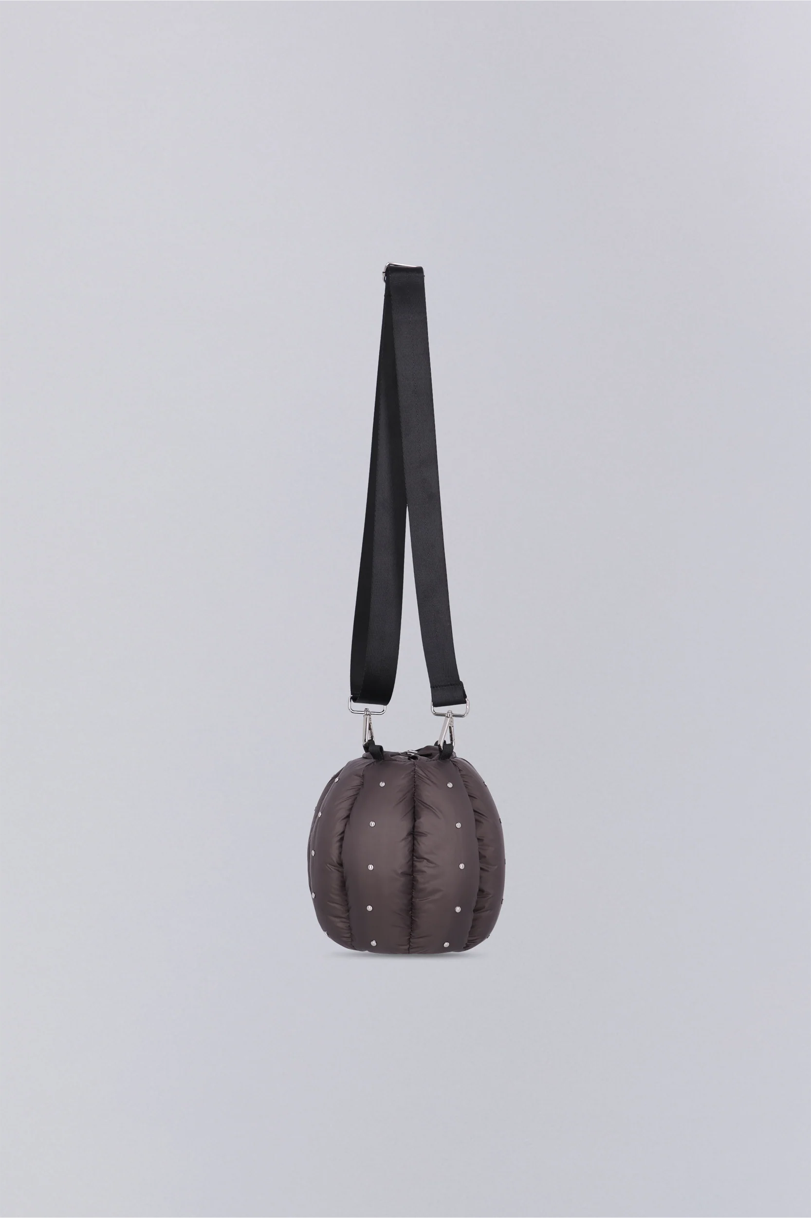 ほどよい厚みで柔らかくふんわりとしたメランジ調生地を使用。ウニの殻の有機的なフォルムから着想を得ています。取り外し可能なストラップやメタルスタッド、ドローストリング開口部を備え、使いやすさとデザイン性を両立したバッグです。