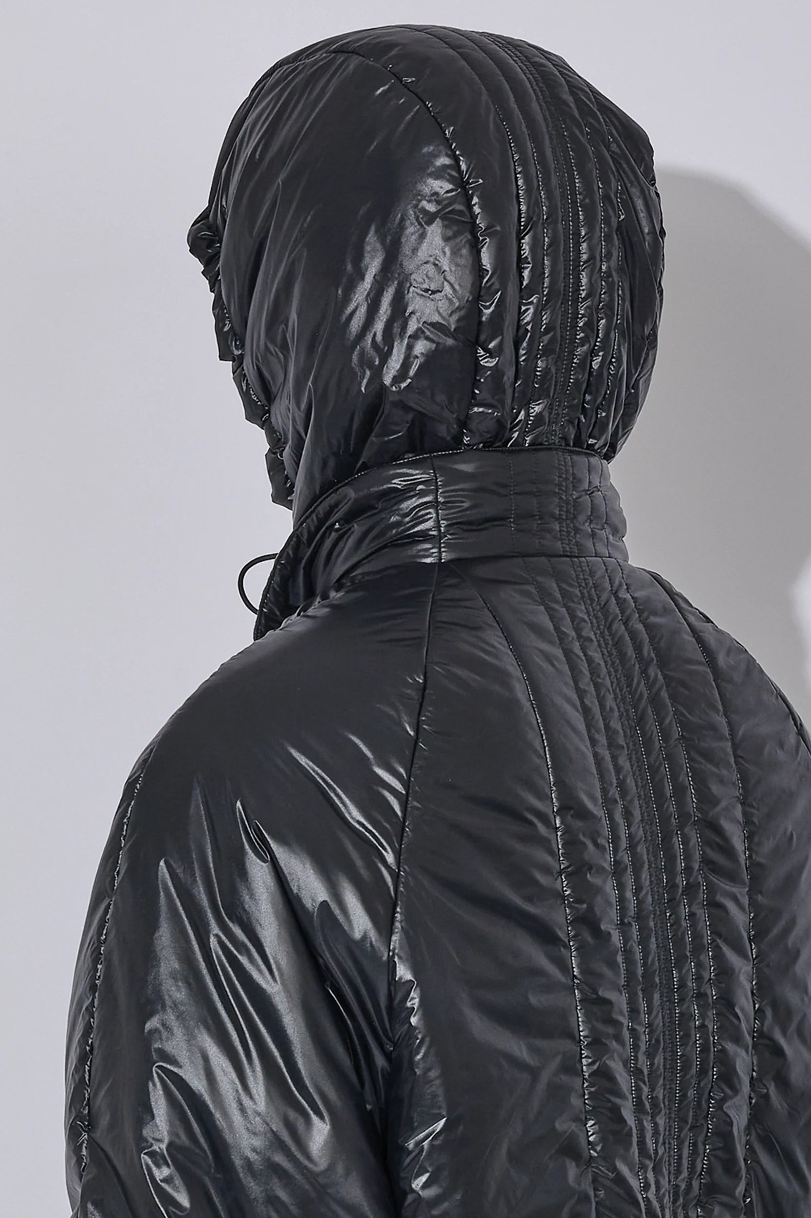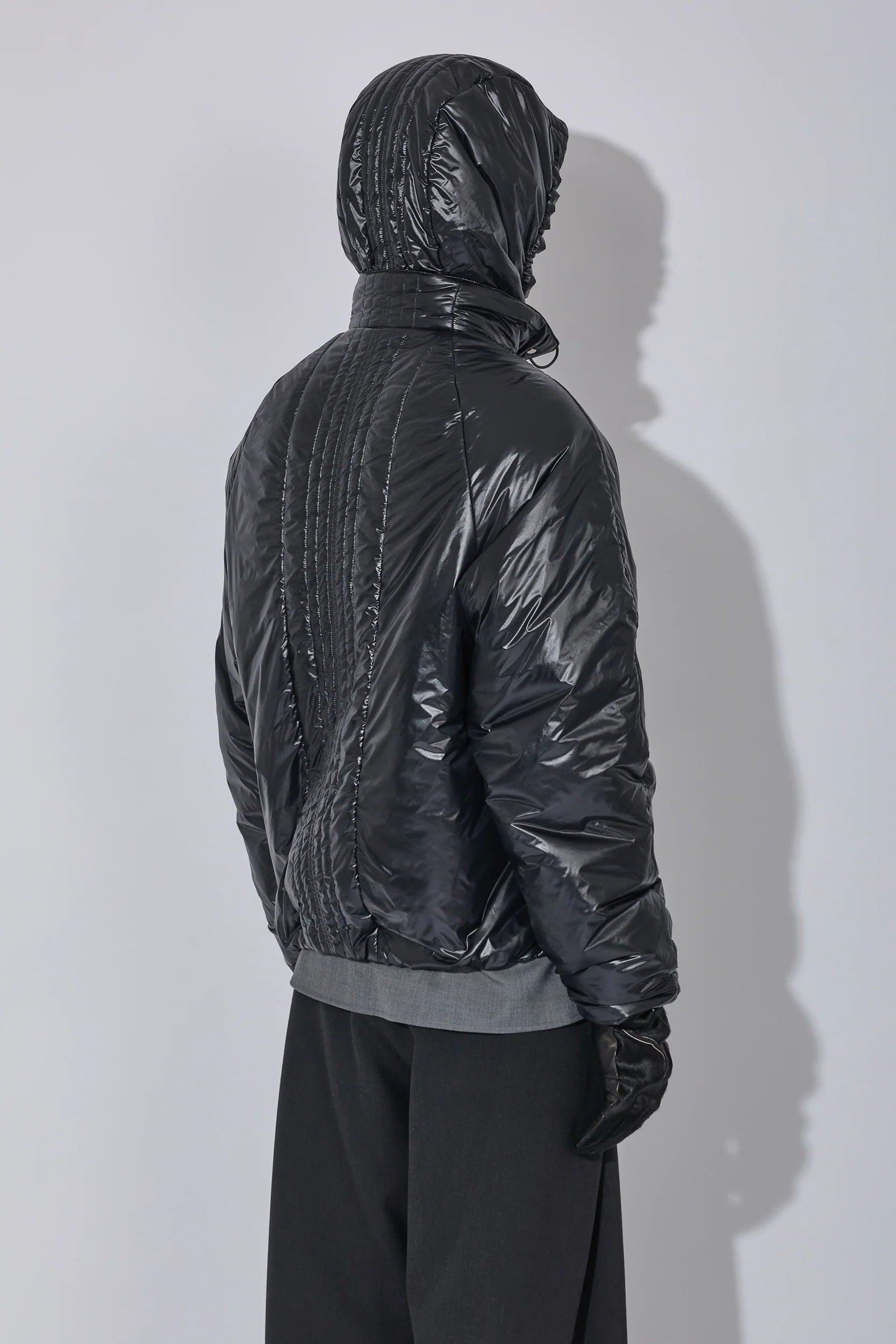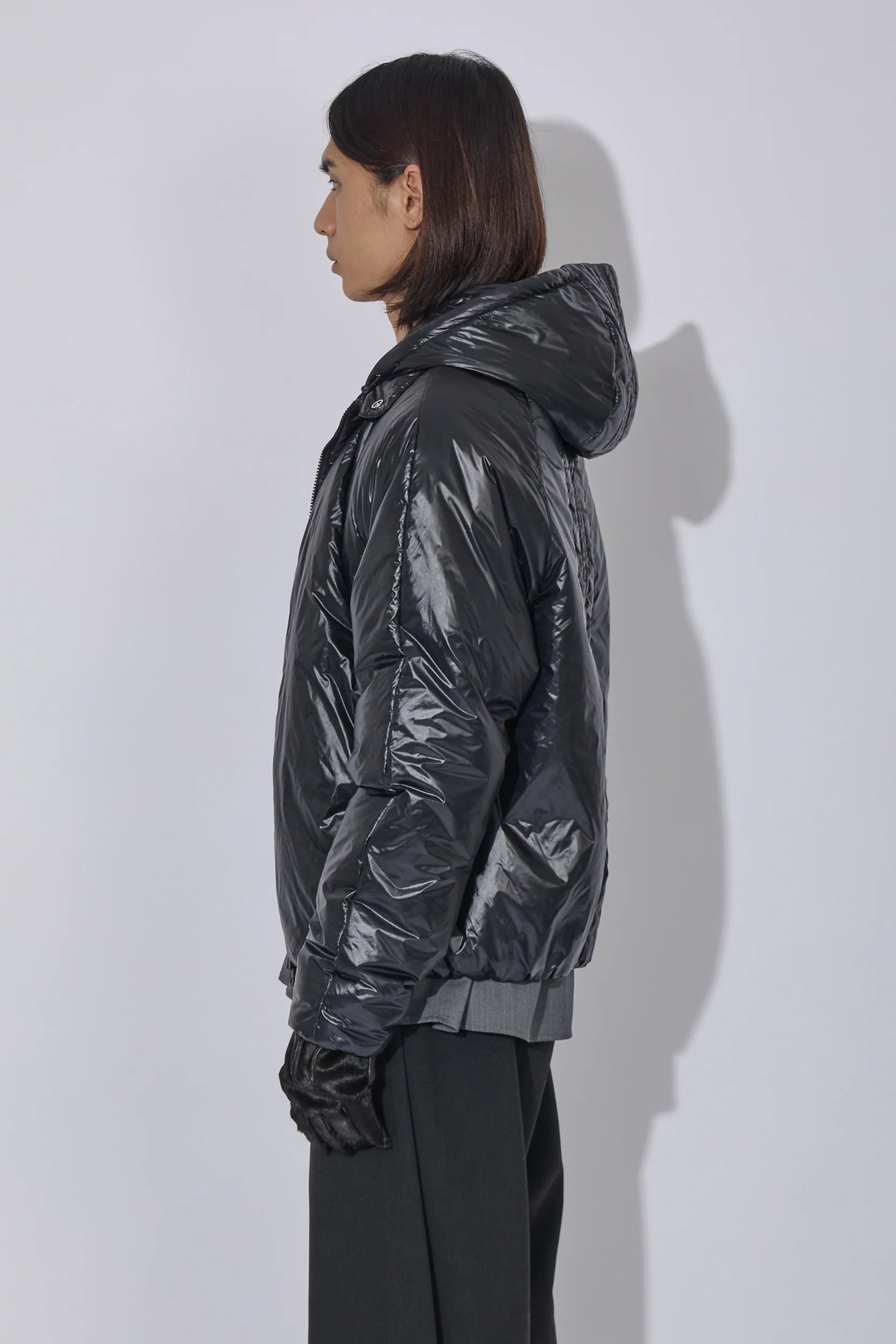 軽量ナイロンに中わたを入れ、保温性とすっきりしたシルエットを両立したジャケット。二重構造のフロントデザインで、内側にベスト風の前立てを備えたデザイン。フード口はゴム仕様で、フィット感を自在に調整できます。