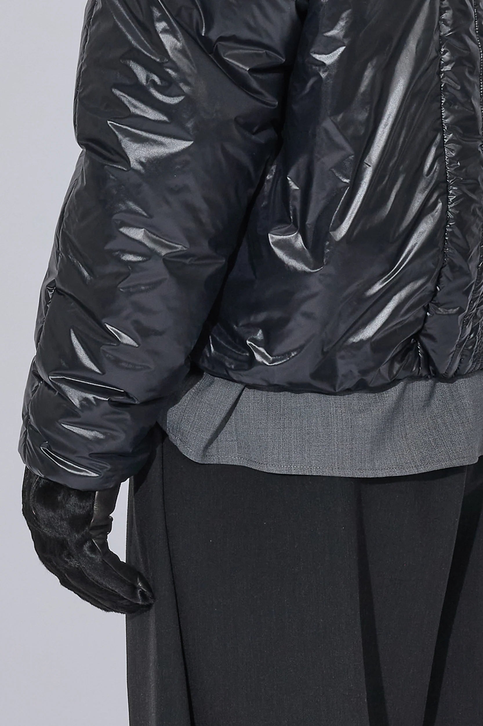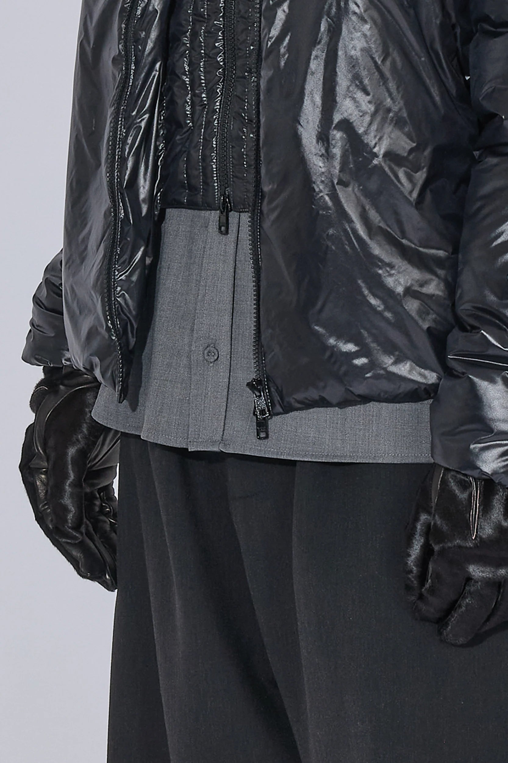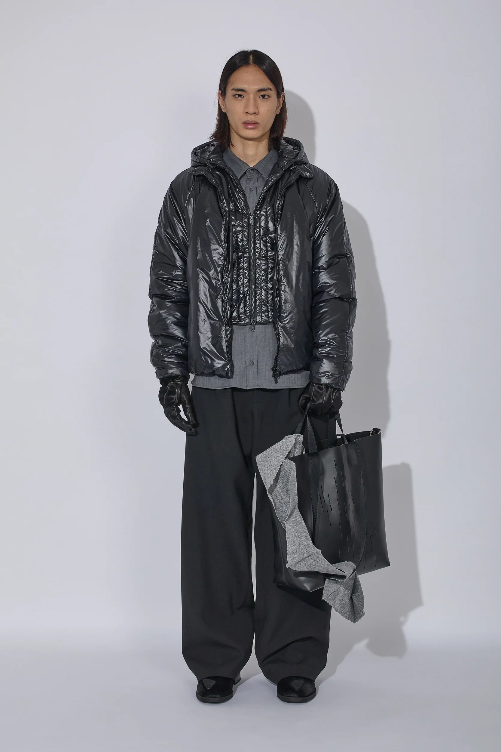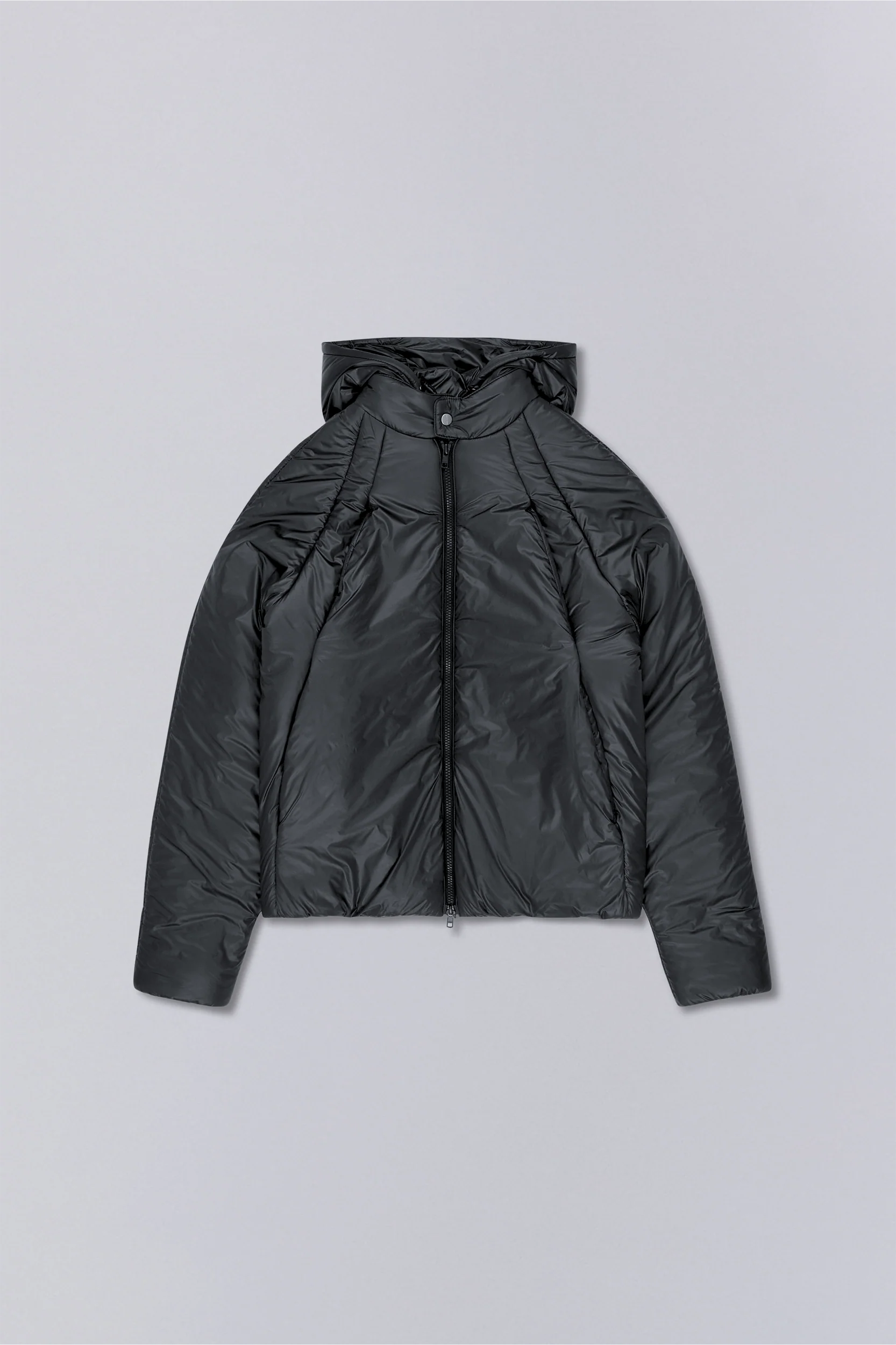 軽量ナイロンに中わたを入れ、保温性とすっきりしたシルエットを両立したジャケット。二重構造のフロントデザインで、内側にベスト風の前立てを備えたデザイン。フード口はゴム仕様で、フィット感を自在に調整できます。
