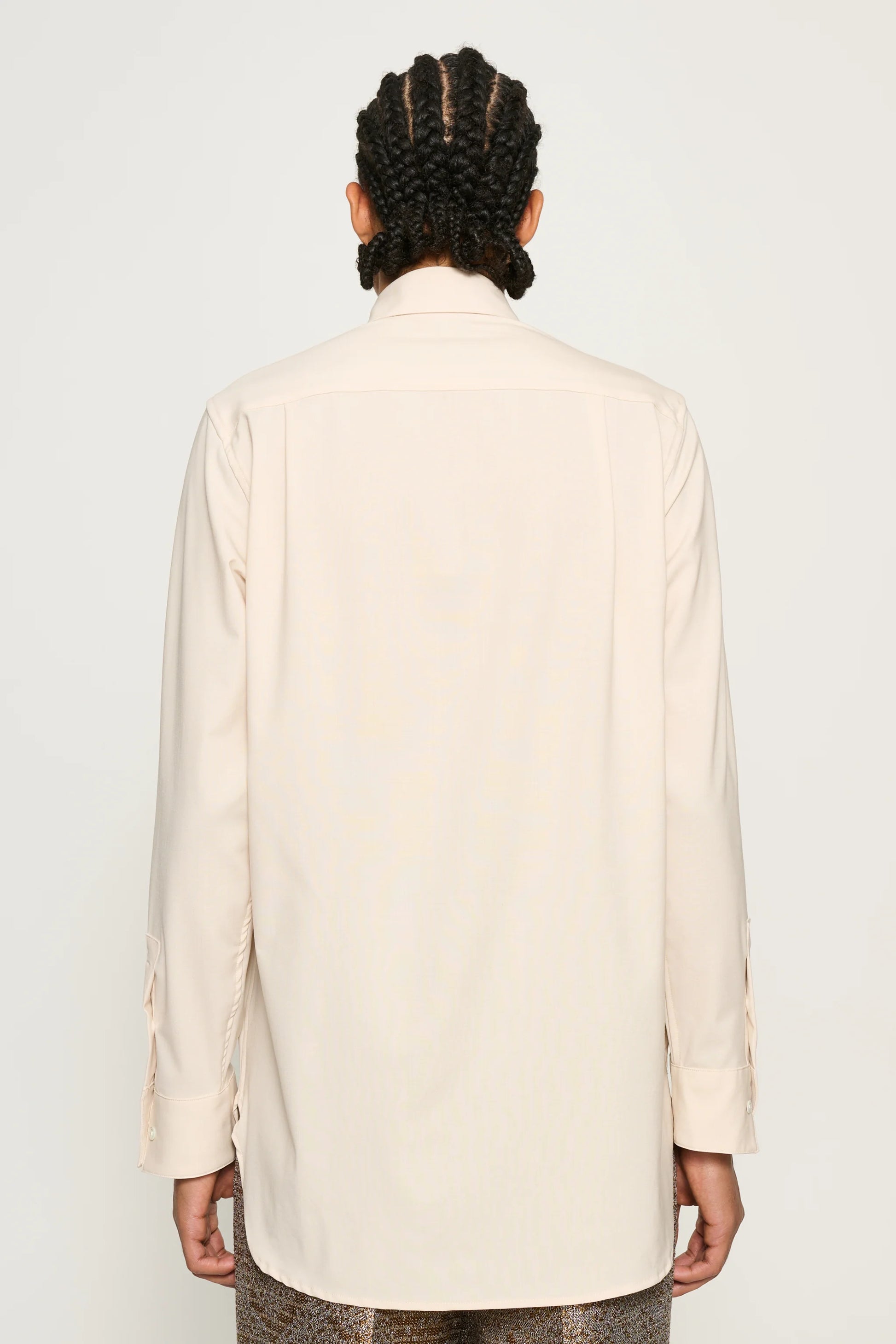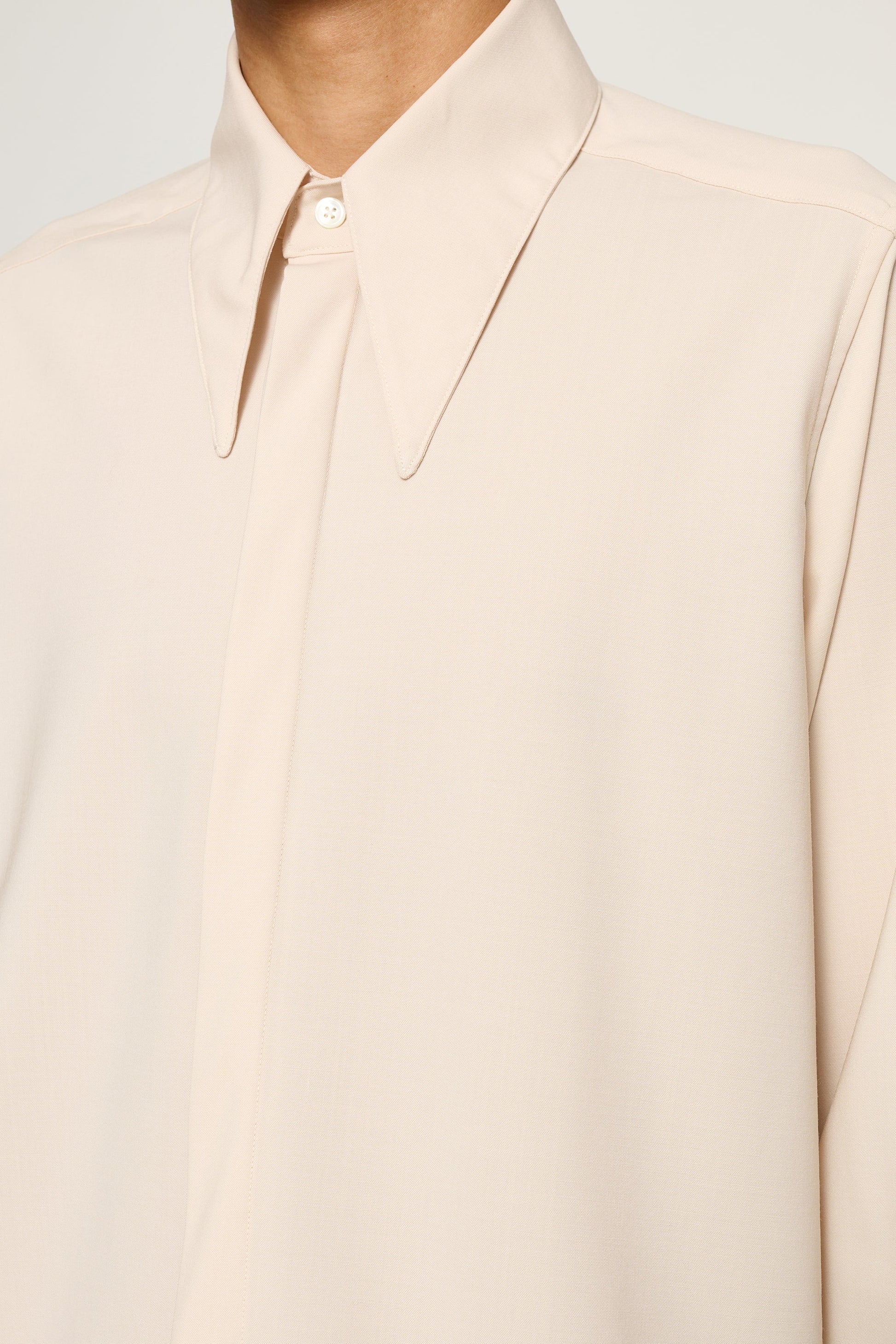 シャープなポインテッドカラーと流れるようなロングラインシルエットが特徴のシャツ。ワイドカフスと隠しボタンのフロントが、洗練された表情を演出します。軽やかなイタリアンウールを使用し、上質な着心地を実現。