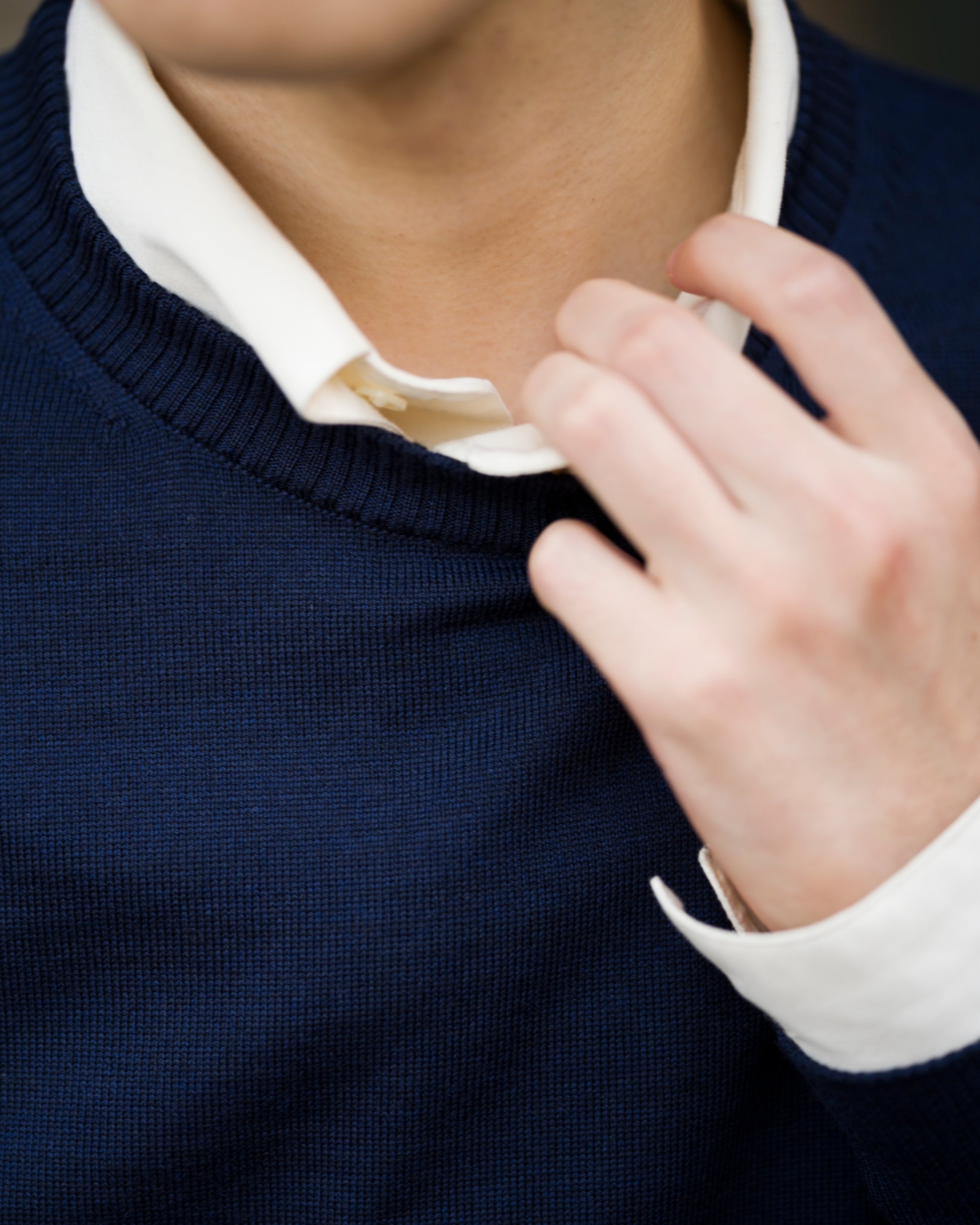 スウェットシャツから着想を得た、クラシックなクルーネックセーターです。細かい編み目で仕立てられており、上質なエクストラファインメリノウールを使用しています。