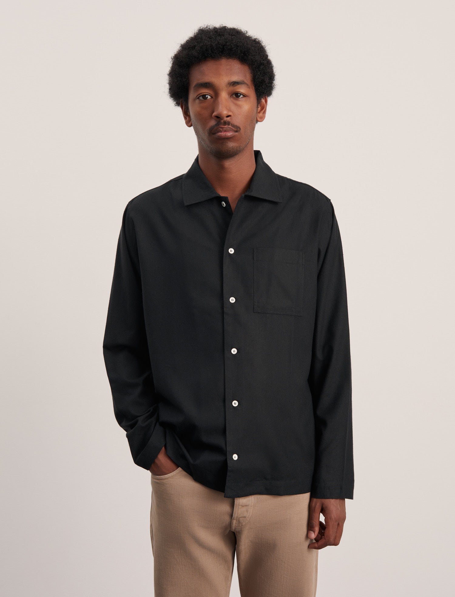 ヘミングウェイが愛したキューバの空気感と、日常に寄り添うリラックスフィットのシャツ。カフスにも襟にもボタンをつけず、あえてシンプルに仕上げました。柔らかな生絹(シルク)の素材感をそのまま楽しんでほしい——そんな想いを込めた一枚です。