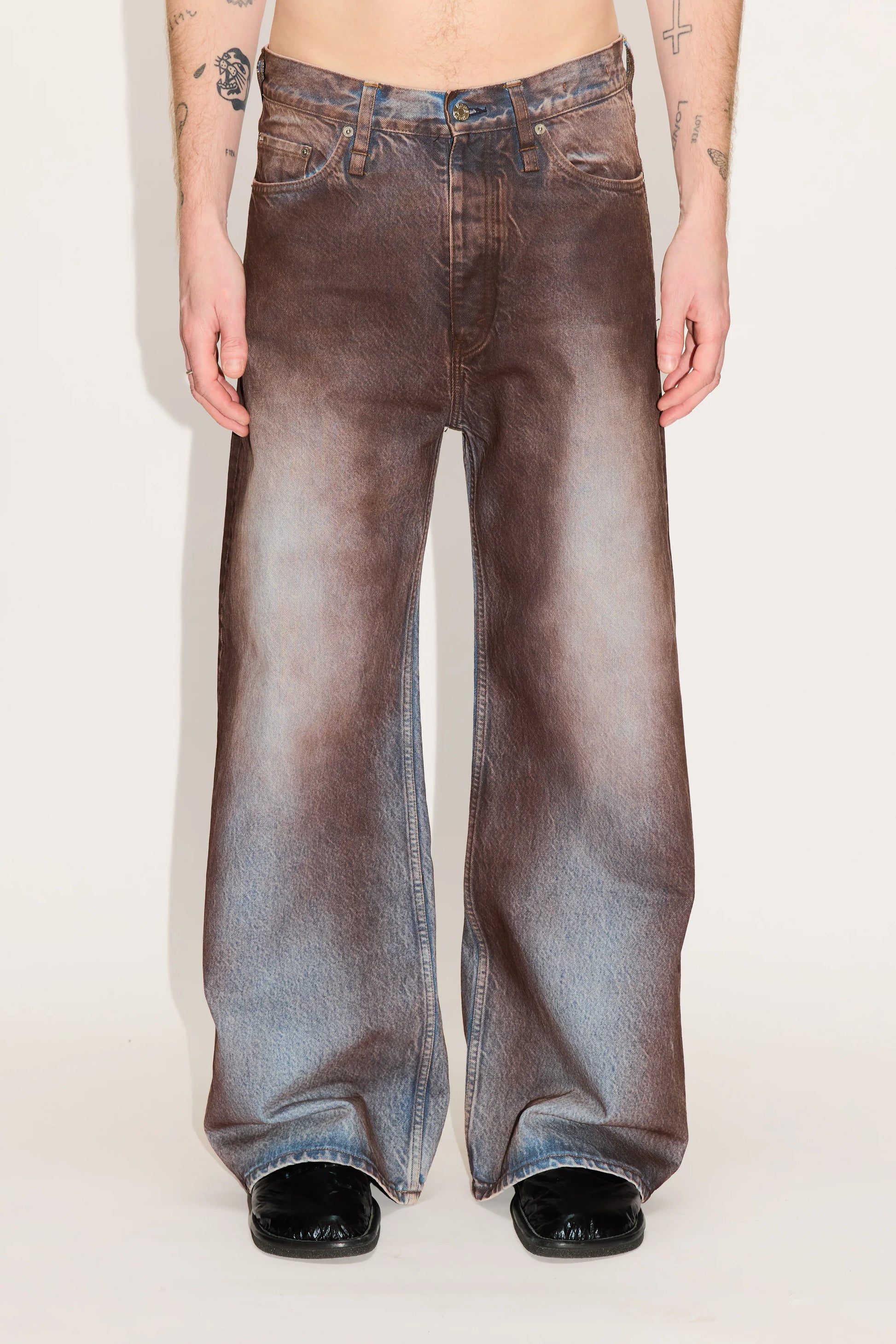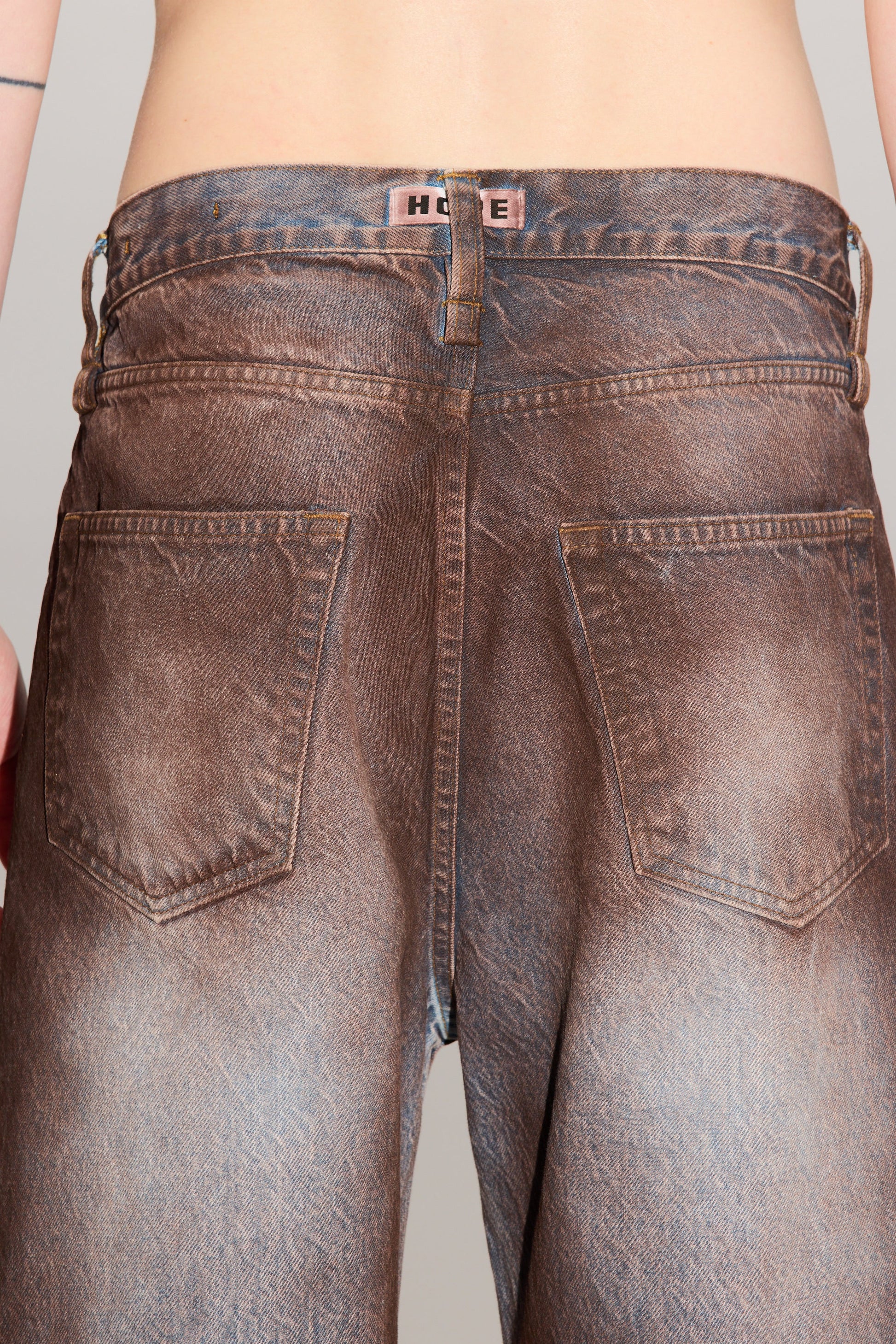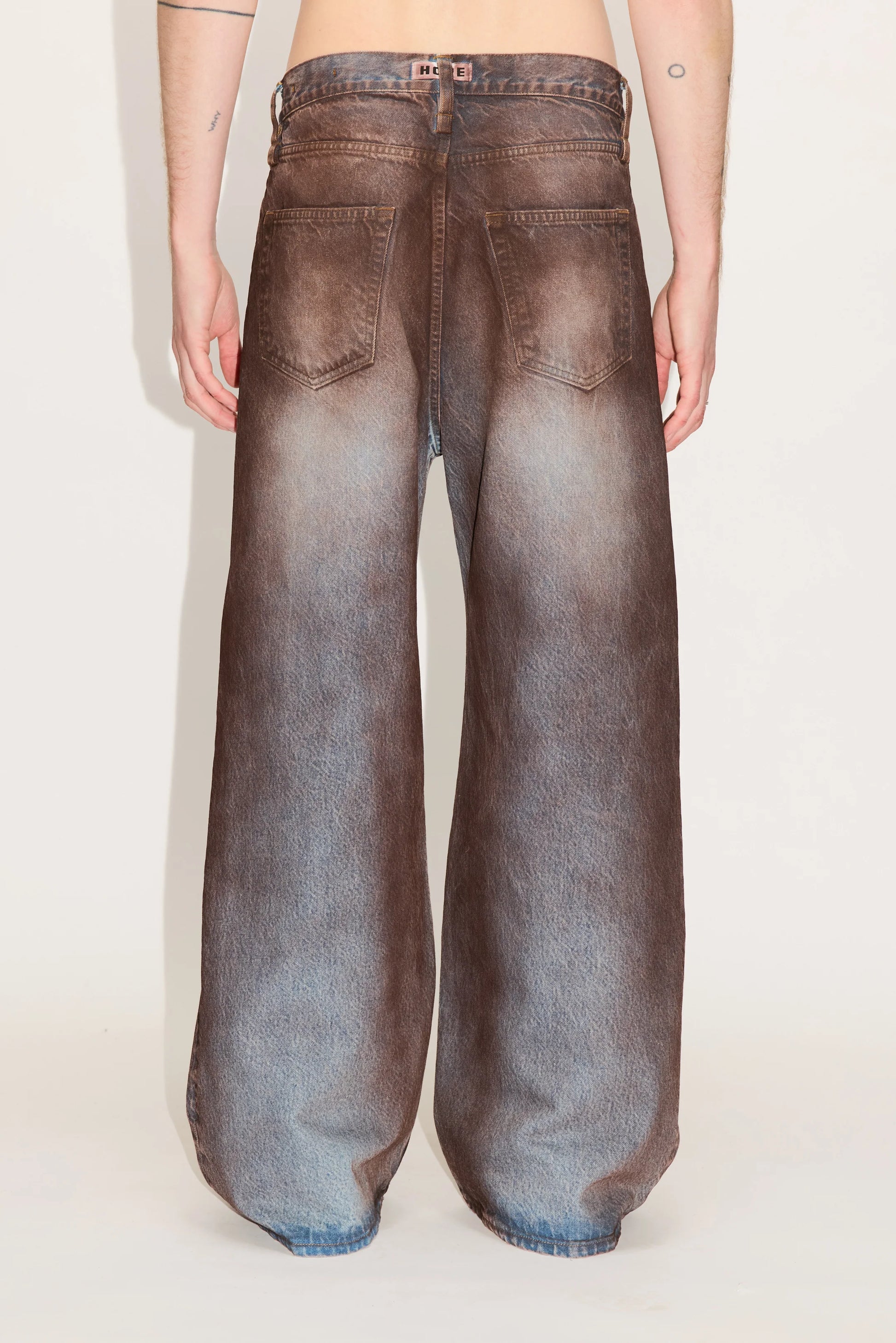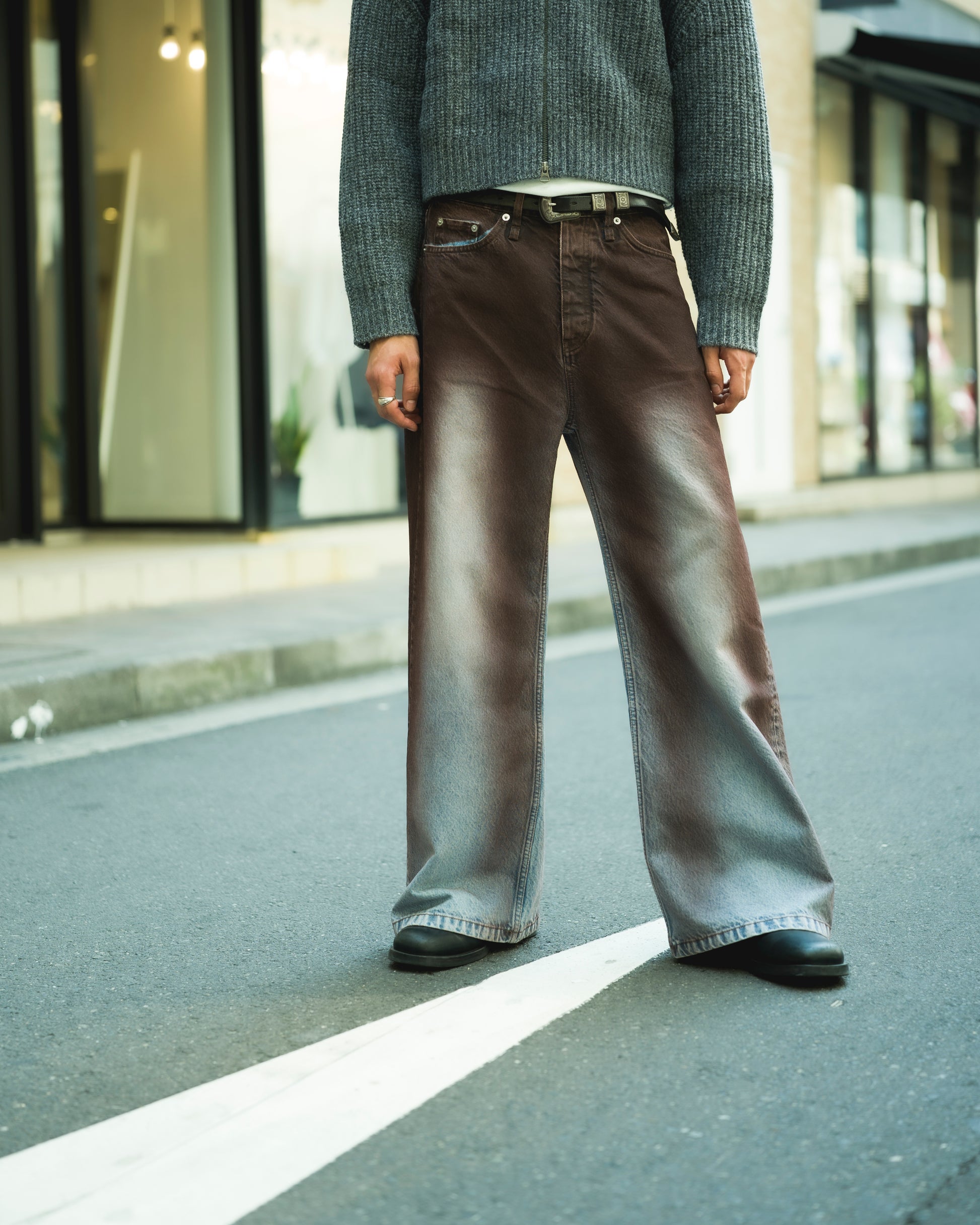 Skid Jeansは、腰で履くデザインで、ややドロップクロッチのワイドフレアシルエットが特徴。HOPEのデニムは、エネルギー・化学薬品・水の使用量を大幅に削減する先進的な技術でウォッシュ加工されています。