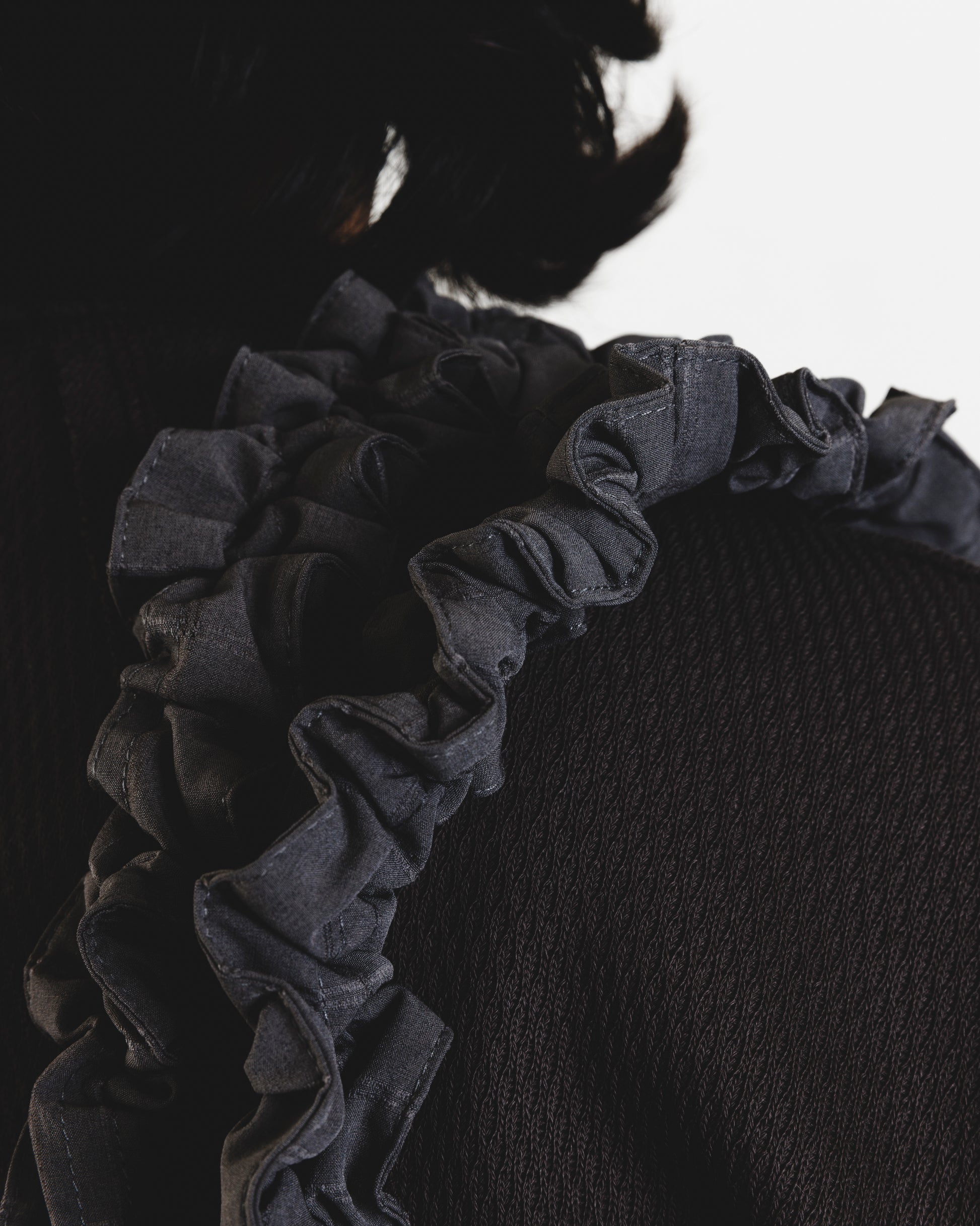 立体的なシルエットに、長さ調整可能なストラップとポケットを備えたデザインが特徴です。