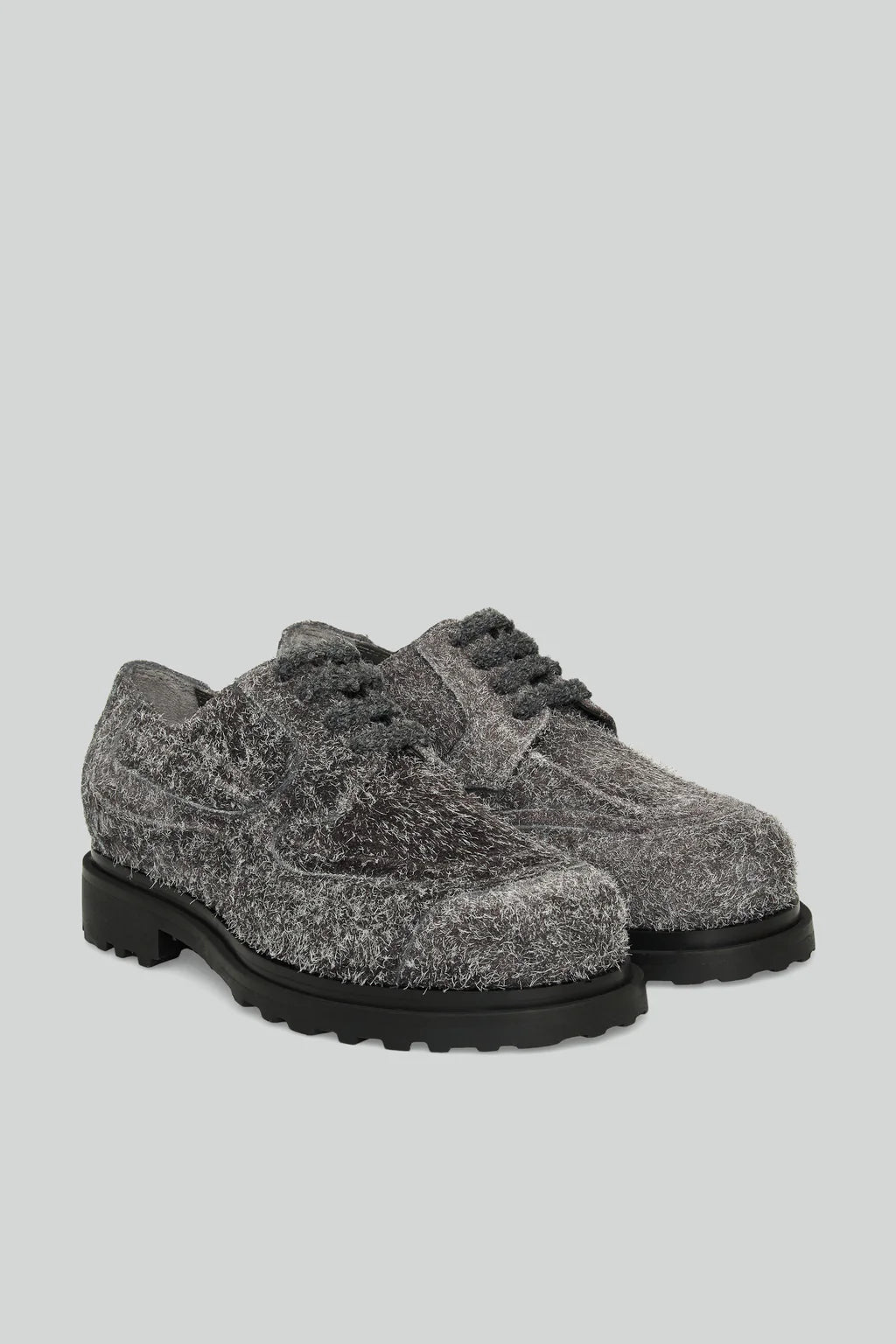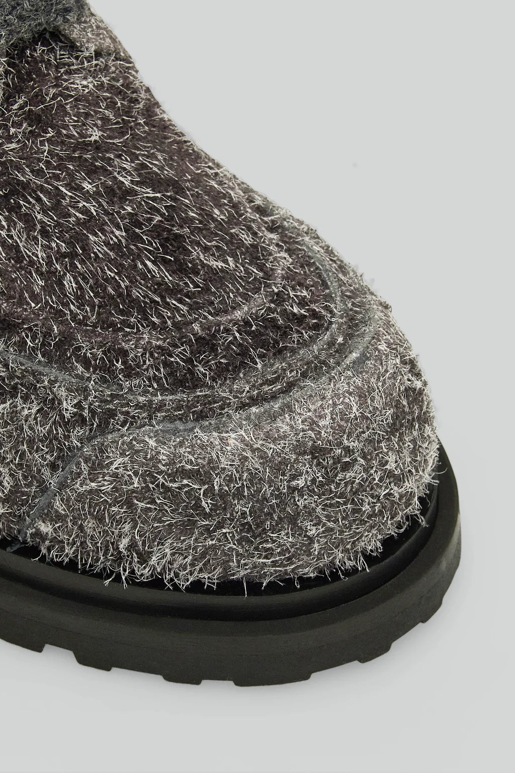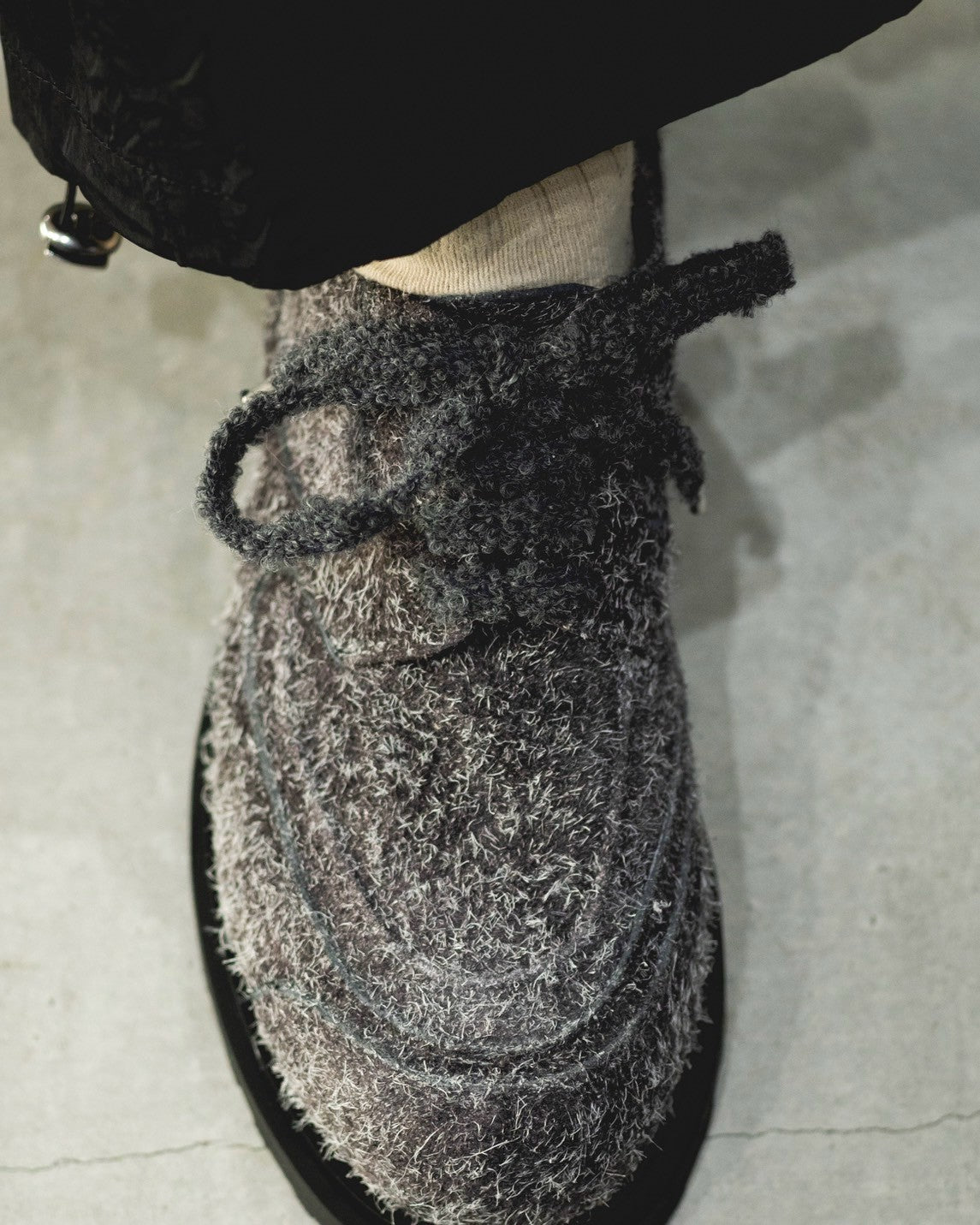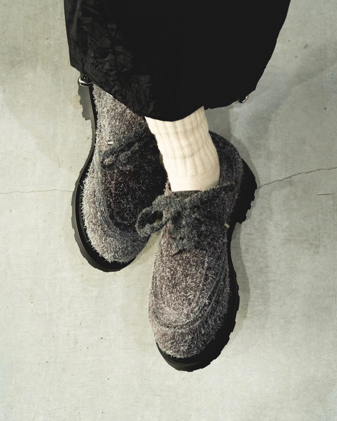 長毛の2トーンブラッシュドスエードで作られております。太めのシューレースと流れるようなシームディテールが特徴です。