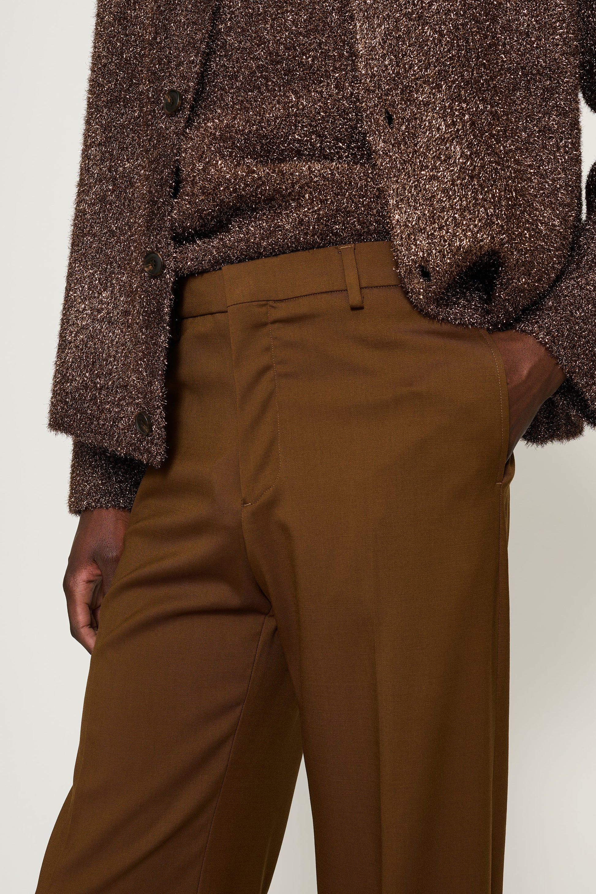 イタリアンウールの上質な質感を活かしたワイドフィットの一本。シームに沿ったサイドポケットと、洗練されたツインジェットポケットが、クリーンでモダンな表情を引き立てます。