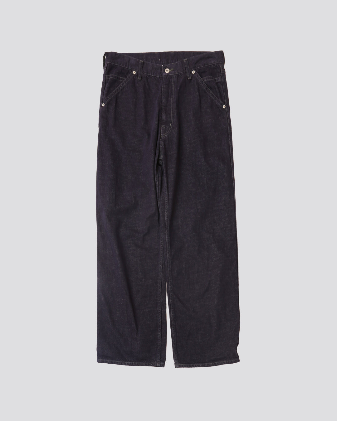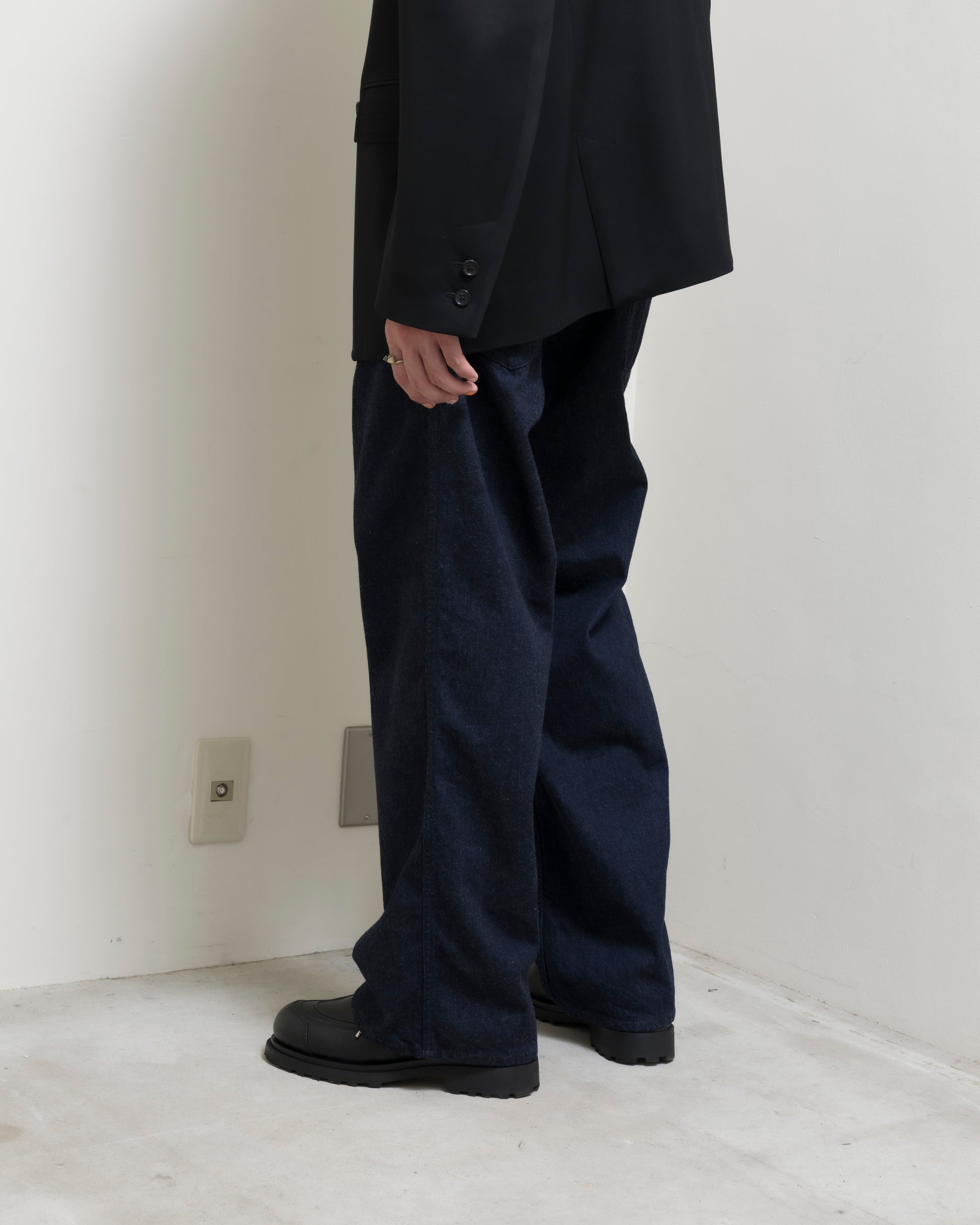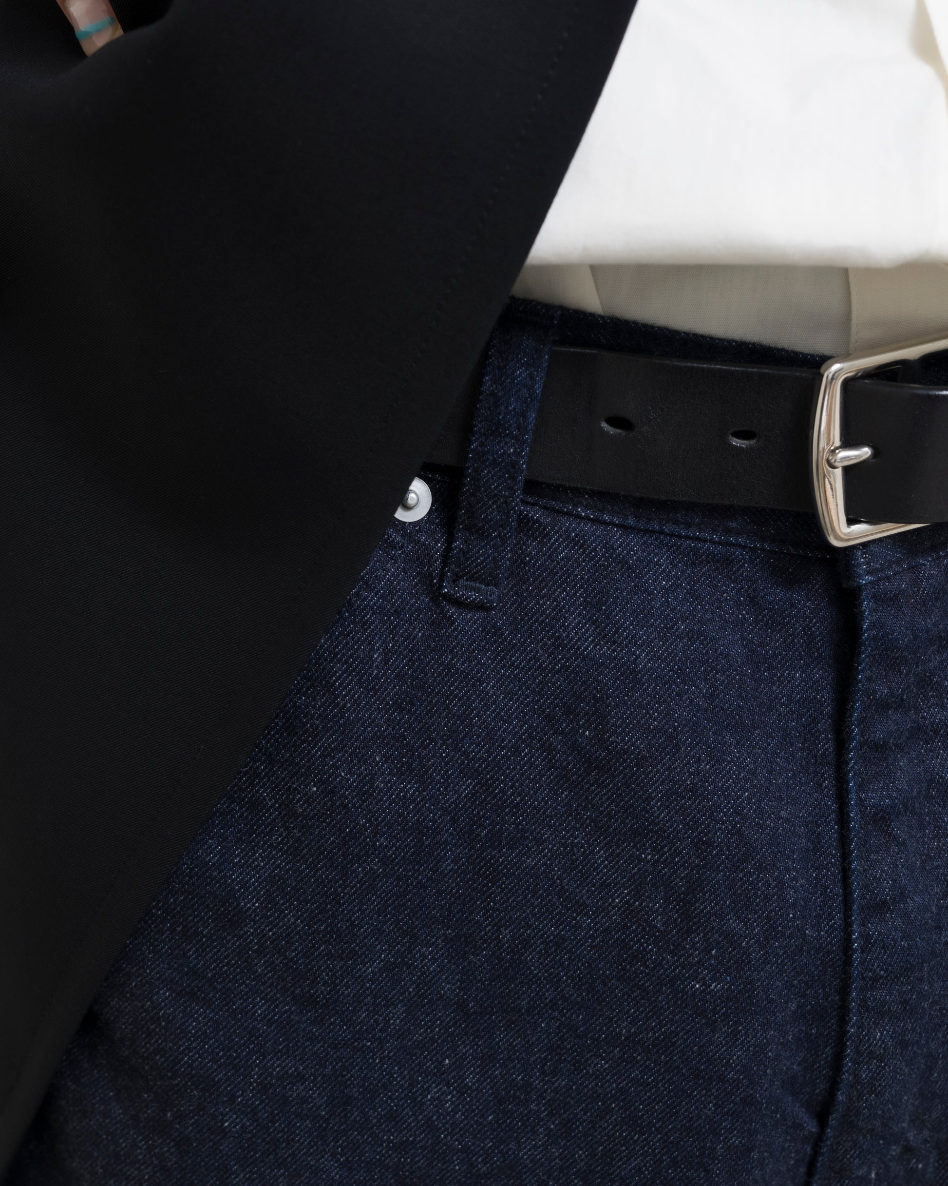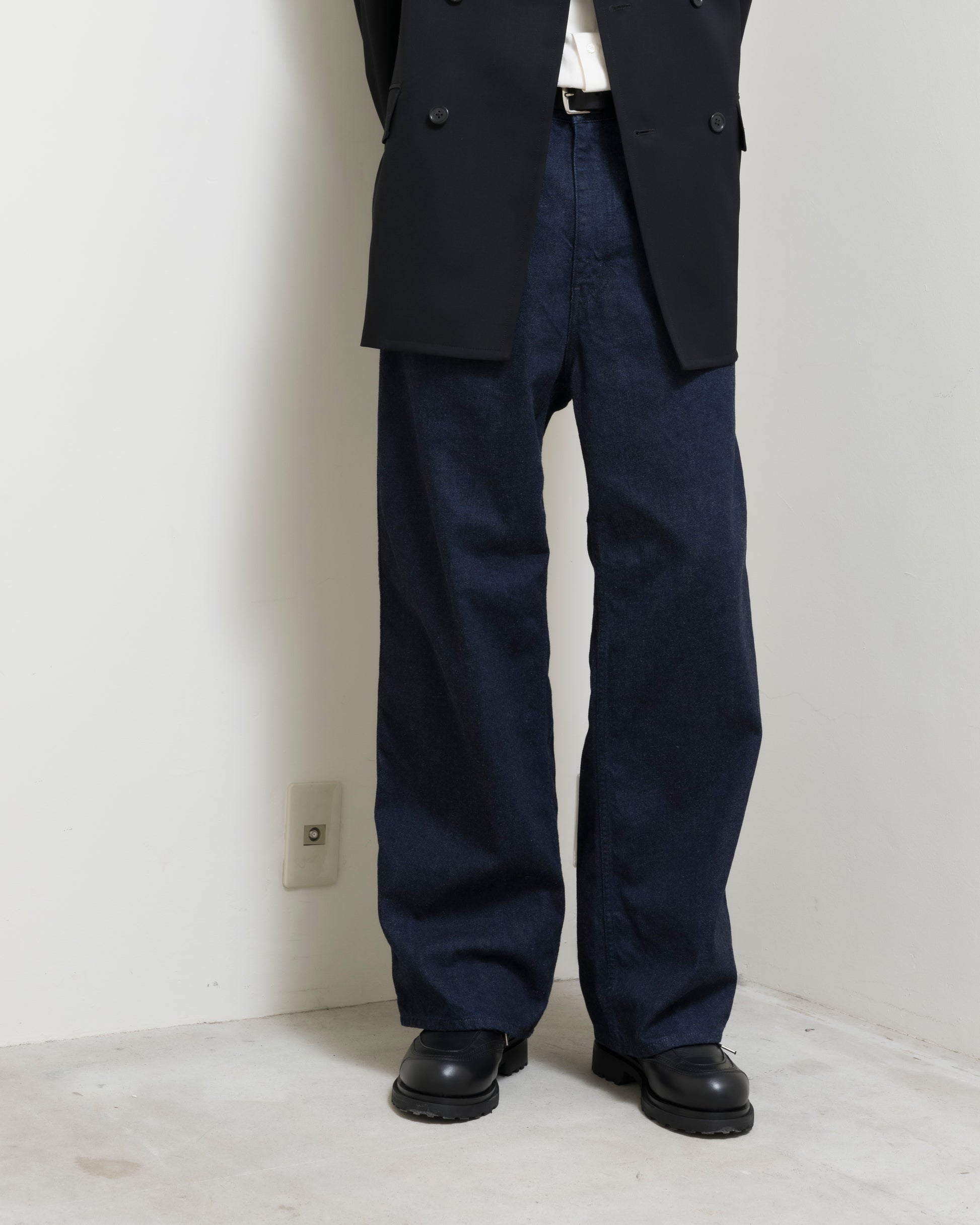 ENCOMINGとして提案するデニムシリーズのレギュラーデニム。12ozの軽めのデニム生地にワンウィッシュ加工のみ施し、表面の風合いと本体のハリ感はキープ。ブランドのアイコニックな下げ札を模したオリジナルのレザーパッチを腰回りに。くり抜かれたサークル部分にはキーチェーンを引っ掛けることも可能になっております。