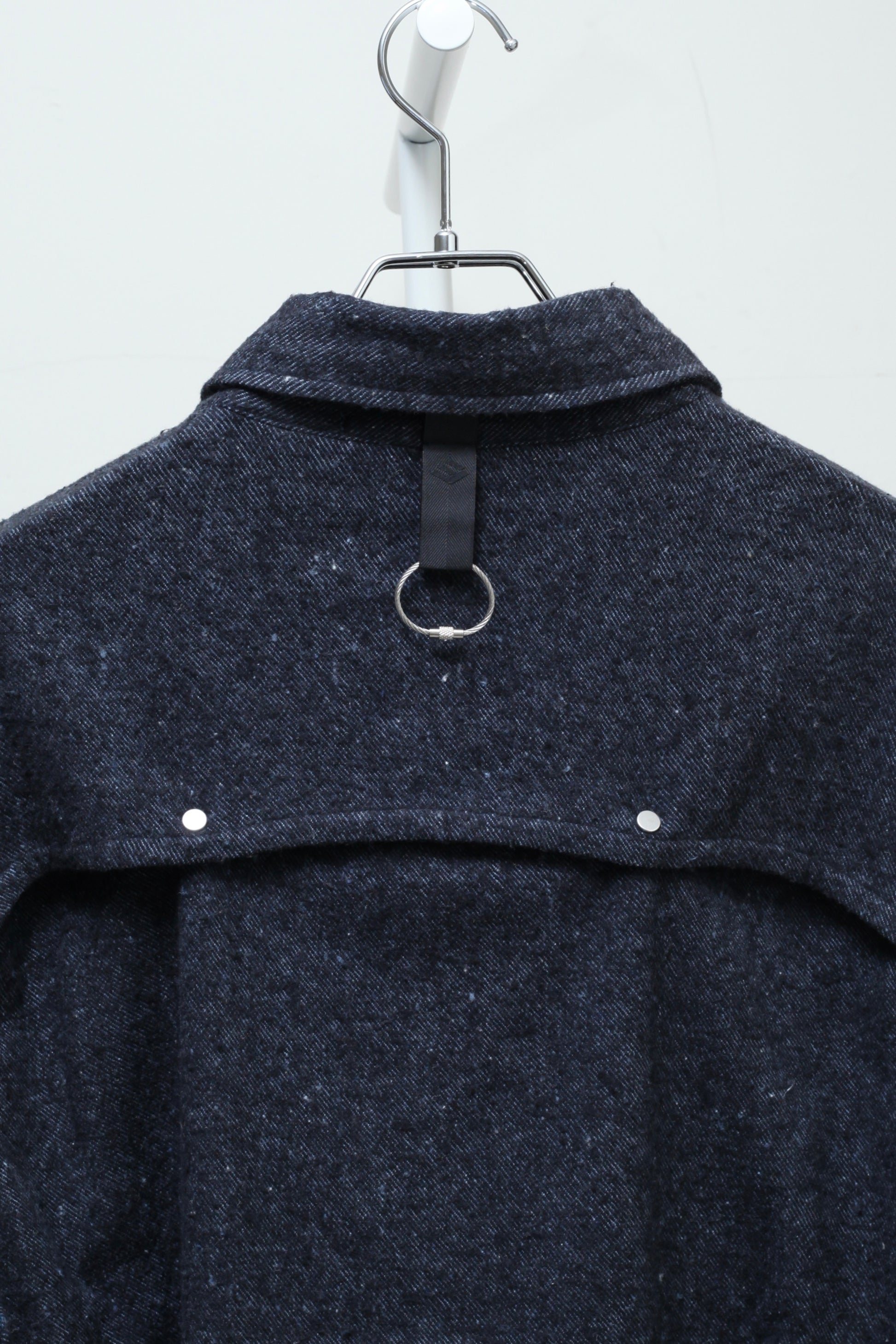 ややオーバーサイズのシルエットで、日本製 SunGrip® スナップボタンによるフロント開閉仕様。フロントポケットは斜めにカットされ、YKKファスナーを使用。プリーツや立体的な袖デザインを採用し、背面には日本製 Shimada® スナップボタン付きヨークと、小さな通気用スリットを配置。アイコニックなスチールケーブルとアルミ製のシグネチャーディテールを特徴としています。