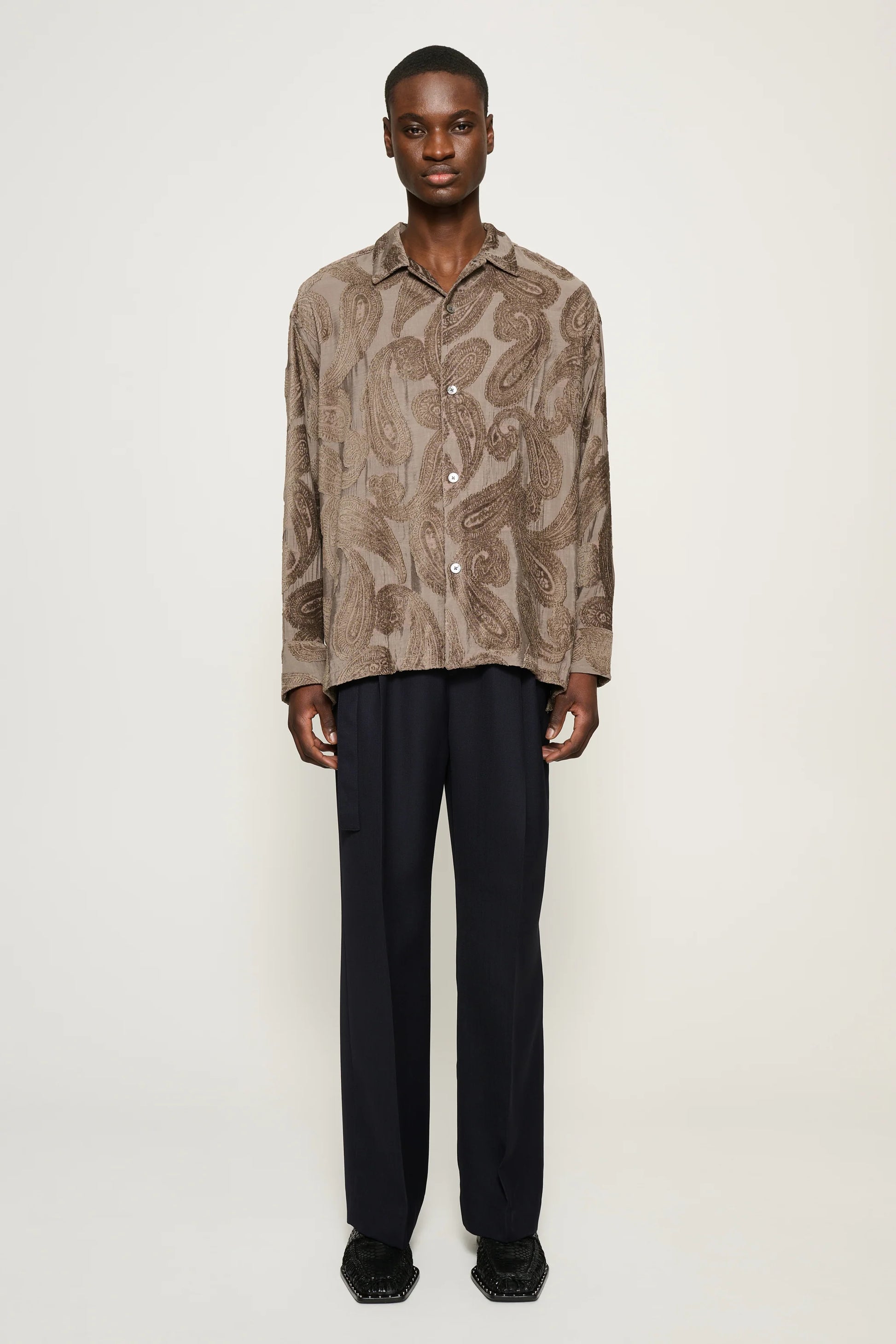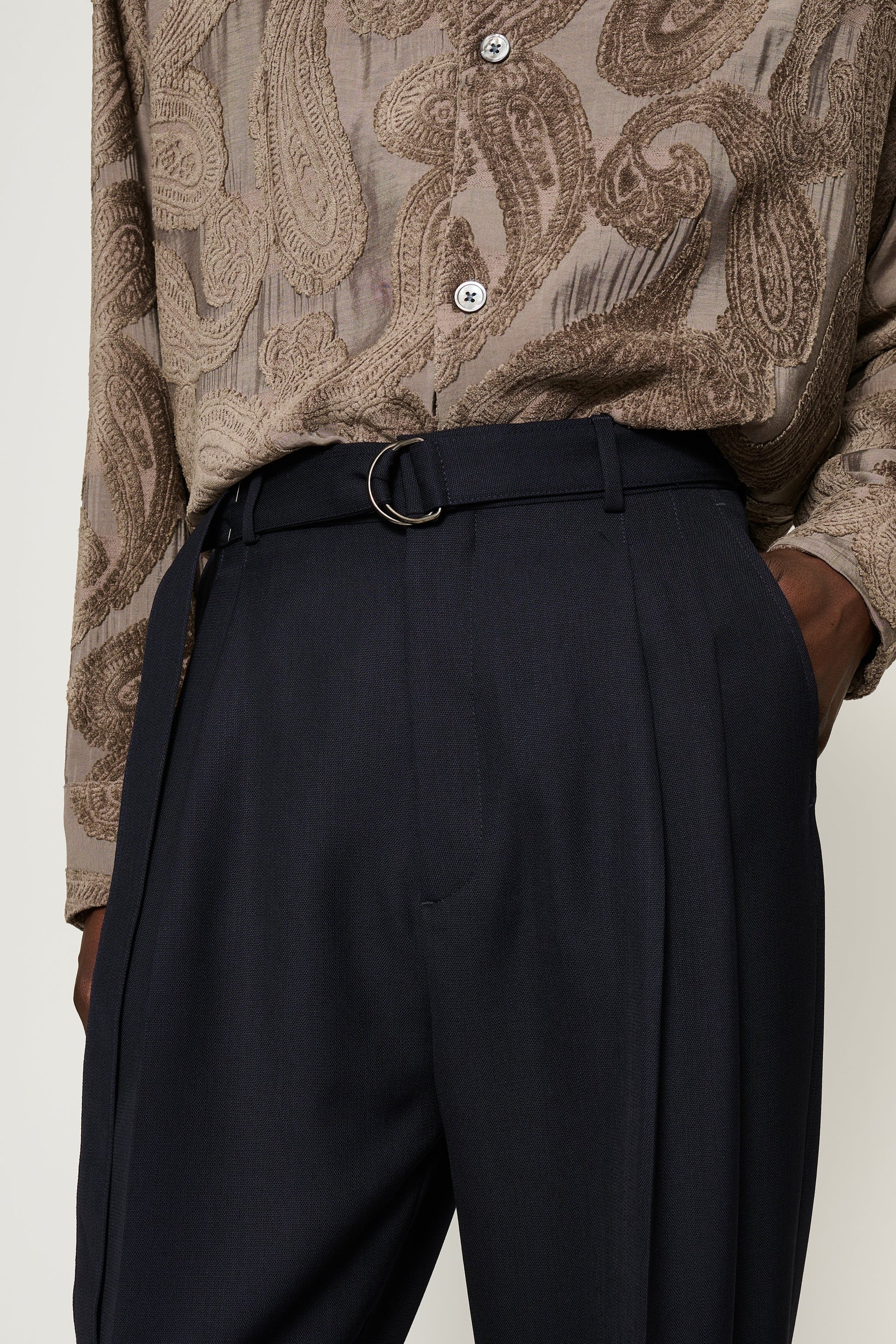 贅沢なイタリアンウールで仕立てたリラックスフィットの一本。クラシックなダブルプリーツに加え、共布のベルトと手縫いのCSロゴボタンを配したツインバックポケットが、さりげないアクセントを添えます。