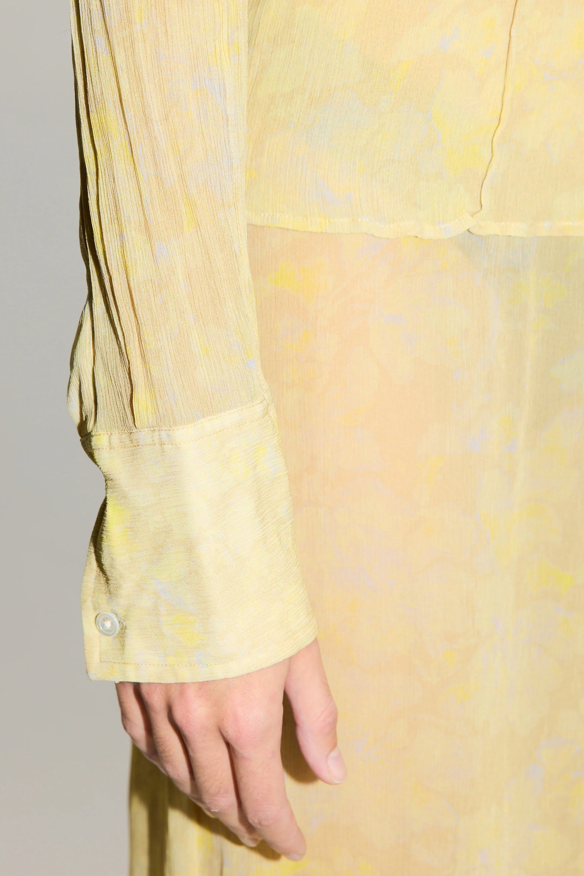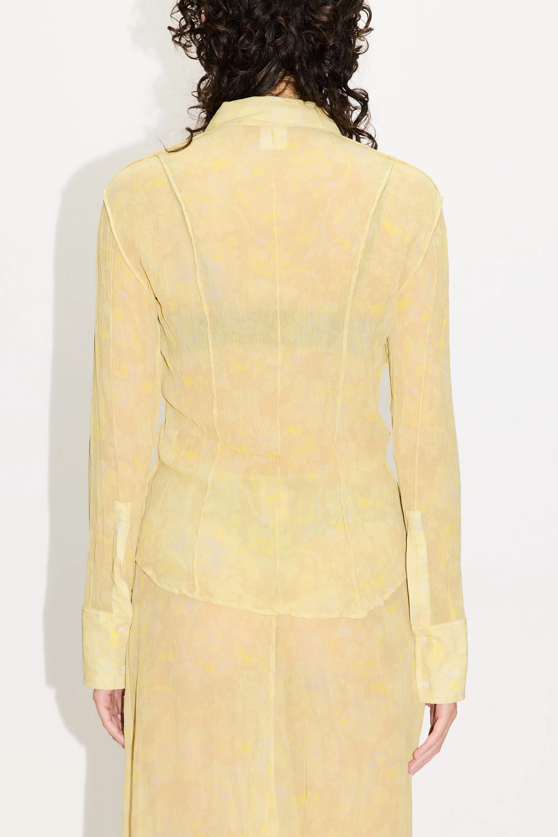 Heart Shirtは、プリーツ加工を施したビスコースクレープ素材のスリムフィットシャツ。マザーオブパールのボタン、ロングカフス、裏使いのフレンチシームが特徴です。