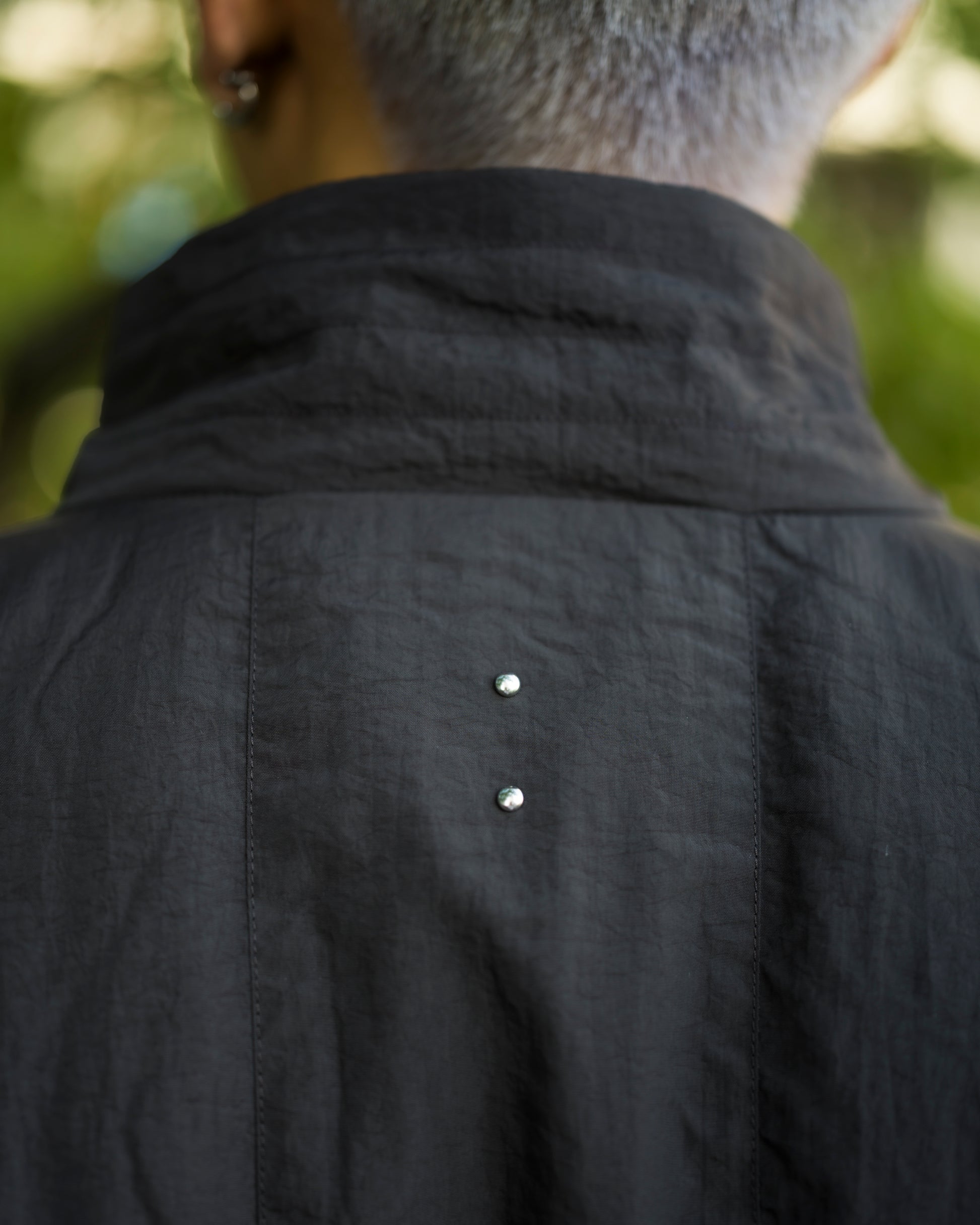 軽量クラッシュナイロンを使用した中わた入りジャケット。暖かく、程よく立体感のあるシルエットです。サイドポケットの縁は重なり合う生地でデザインされ、袖口とウエストは伸縮して体にフィット。背面ネックには小さな金属ボタンの装飾をあしらい、さりげないアクセントになっています。