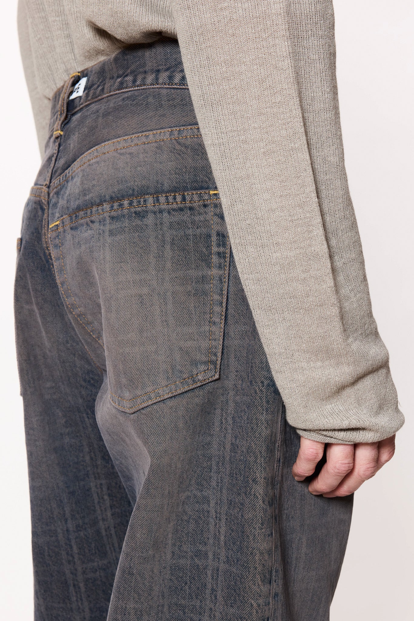 こちらのモデルは、ダスティブルーのウォッシュに、レーザー加工によるチェックパターンを施しています。