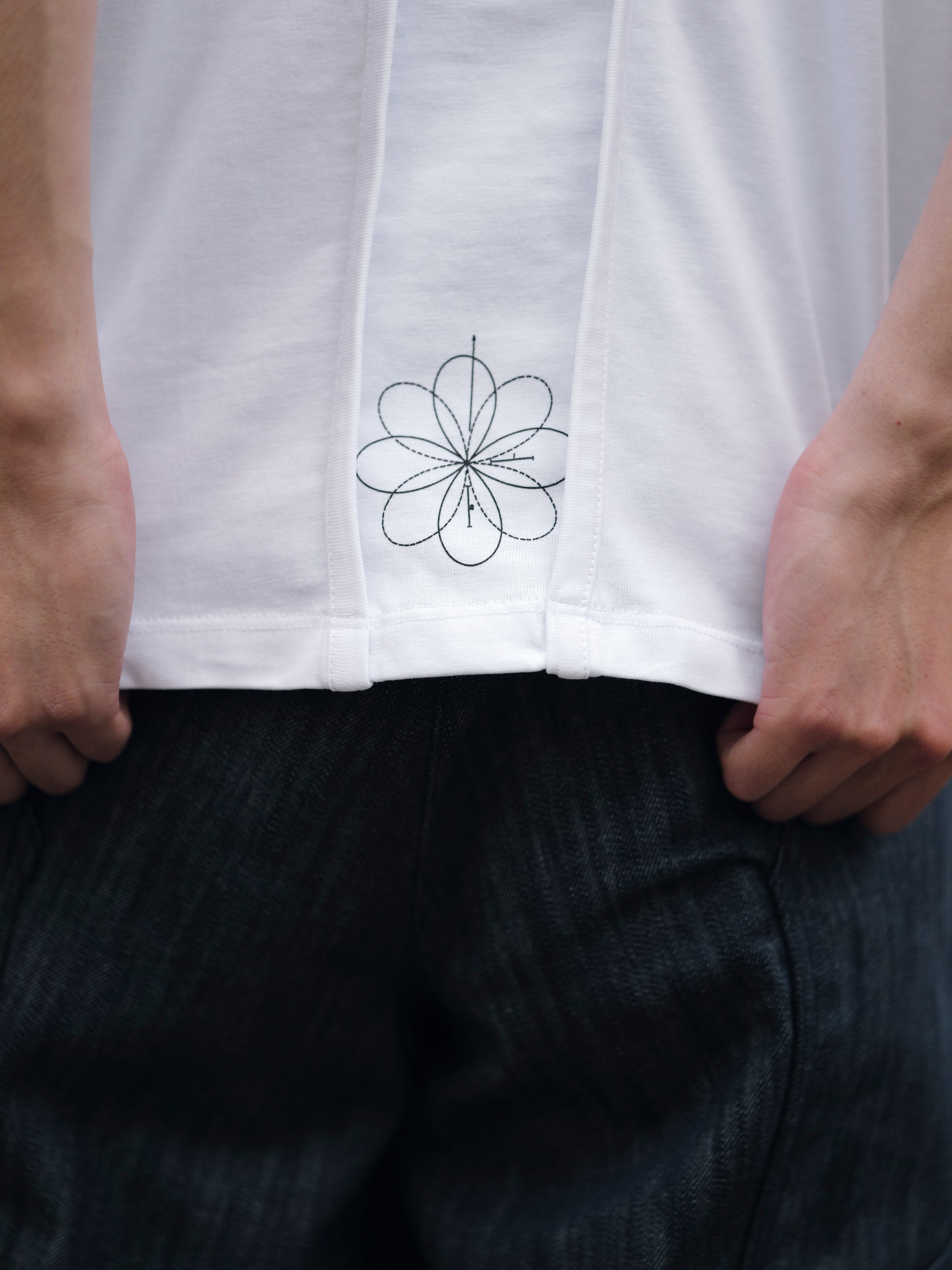 前後を包み込むデザインの襟と、今シーズンのプリントが特徴的なコットンTシャツです。
