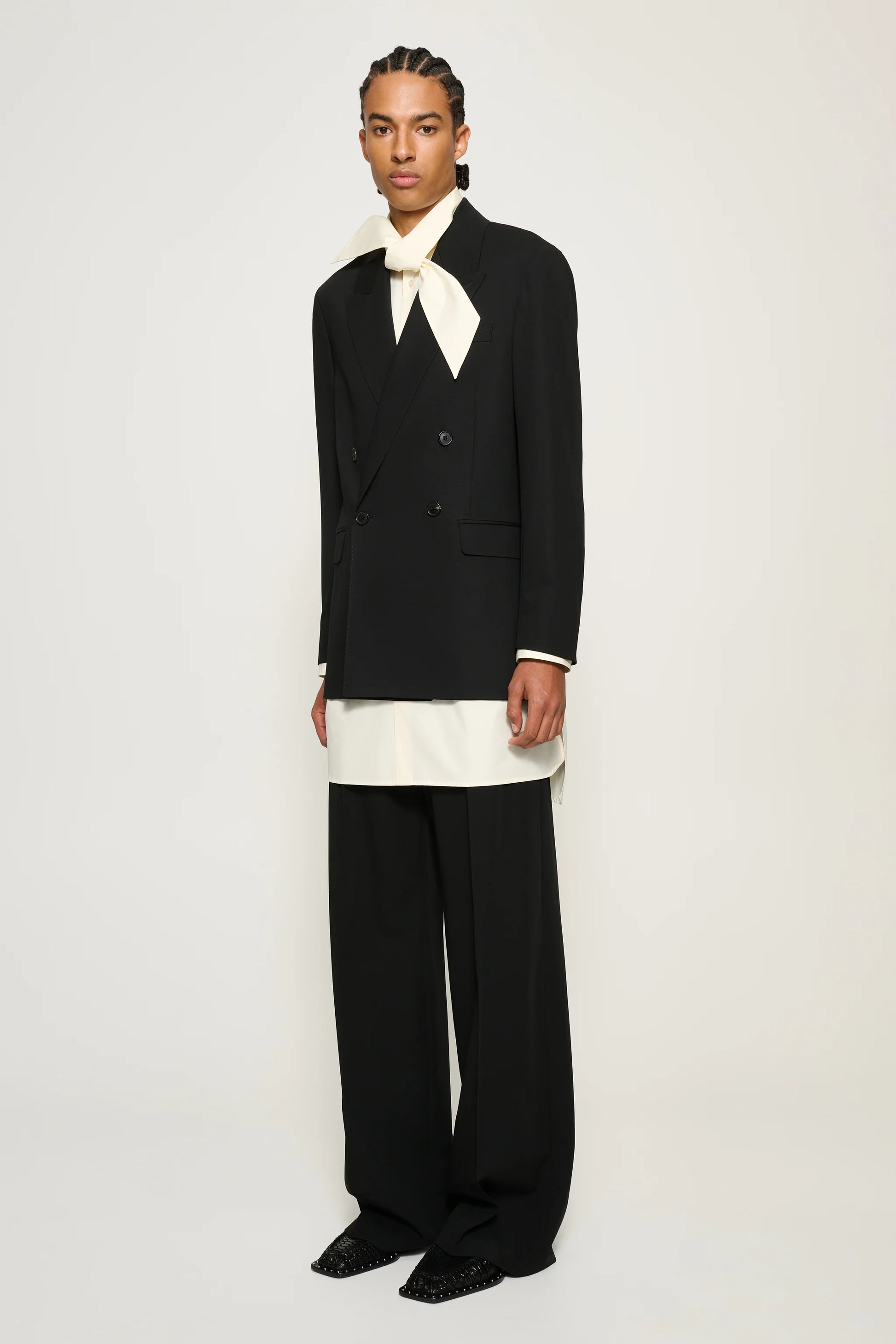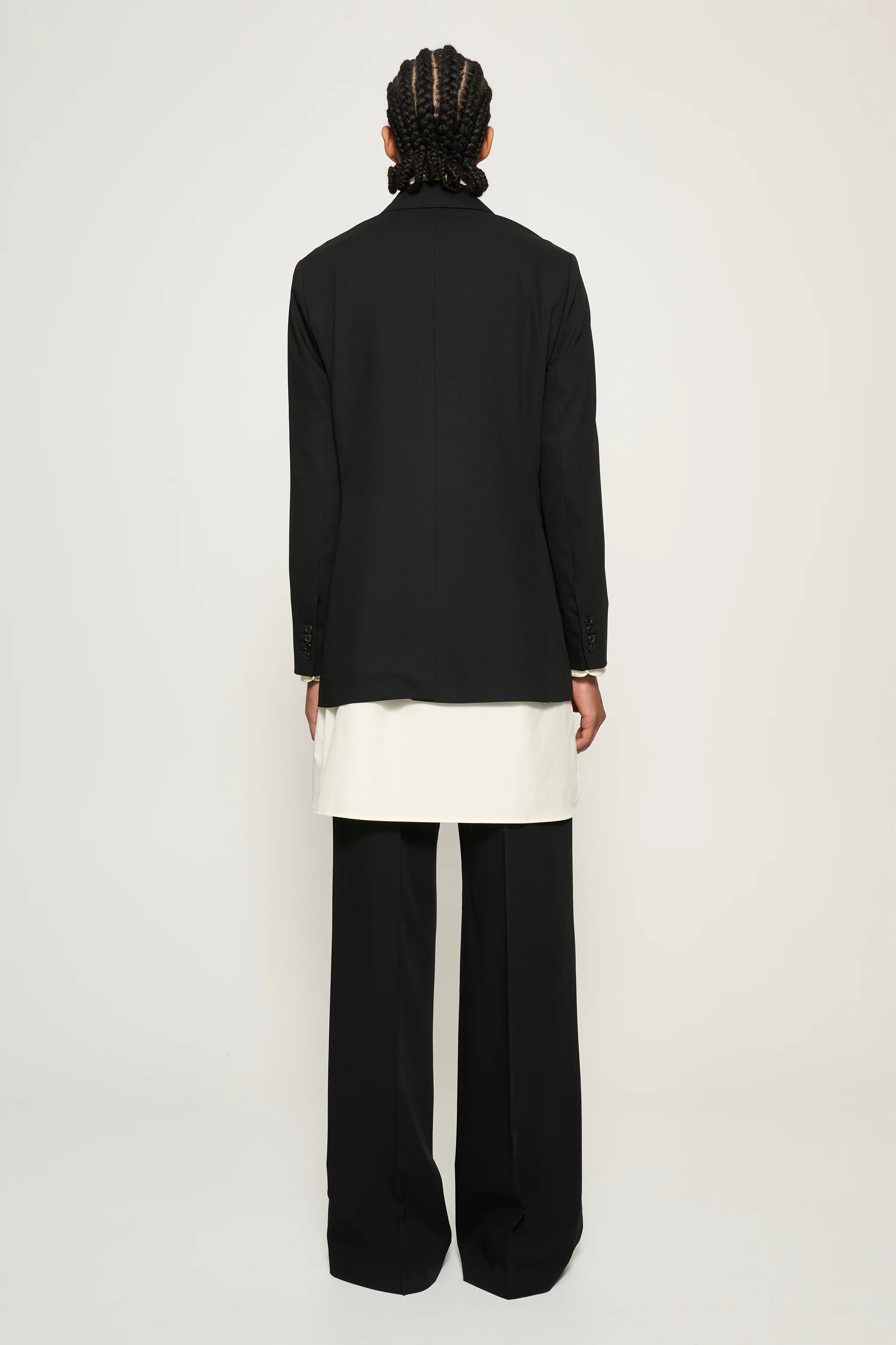 軽やかなショルダーパッドで構築的なラインを描き、ピークドラペルとシングルベントがエレガンスを強調。