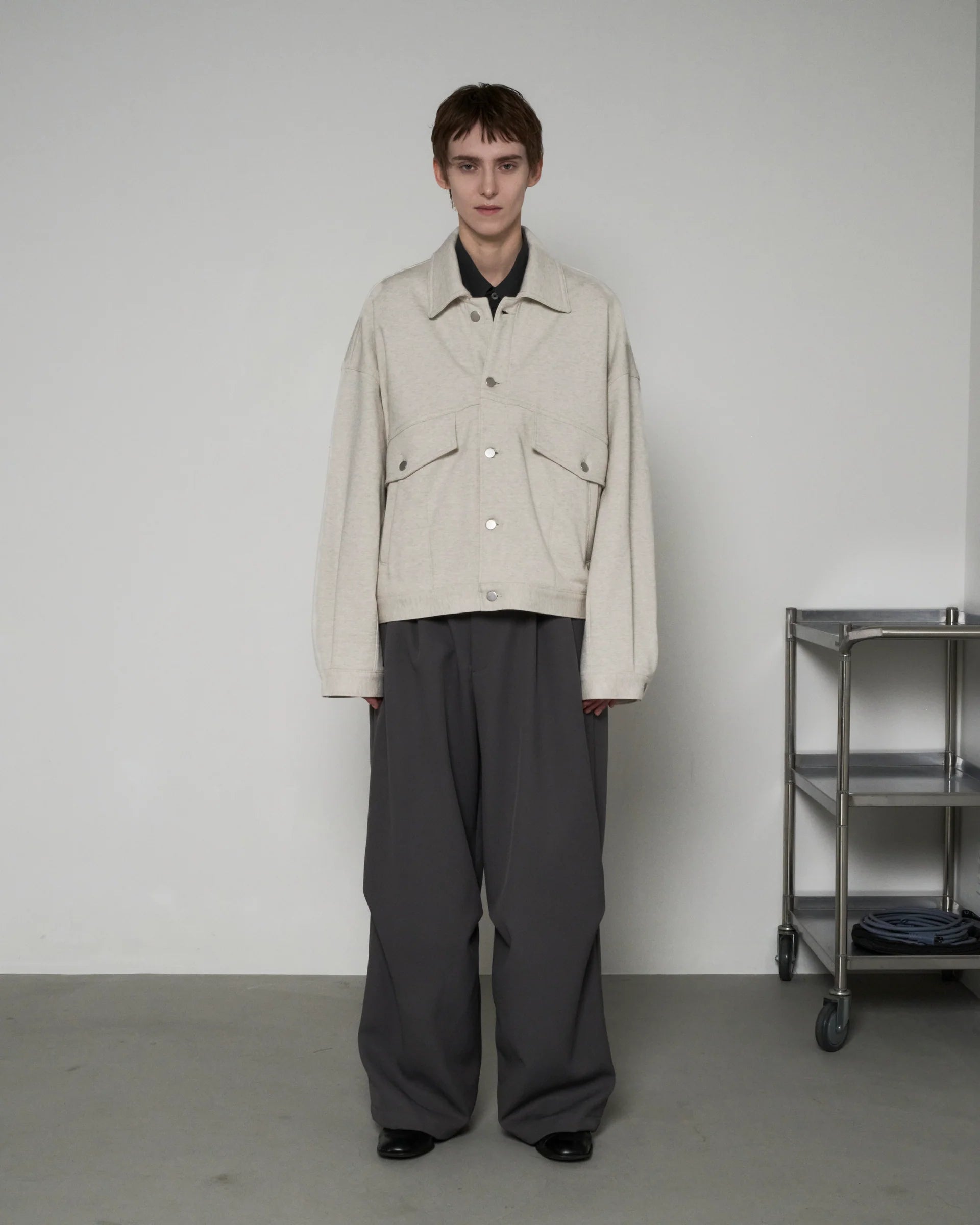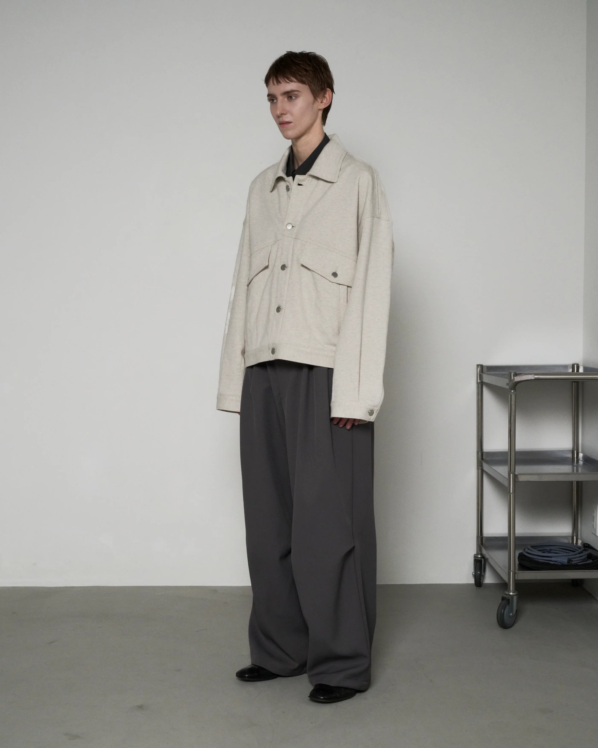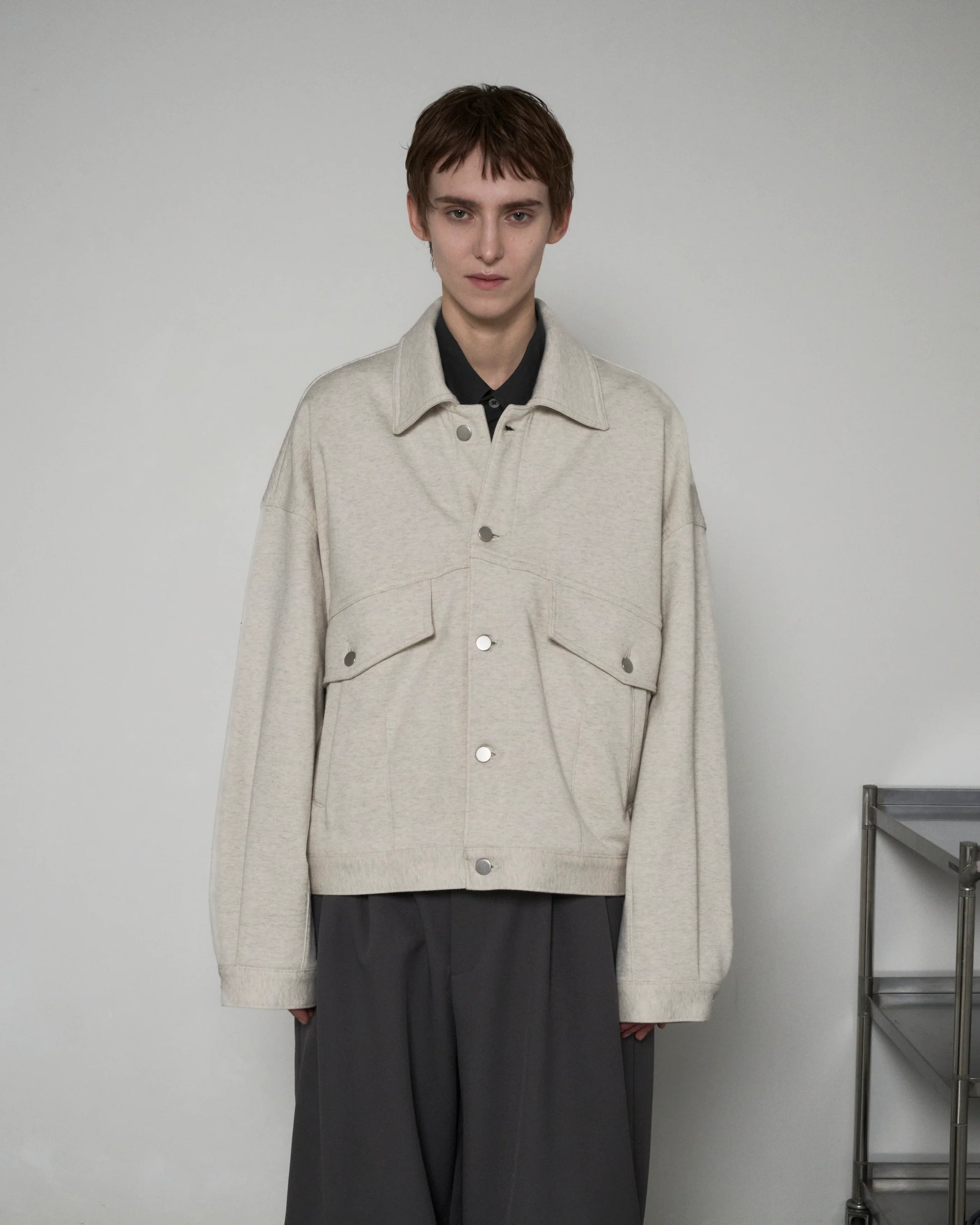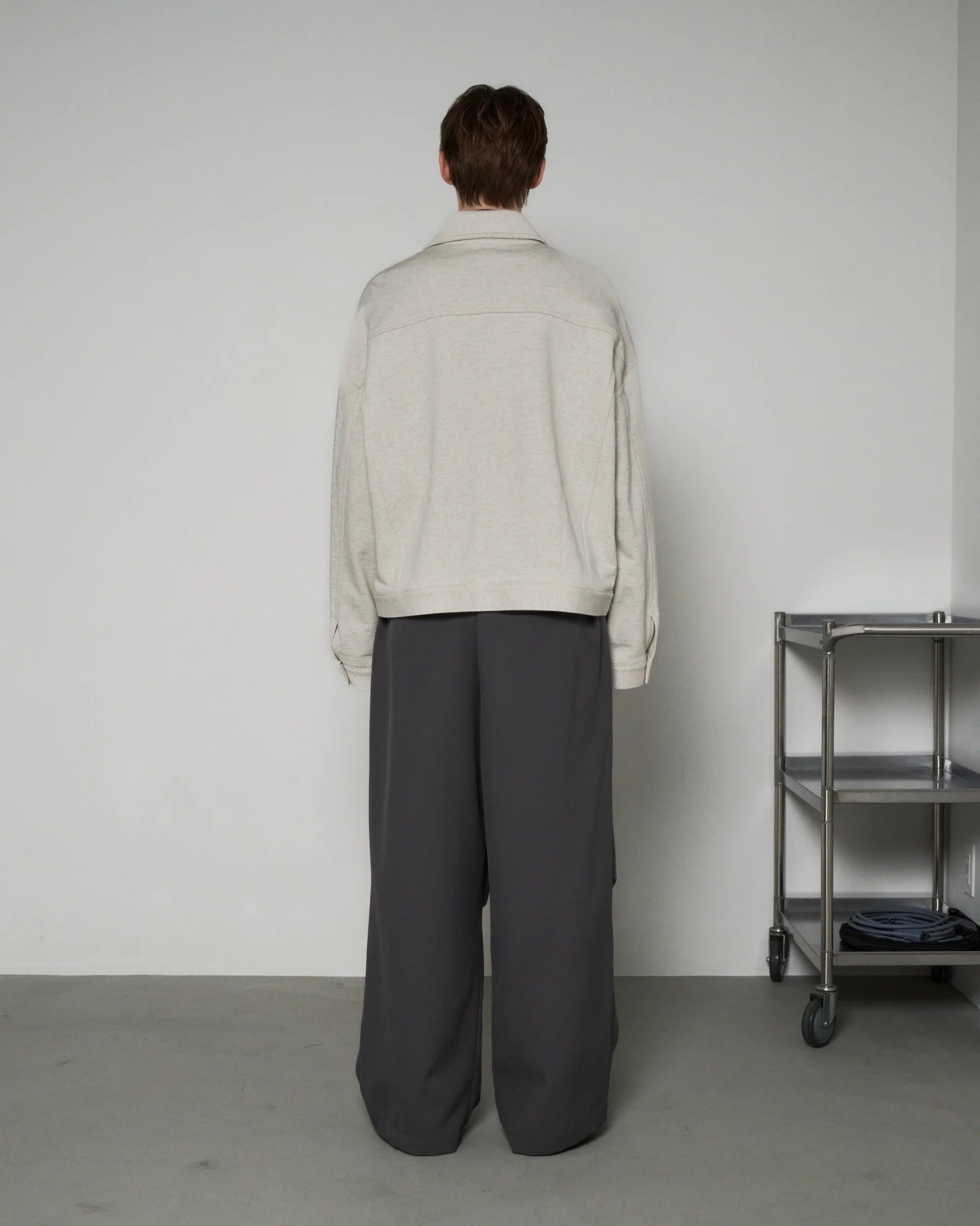 18G で編み立てた裏毛を使用したスウェットトラッカージャケット。 裏糸が双糸のためしっかりとした仕上がりかつ肌触りの良い生地感。 袖・裾のタックとダーツにより適度なゆとりを持たせ、従来のトラッカー ジャケットよりリラックスしたムードになるよう製作されております。
