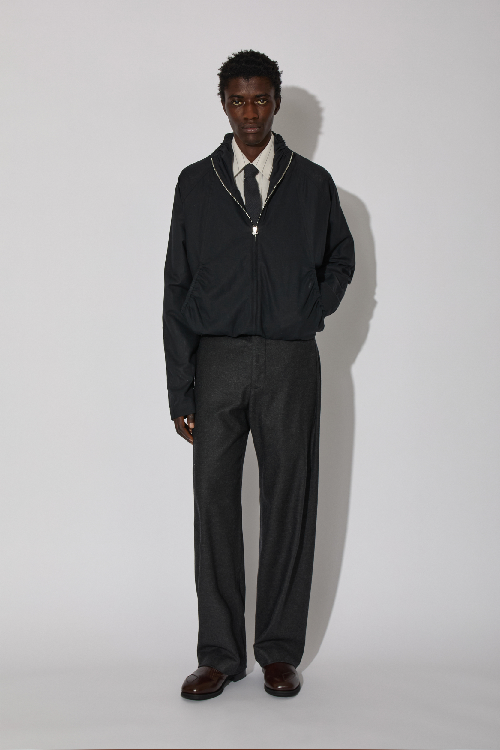 ギャザーを寄せた襟元が丸みのあるクロップドシルエットを形成し、後ろ襟にはトグルを配してフィットやニュアンスの調整を可能にしています。