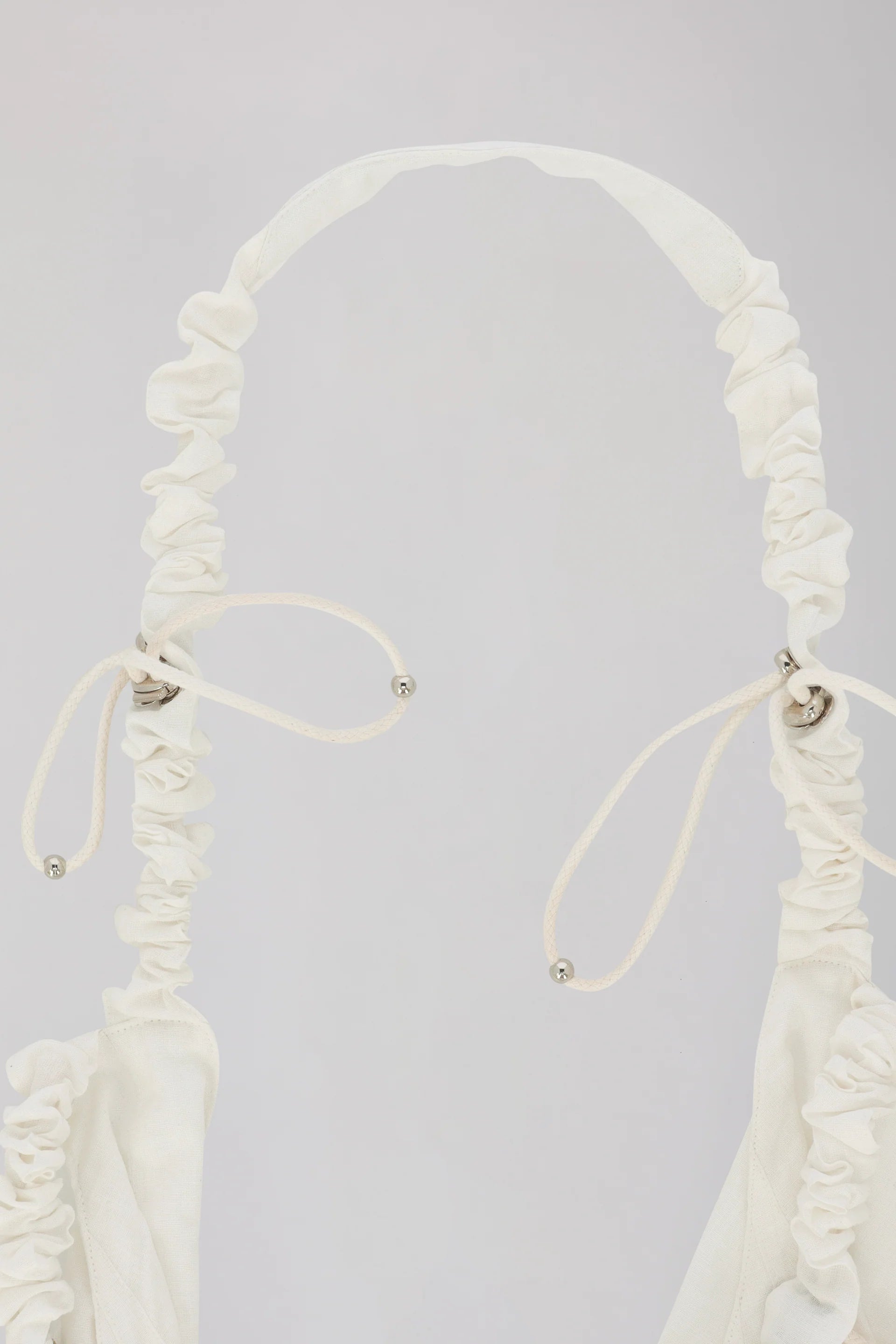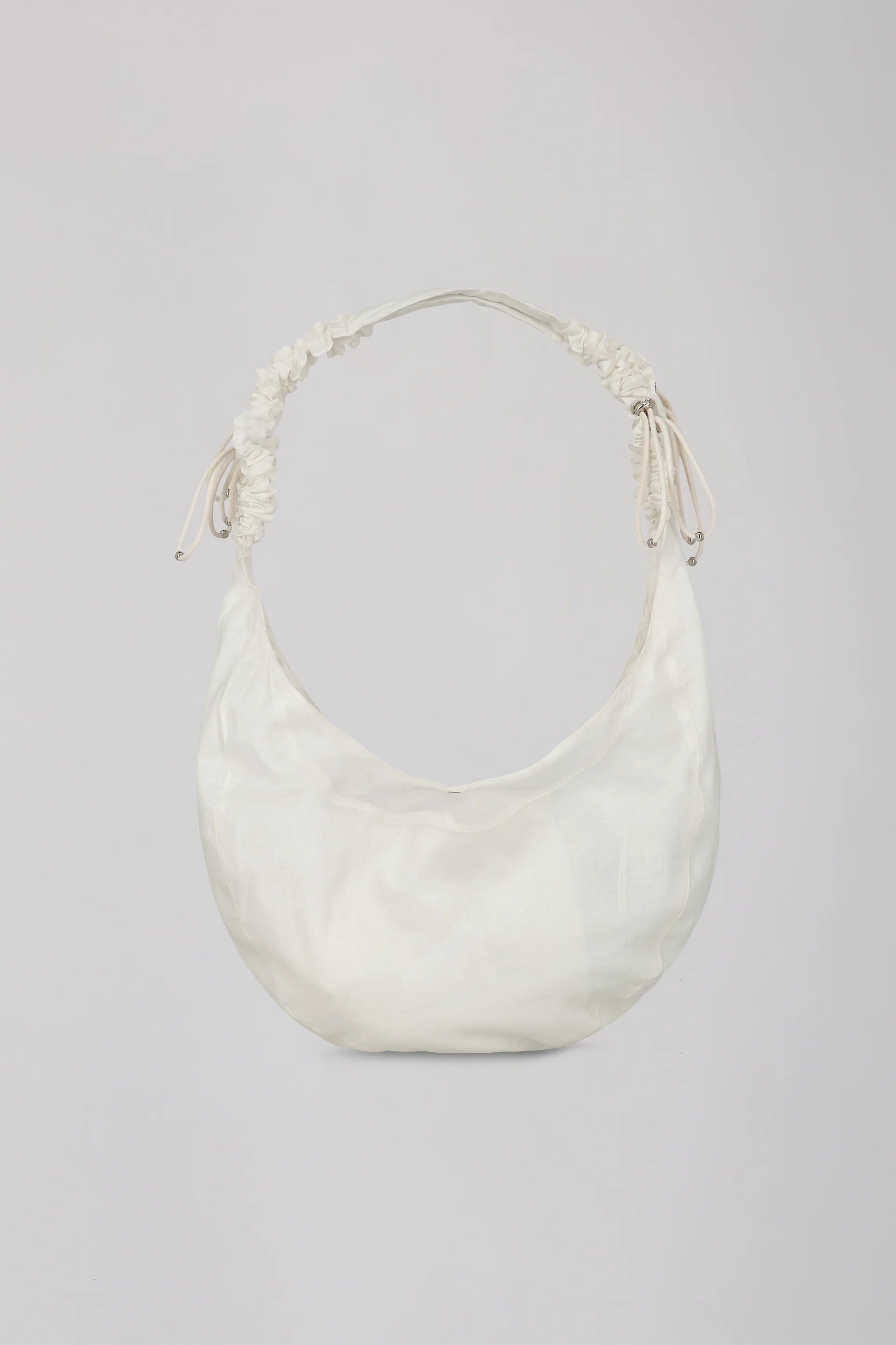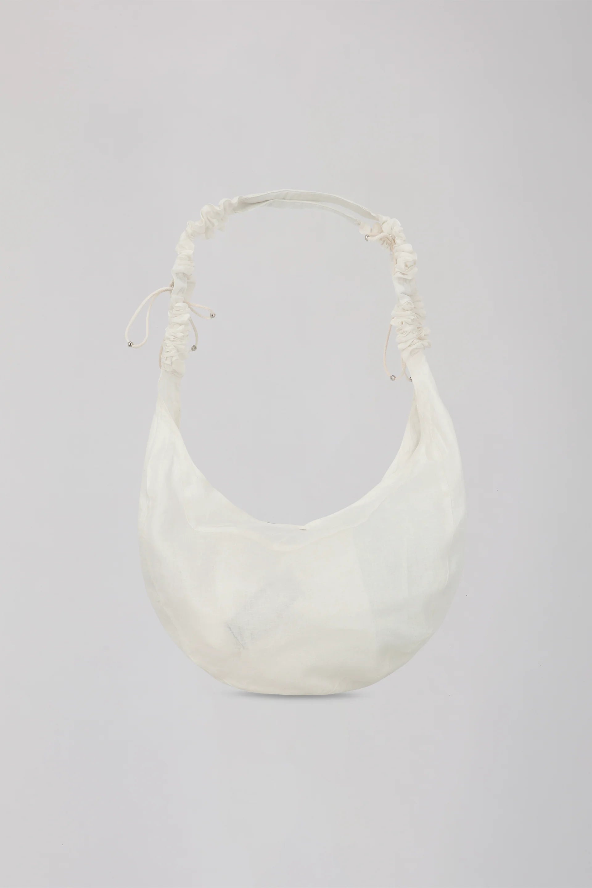 ギャザーを施した2本のパデッドショルダーストラップが特徴で、長さやフォルムのニュアンスを調整することが可能です。柔らかなボディの内側にはジップ付きポケットを内蔵し、ミニマルな外観を保ちながら実用性も確保しています。