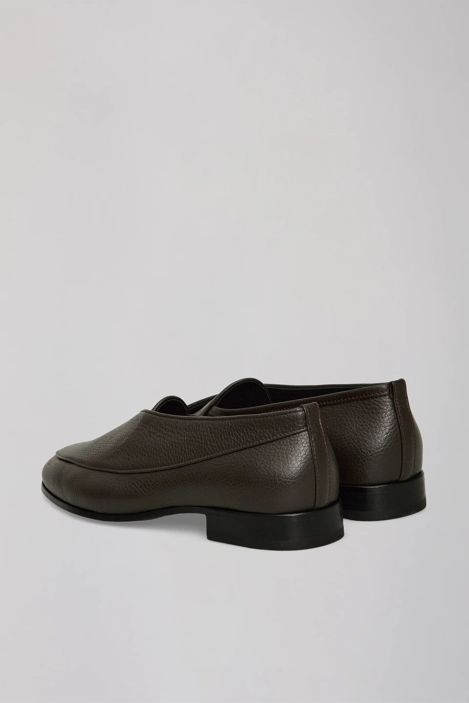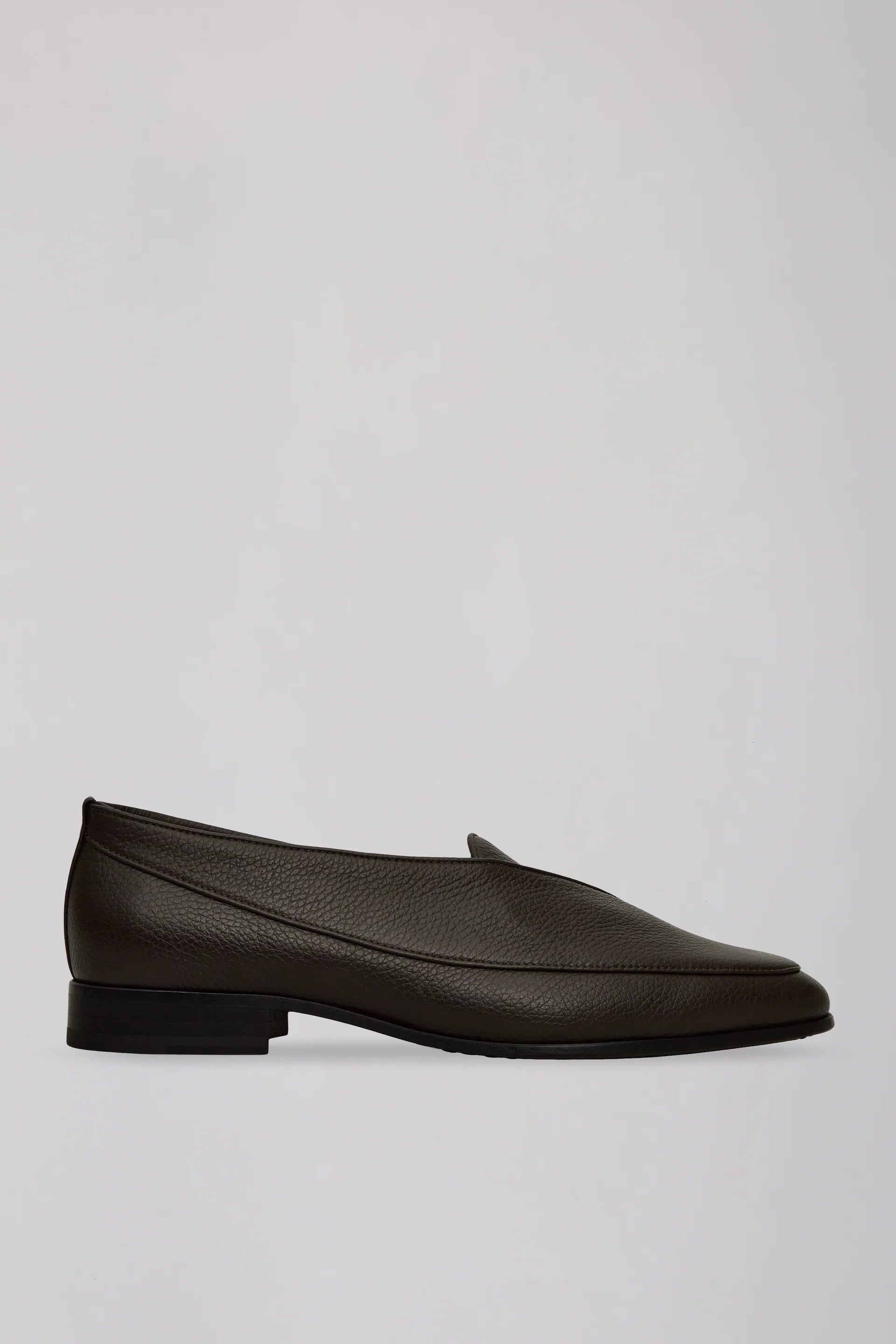 テクスチャー感のあるカーフレザーを使用し、低めのシルエットで構築された一足です。アッパーはワンピース構造によるラップアラウンドディテールを採用し、ミニマルでありながら立体感のあるデザインに仕上げています。