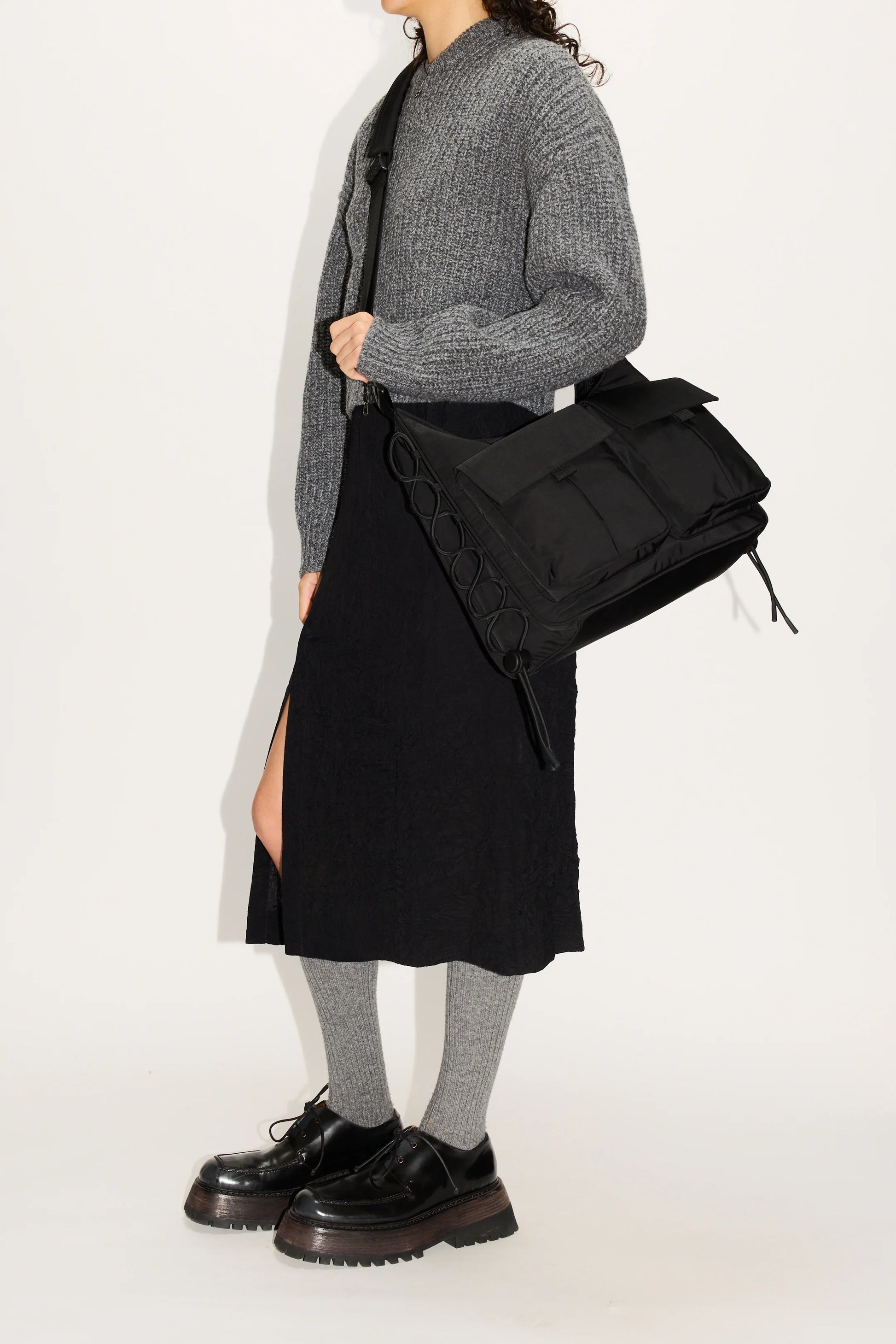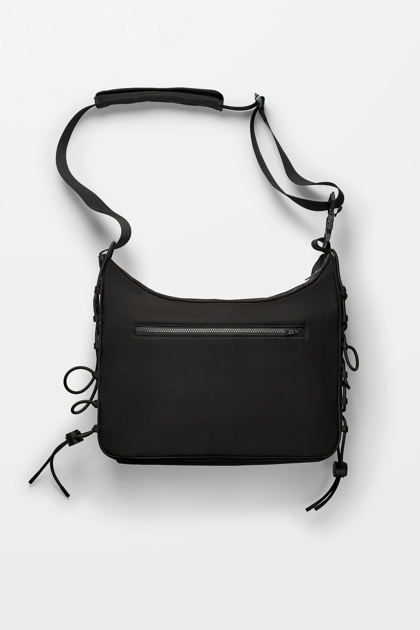 フロントには存在感のあるカーゴポケット、背面にはジップポケットを配したデザイン。調整可能なショルダーストラップはパッド入りで快適な掛け心地を実現し、ブランドロゴ入りのマグネットバックルがアクセントに。サイドのエラスティックレースにより、荷物量に合わせてバッグをコンパクトにも拡張にも対応できます。