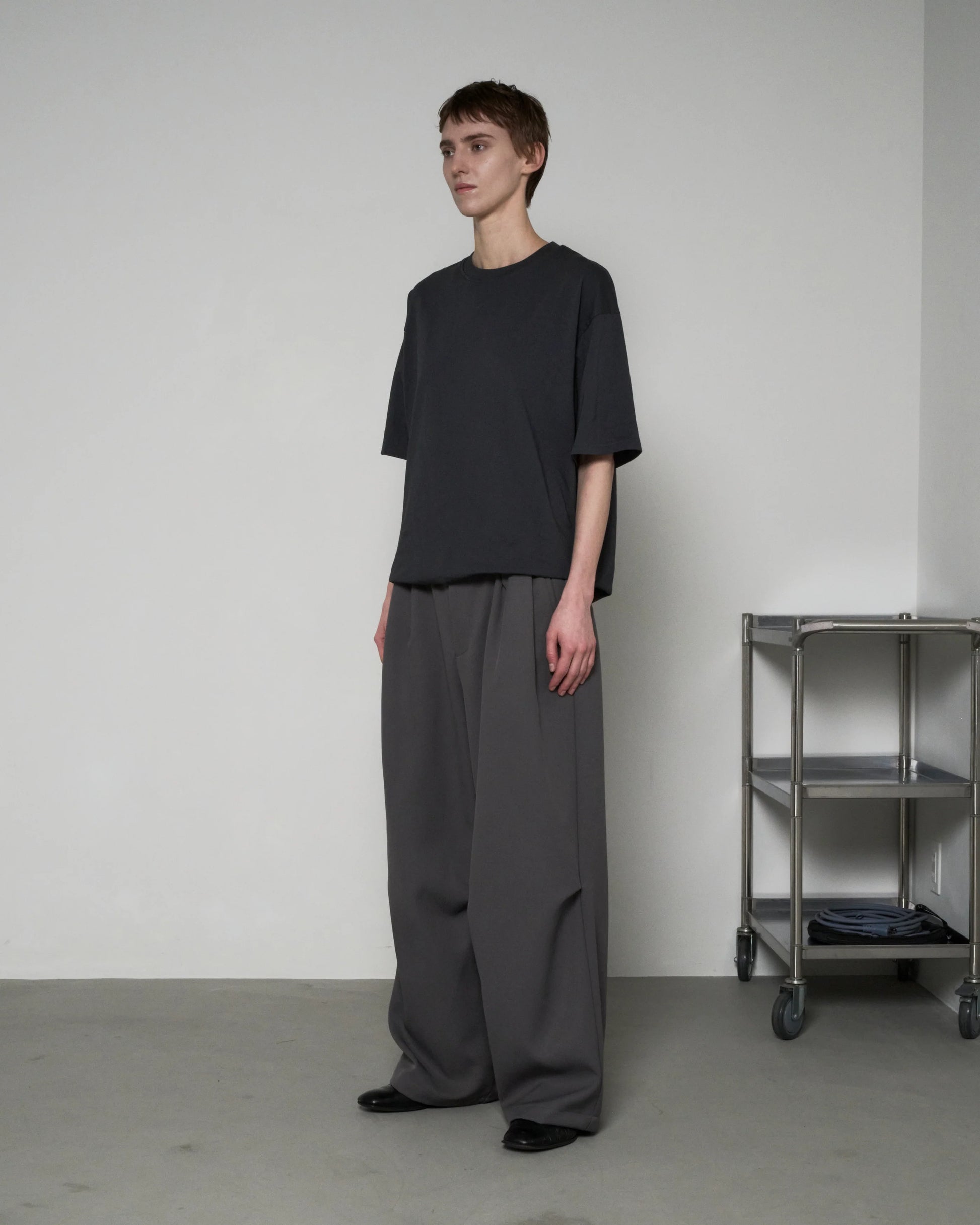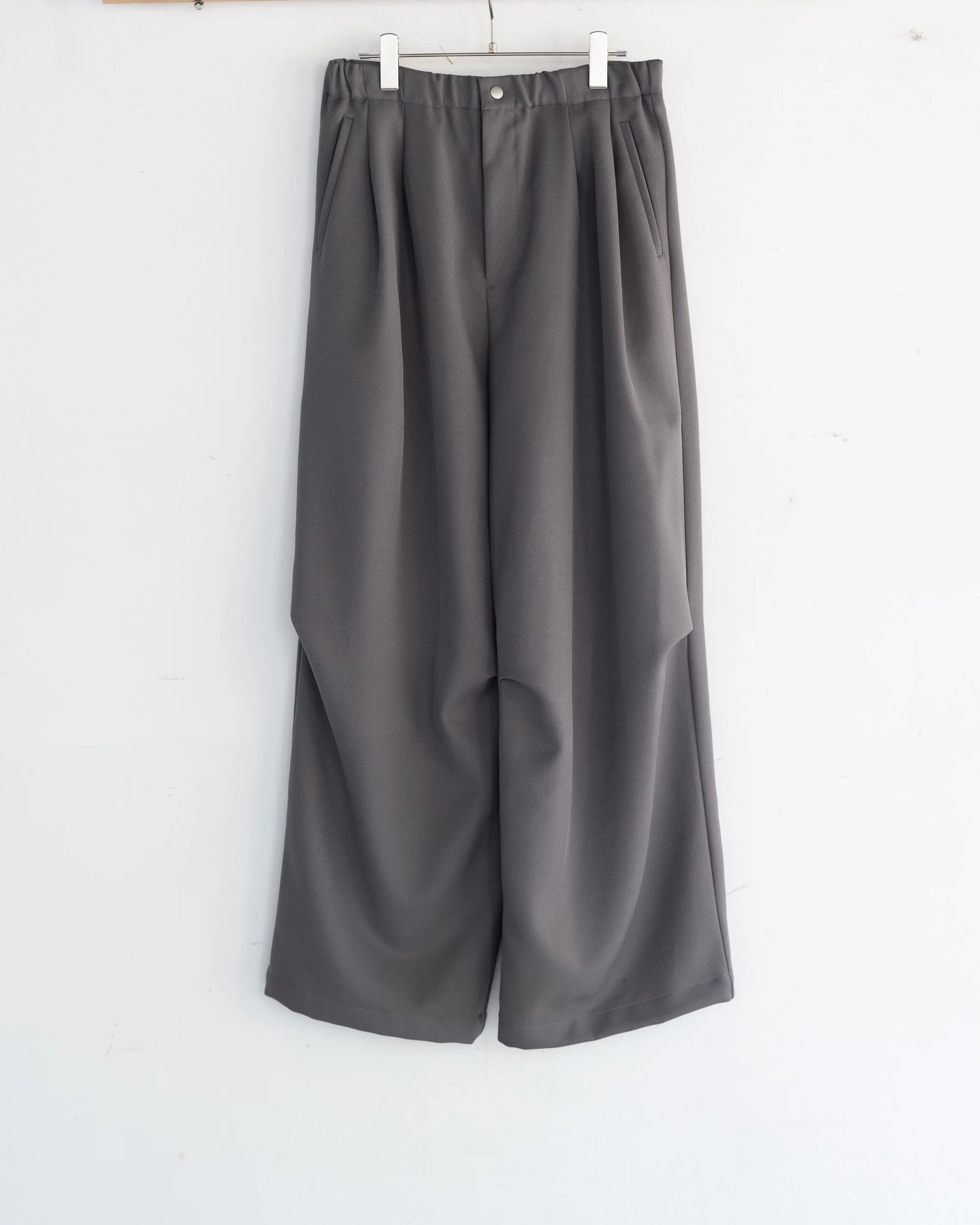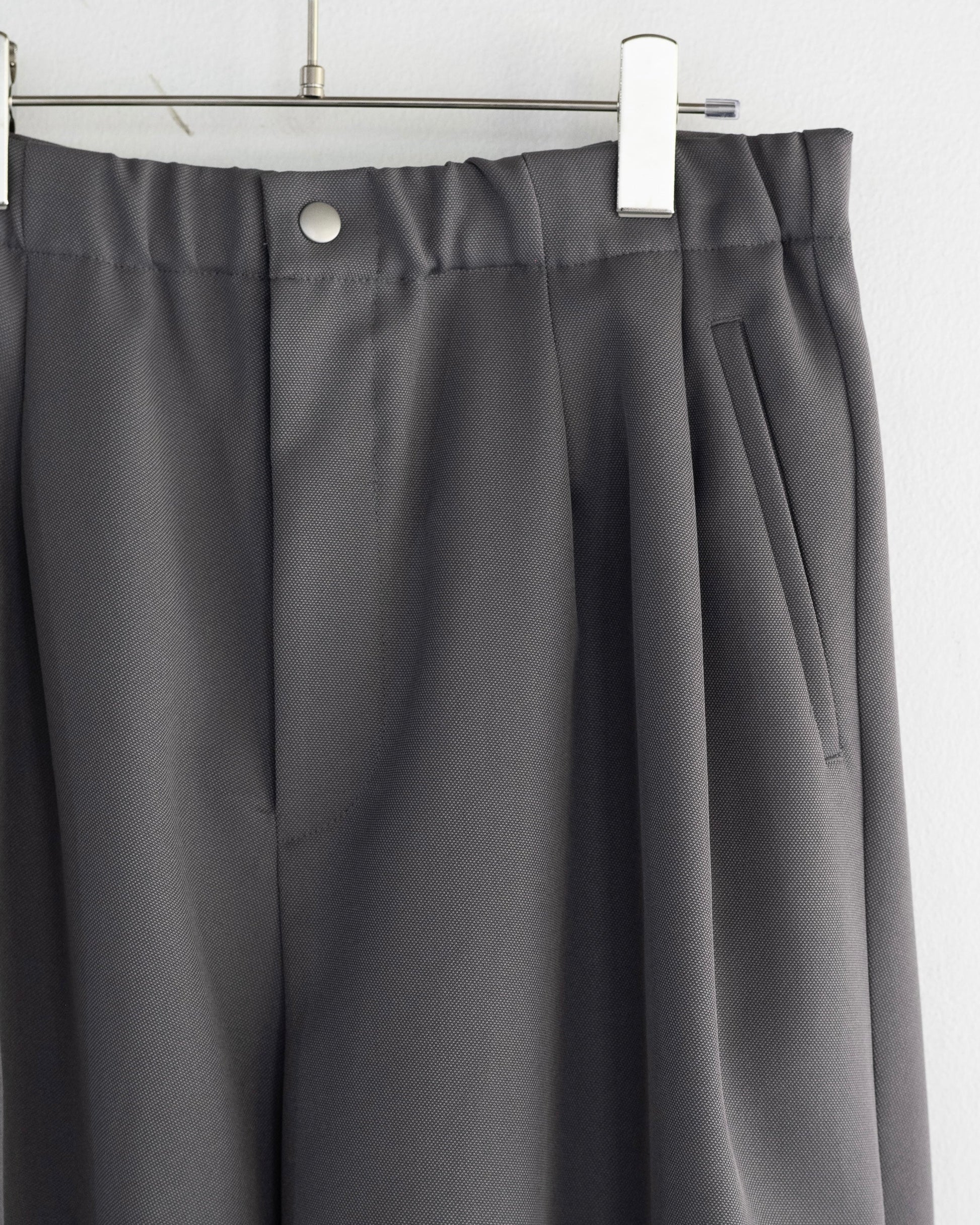 独特な表面感の高密度ポリエステル素材を使用したタックワイドパンツ。計算された前後腰回りのタックとニータックにより、膝から下のボリューム感と綺麗なドレープが出るように製作。