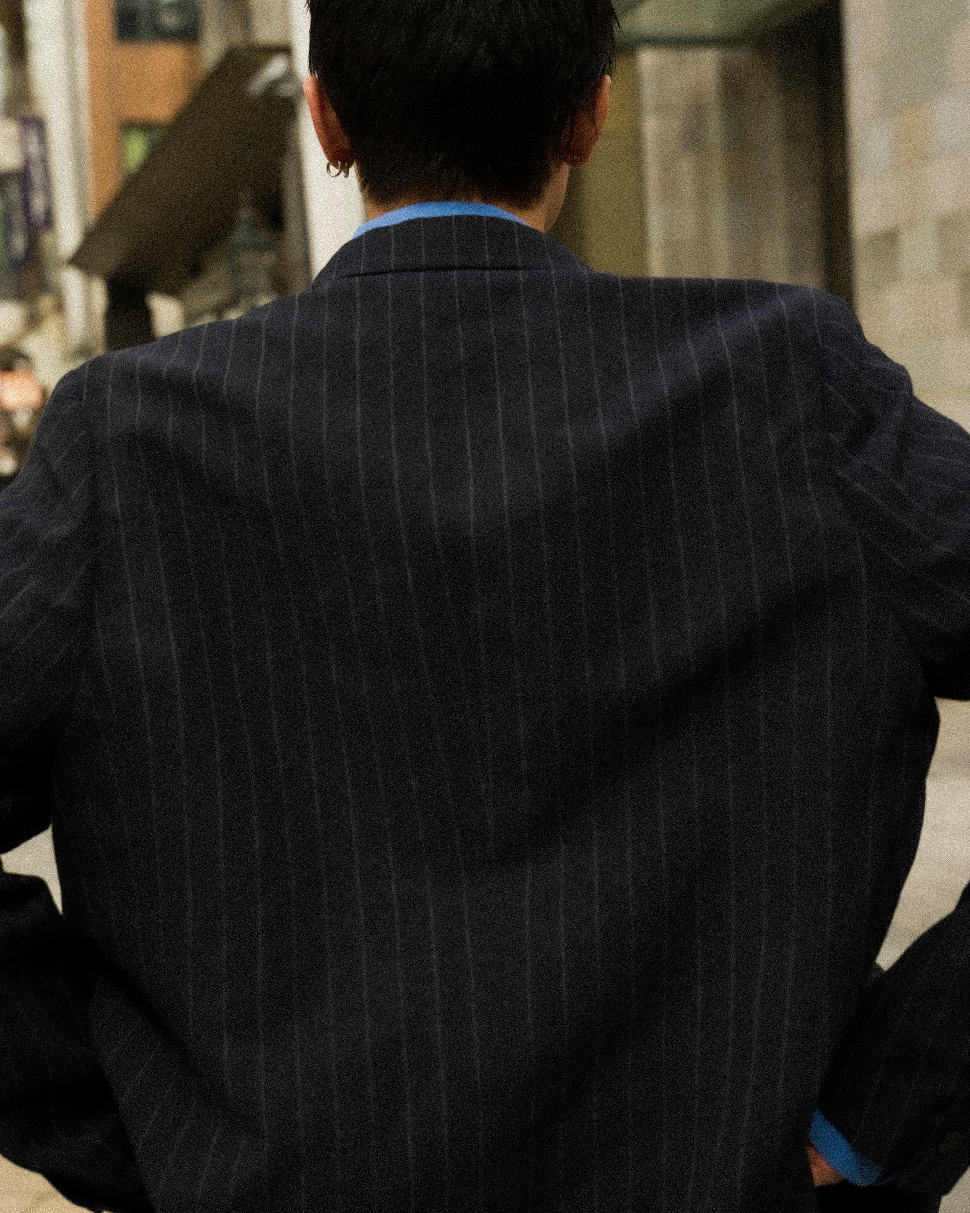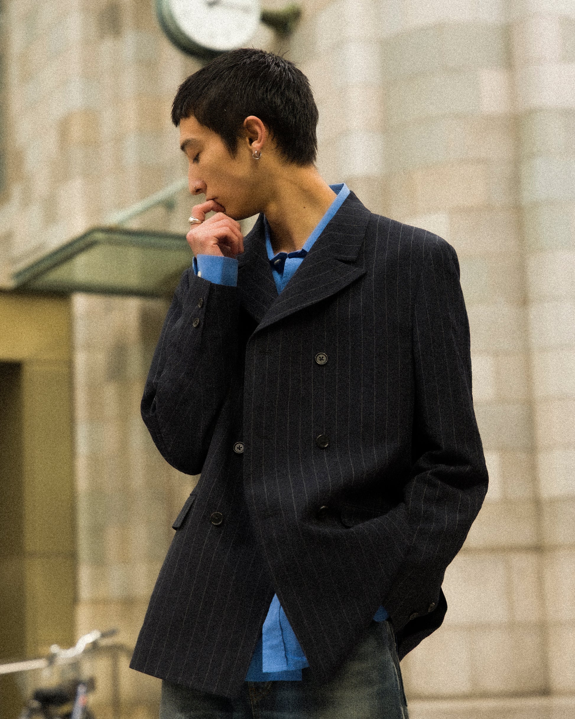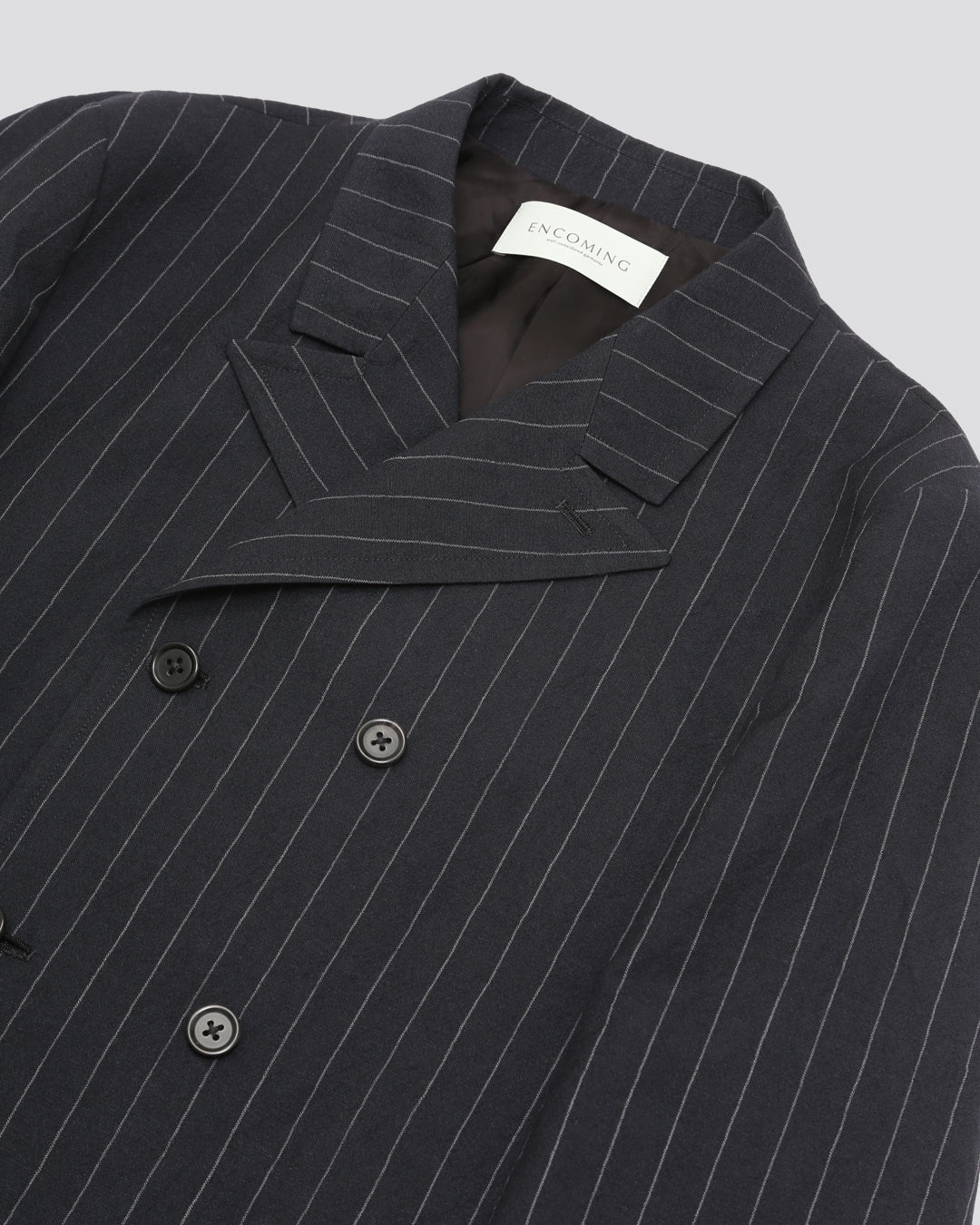 ENCOMINGのブランドアイデンティティーであるセミテーラードジャケット。90年代のクラシックさを基に胸元を高く設定し、ラペルは小ぶりの6つボタンのダブル仕様。前見頃には大きめなフラップポケット、全体ステッチ部分は太番手をを使用し、ワーク的な解釈を採用。バックにはサイズベントを施し、袖周りは本開き仕様になっている。当時の画家が汚れながらも、上から羽織って適当に外に出て行く、そのようなラフさをイメージしながら製作。本体で使用される生地は、清涼感のあるウールとリネンを組み合わせました。