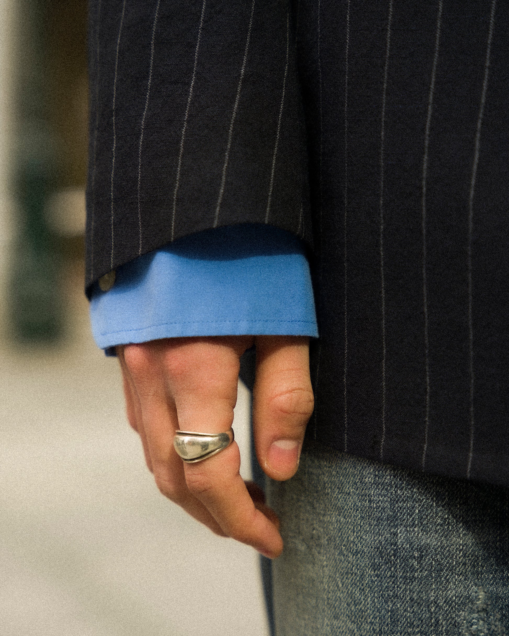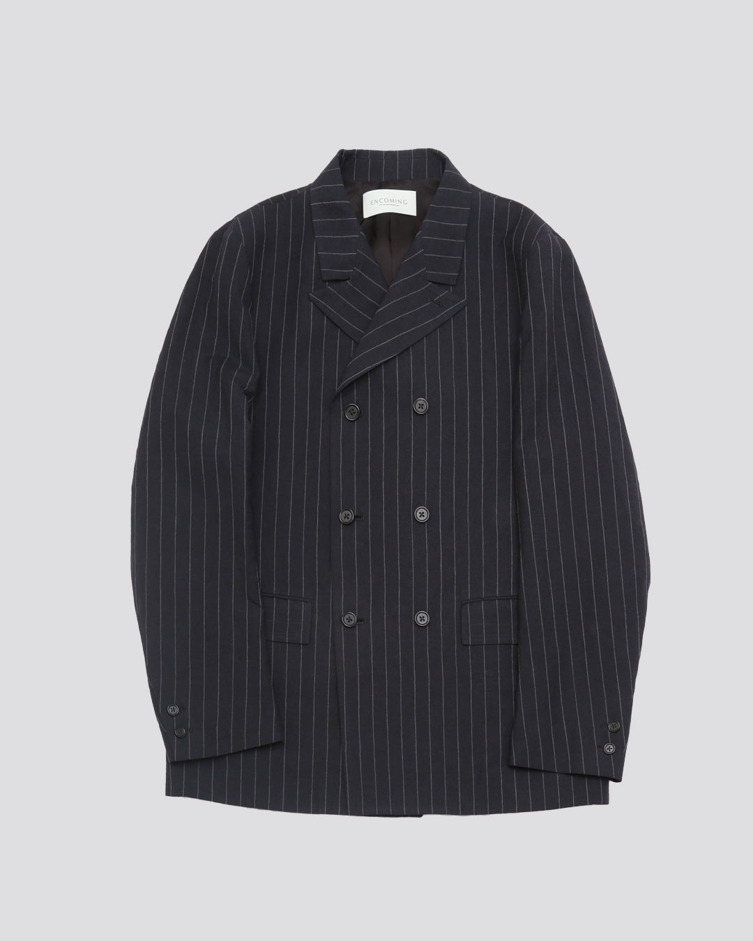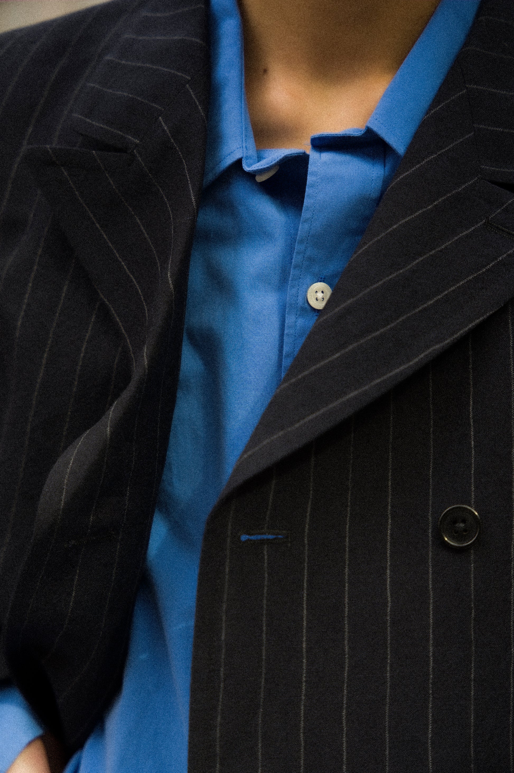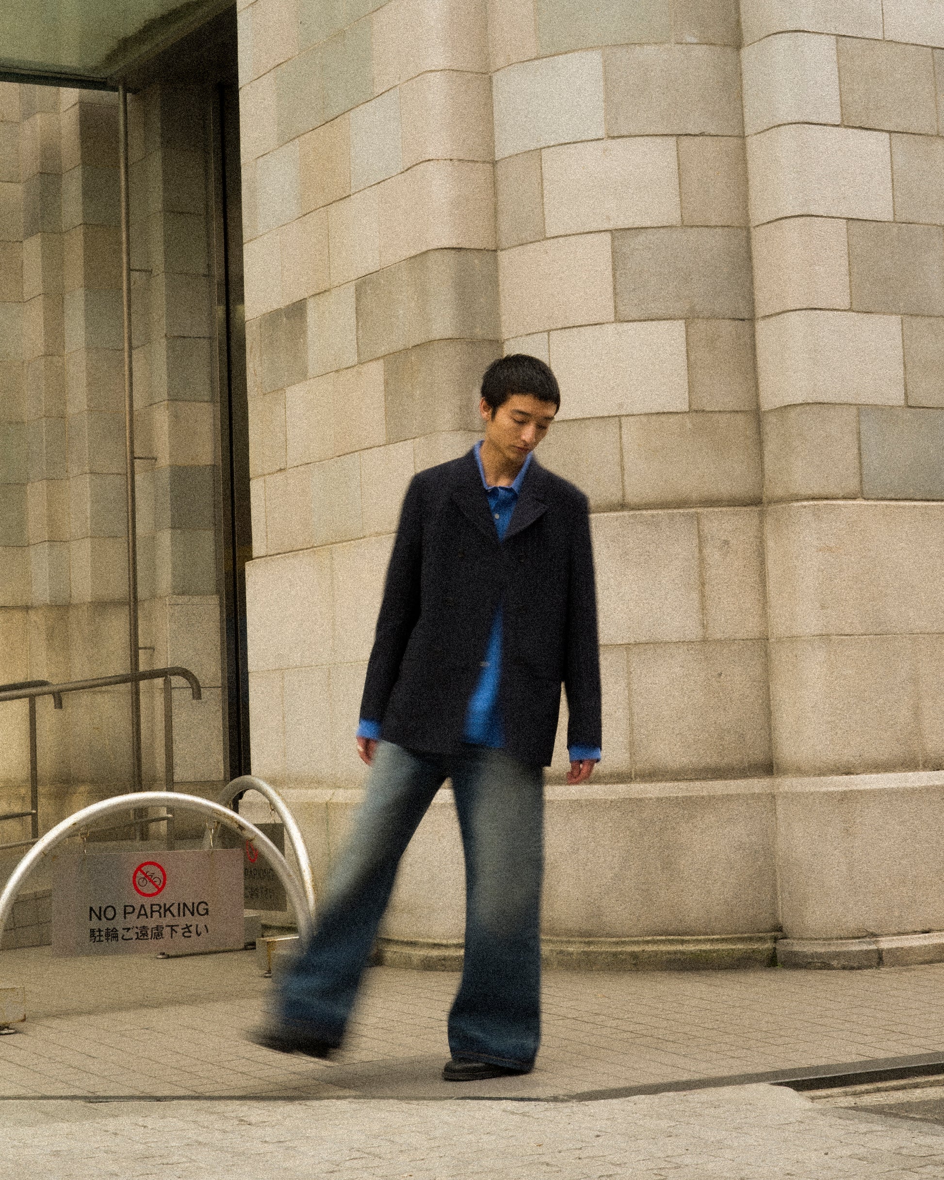 ENCOMINGのブランドアイデンティティーであるセミテーラードジャケット。90年代のクラシックさを基に胸元を高く設定し、ラペルは小ぶりの6つボタンのダブル仕様。前見頃には大きめなフラップポケット、全体ステッチ部分は太番手をを使用し、ワーク的な解釈を採用。バックにはサイズベントを施し、袖周りは本開き仕様になっている。当時の画家が汚れながらも、上から羽織って適当に外に出て行く、そのようなラフさをイメージしながら製作。本体で使用される生地は、清涼感のあるウールとリネンを組み合わせました。
